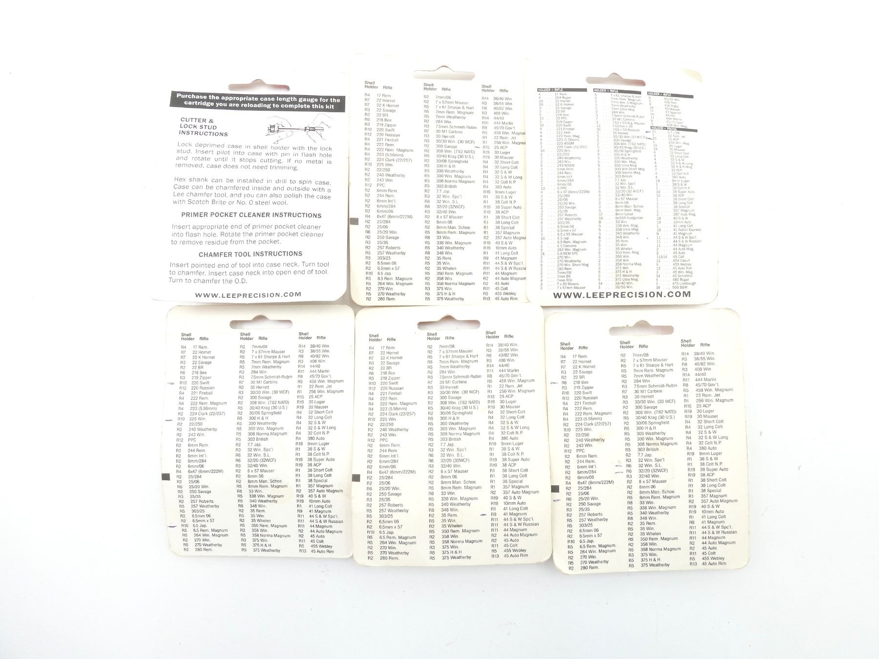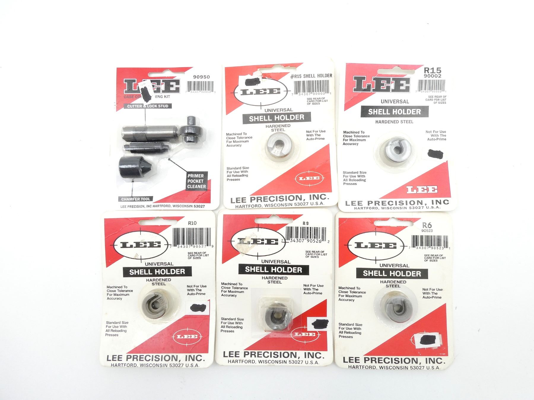 LOT INCLUDES; (5) SHELL HOLDERS, #R6, #R9, #R10, #R15, #R15, ALL NEW OLD STOCK & (1) CASE CONDITIONING KIT COMES WITH CUTTER / LOCK STUD, PRIMER POCKET CLEANER, CHAMFER TOOL, NEW OLD STOCK. SEE PHOTOS.
