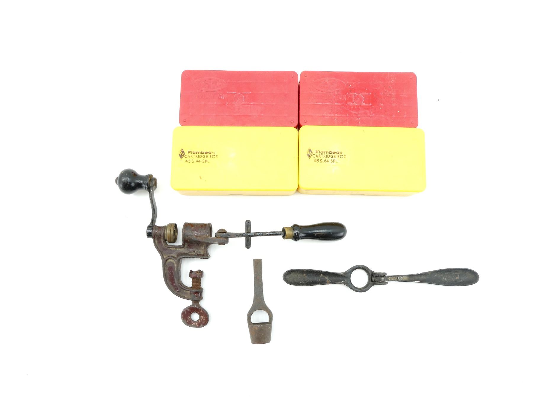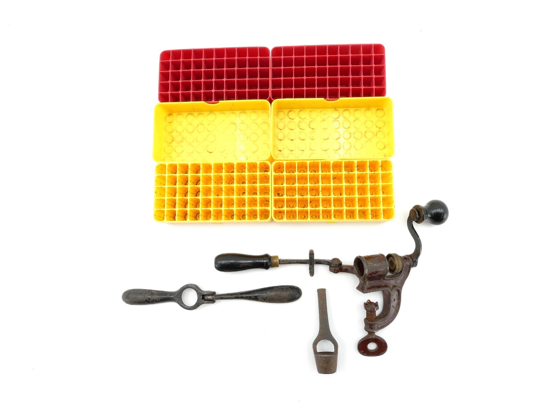 LOT INCLUDES; (1) 12 G. HAND RELOADING TOOL, (1) 12 G. HAND PRIMING TOOL, (2) YELLOW PLASTIC FLAMBEAU PISTOL AMMO CONTAINERS, HOLDS 50-RNDS, FITS .45 & .44 SPL, (2) RED PLASTIC CIL AMMO CONTAINERS, HOLDS 50-RNDS, ETC. SEE PHOTOS.
