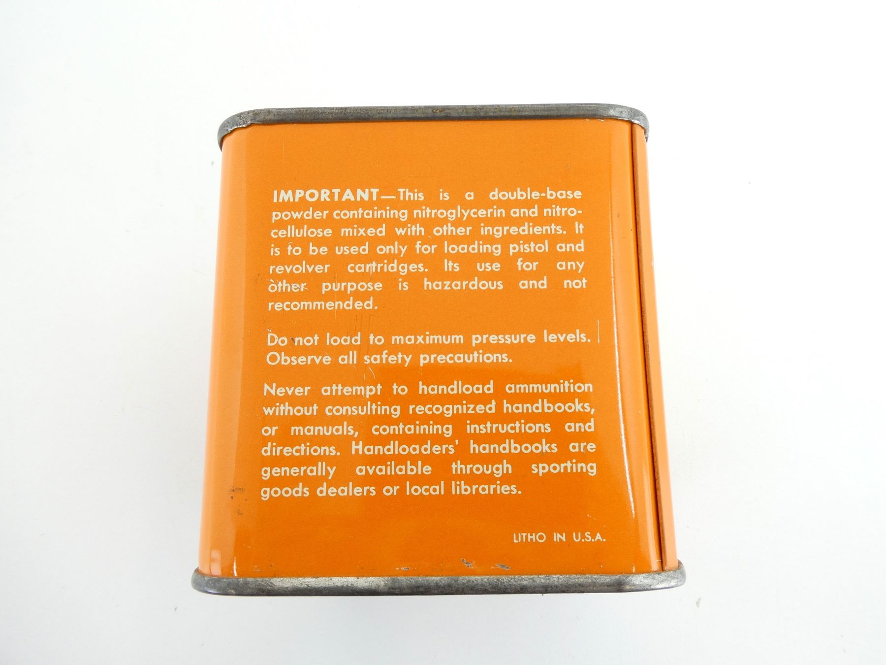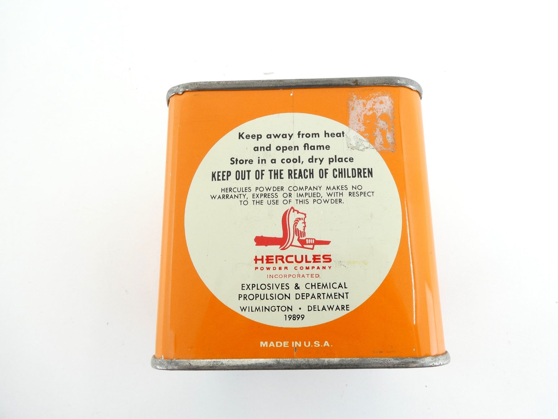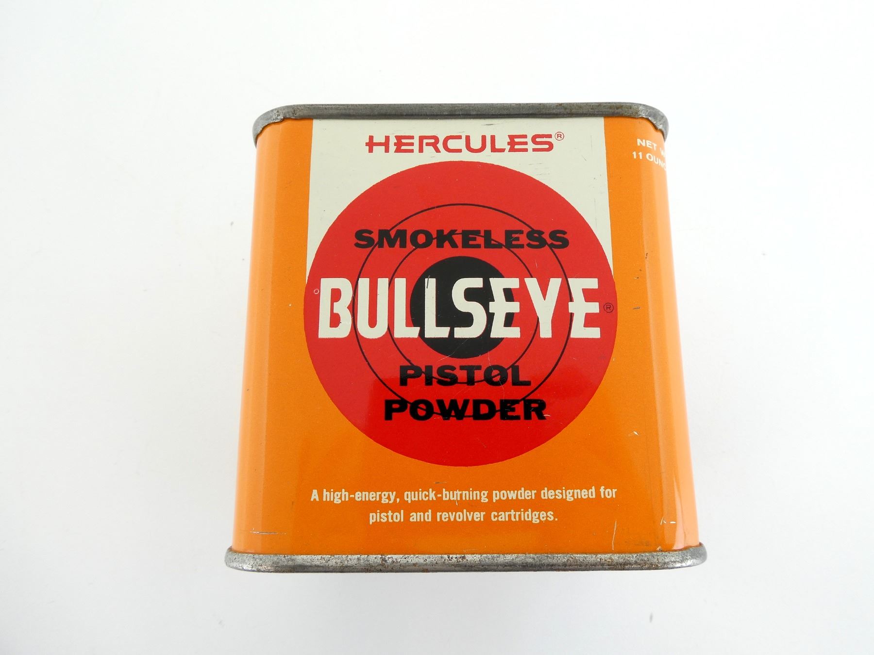 (1) EMPTY ORANGE PAINTED POWDER TIN, FRONT LABEL MARKED: "HERCULES, SMOKELESS BULLSEYE PISTOL POWDER", VARIOUS OTHER MARKINGS, APPROX. 3 5/8" X 3 5/8" X 4". SEE PHOTOS.