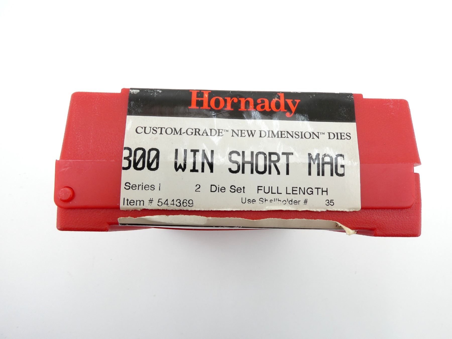 LOT INCLUDES; (1) HORNADY .300 WSM 2-PIECE RELOADING DIES & (1) EMPTY RELOADING DIE CONTAINER. SEE PHOTOS.