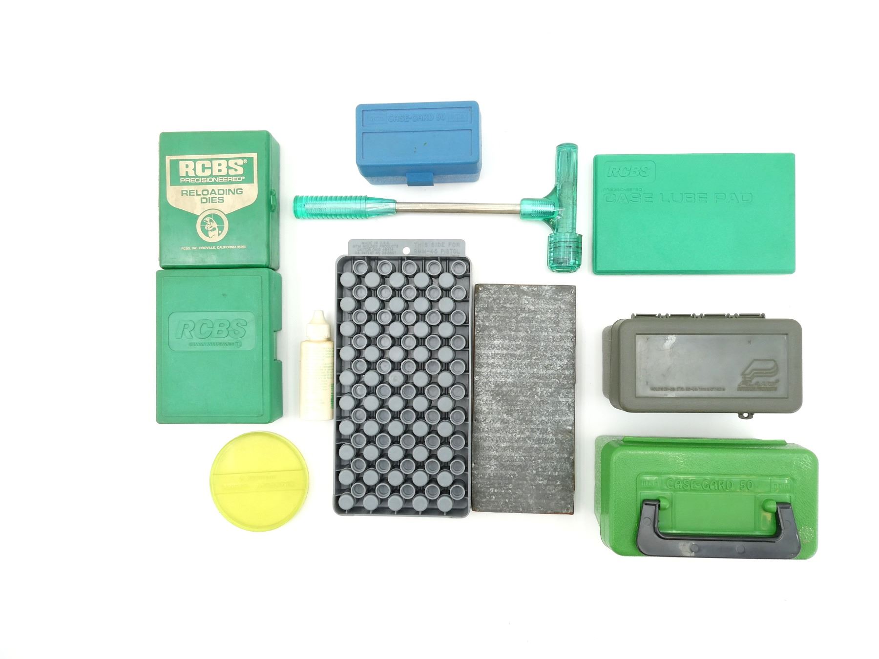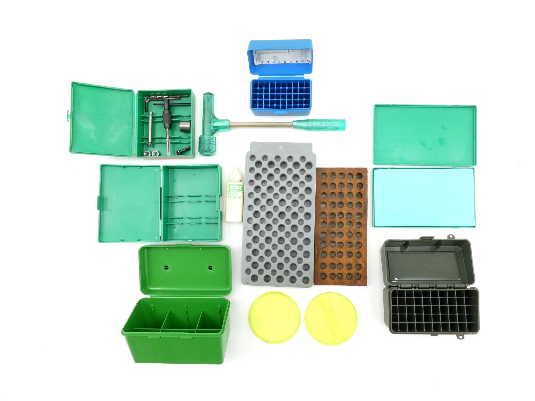 LOT INCLUDES; (3) ASSORTED PLASTIC RIFLE AMMO CONTAINERS, MTM / PLANO MFG'S, FITS VARIOUS CALIBERS, (1) RCBS EMPTY RELOADING DIE CONTAINER, (1) RCBS CASE LUBE PAD, (1) MTM CASE GARD TRI-UNIVERSAL LOADING TRAY, HOLDS 150 ROUNDS, BOTH PISTOL / RIFLES CALIBERS, (1) WOODEN LOADING TRAY, HOLDS 55-RNDS, FITS VARIOUS CALIBERS , (1) QUINETICS CORP. KINETIC BULLET PULLER, (1) RCBS STUCK CASE REMOVER KIT, KIT MAY NOT BE COMPLETE, ETC. SEE PHOTOS.