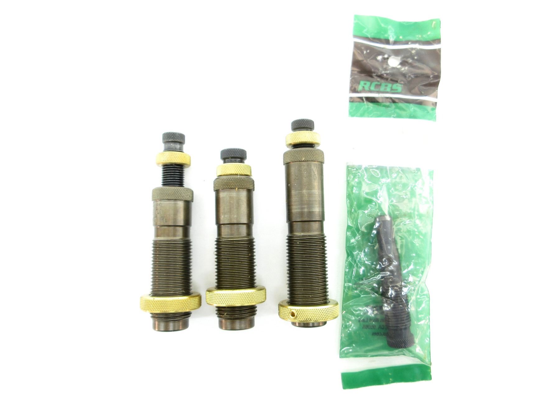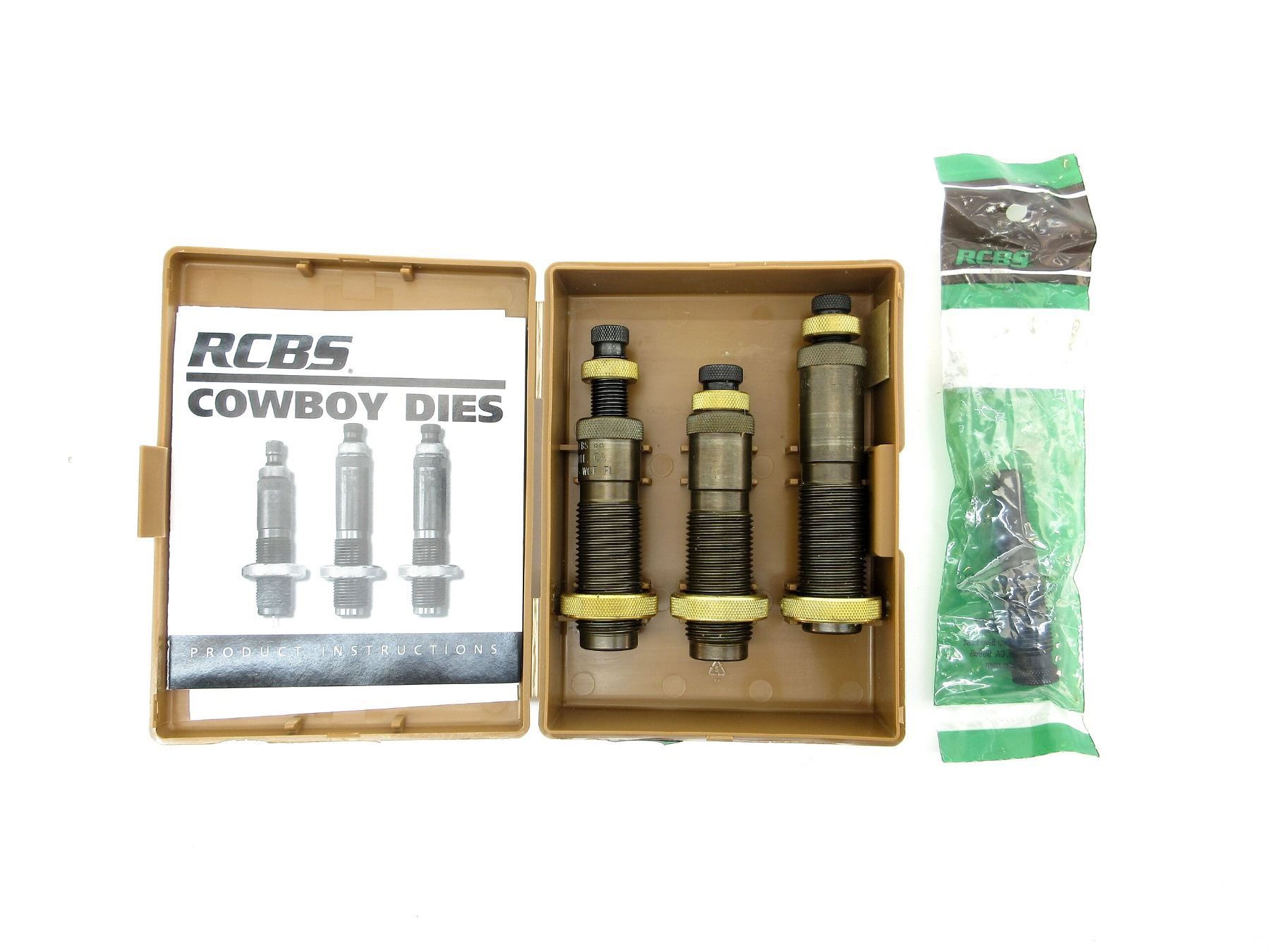 LOT INCLUDES; (1) 3-PIECE RELOADING DIES WITH (1) RCBS 379 COWBOY EXPANDER PLUG IN SEALED PACKAGING. SEE PHOTOS.