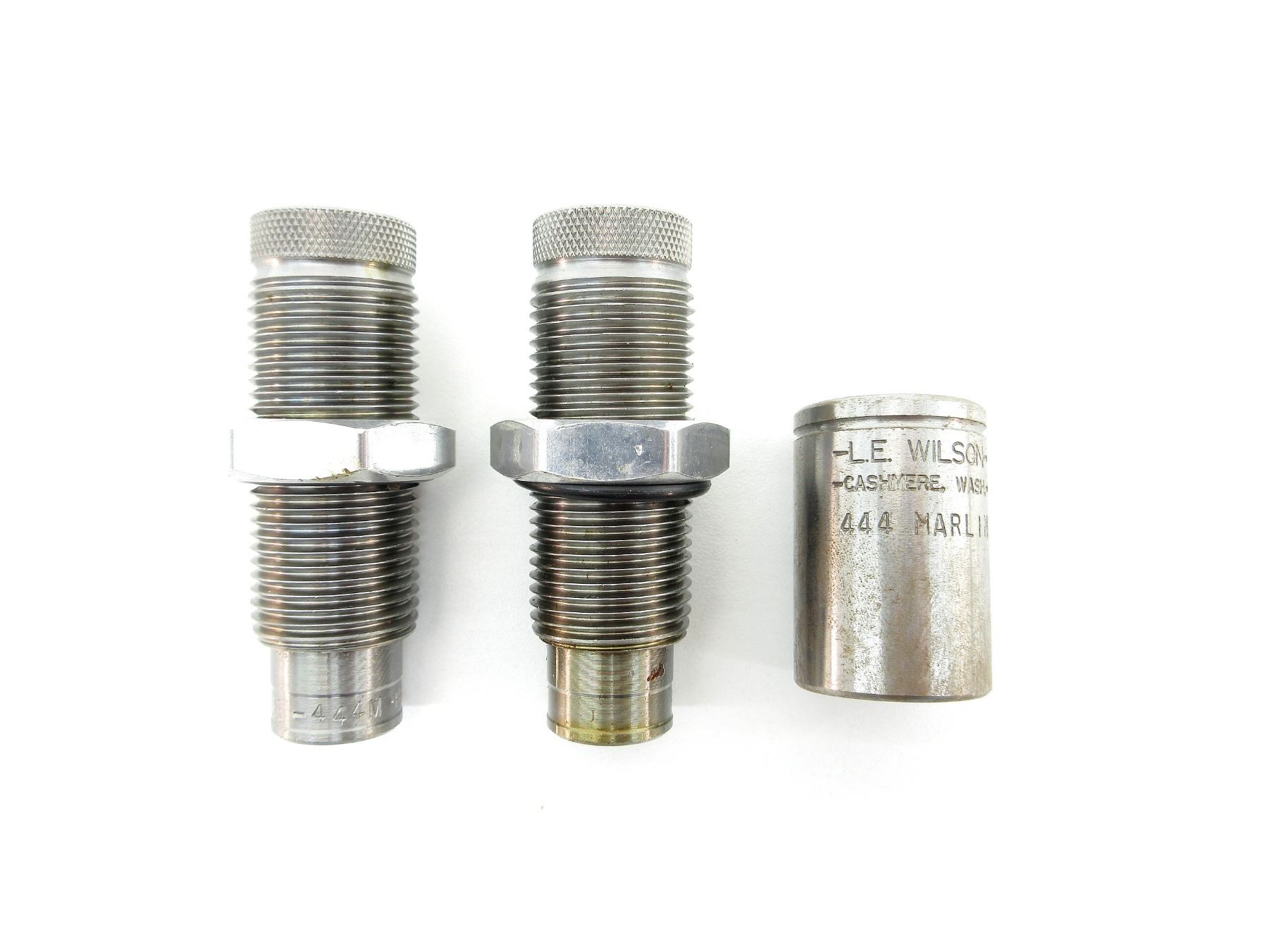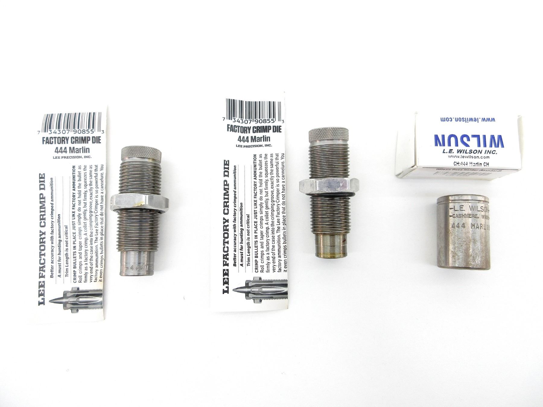 LOT INCLUDES; (2) LEE .444 MARLIN FACTORY CRIMP RELOADING DIES & (1) L.E. WILSON .444 MARLIN CASE HOLDER. SEE PHOTOS.