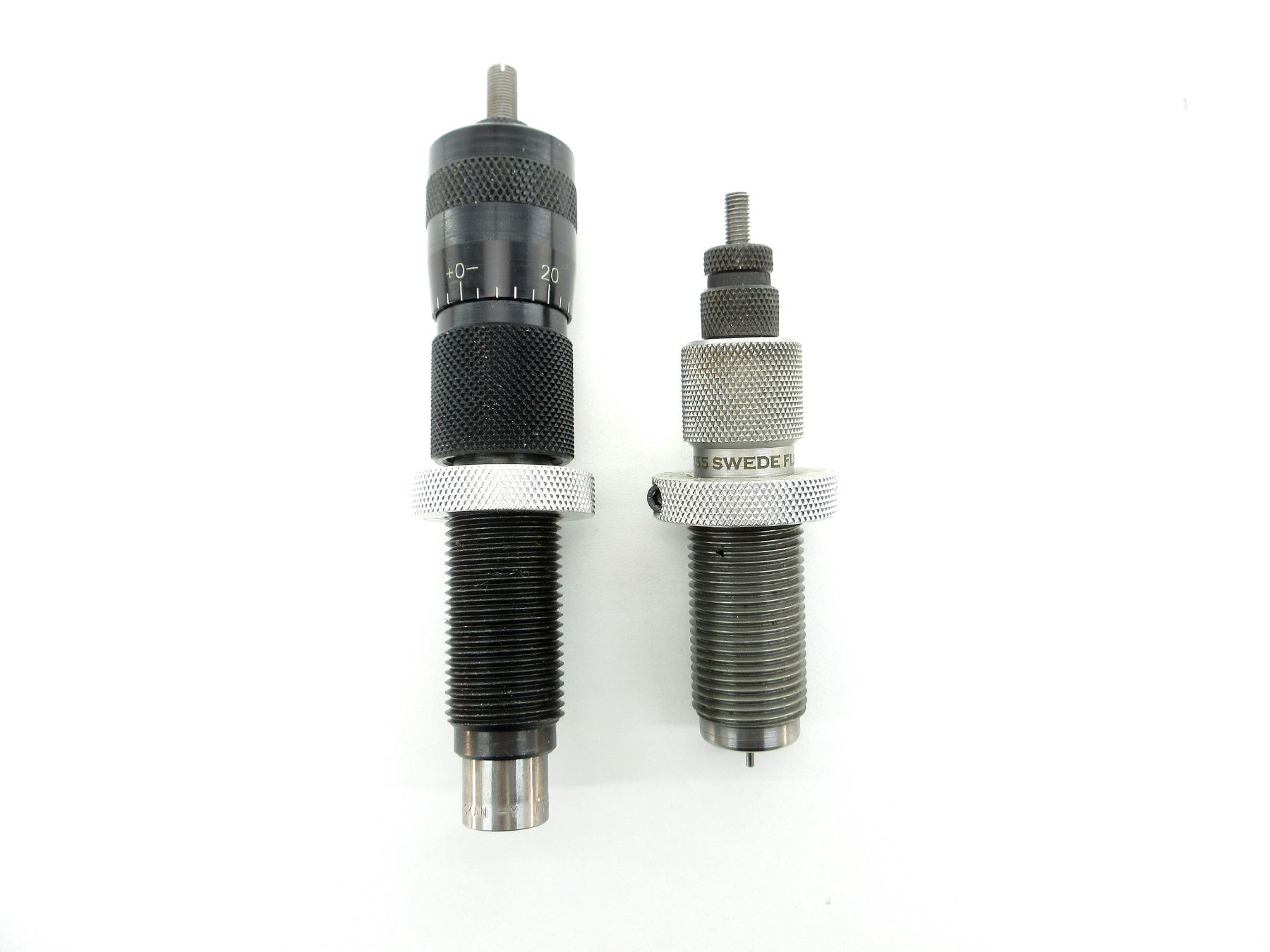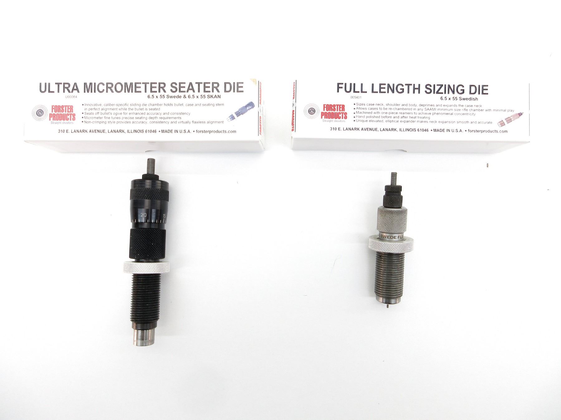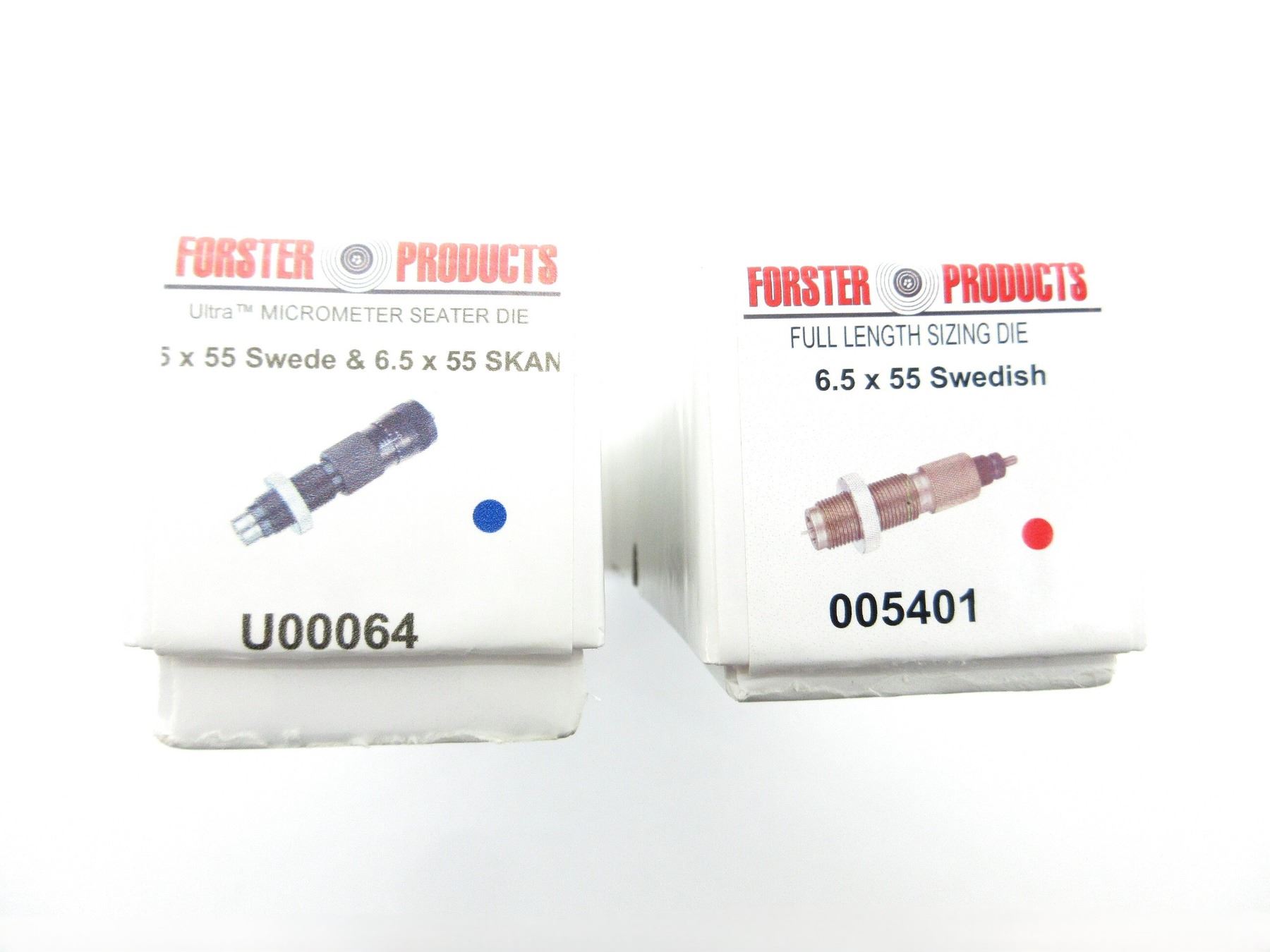 LOT INCLUDES; (1) FORSTER 6.5X55MM SWEDISH FL SIZING RELOADING DIE & (1) FORSTER 6.5X55MM SWEDISH / 6.5X55MM SKAN ULTRA MICROMETER SEATER RELOADING DIE. SEE PHOTOS.