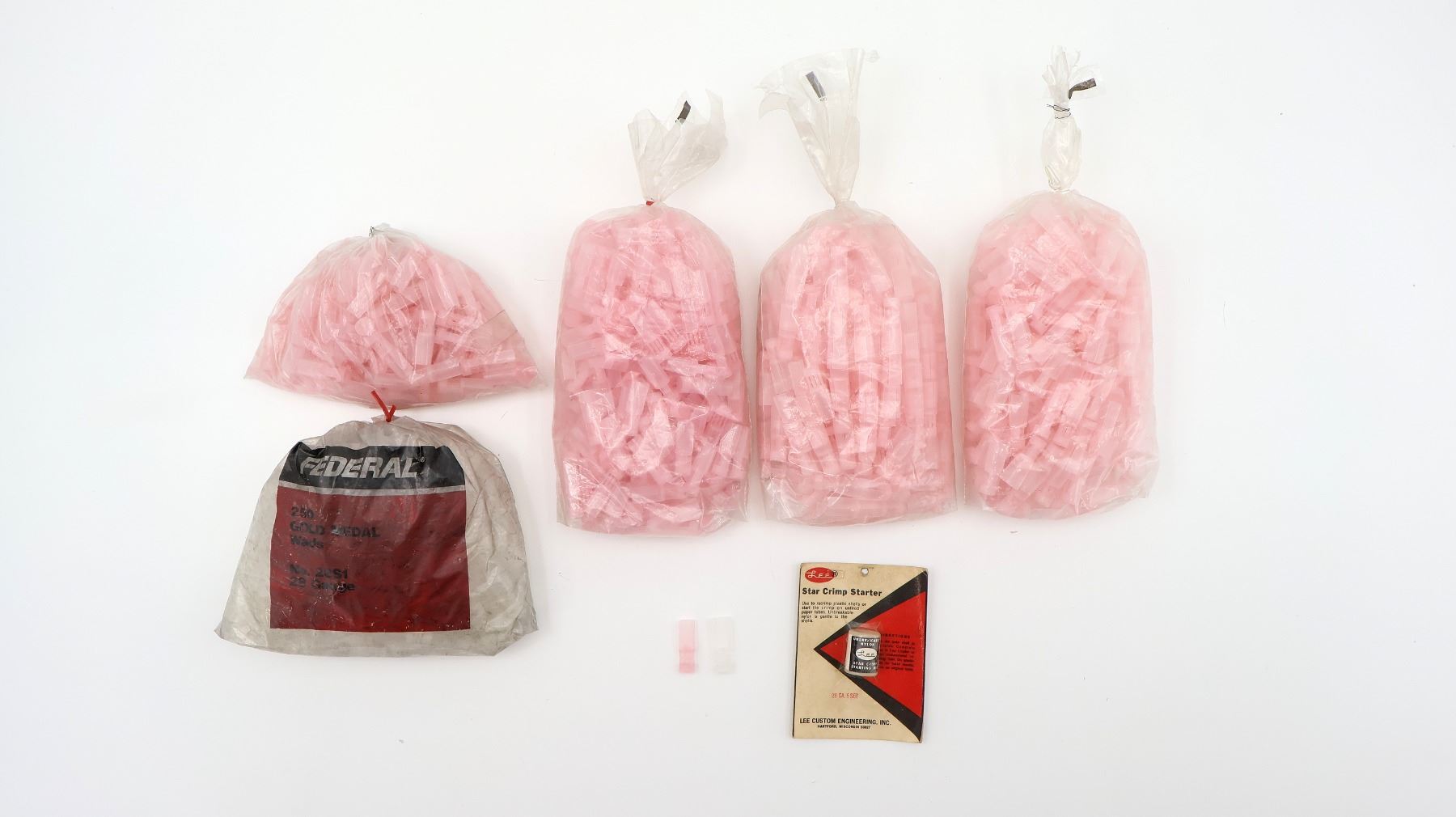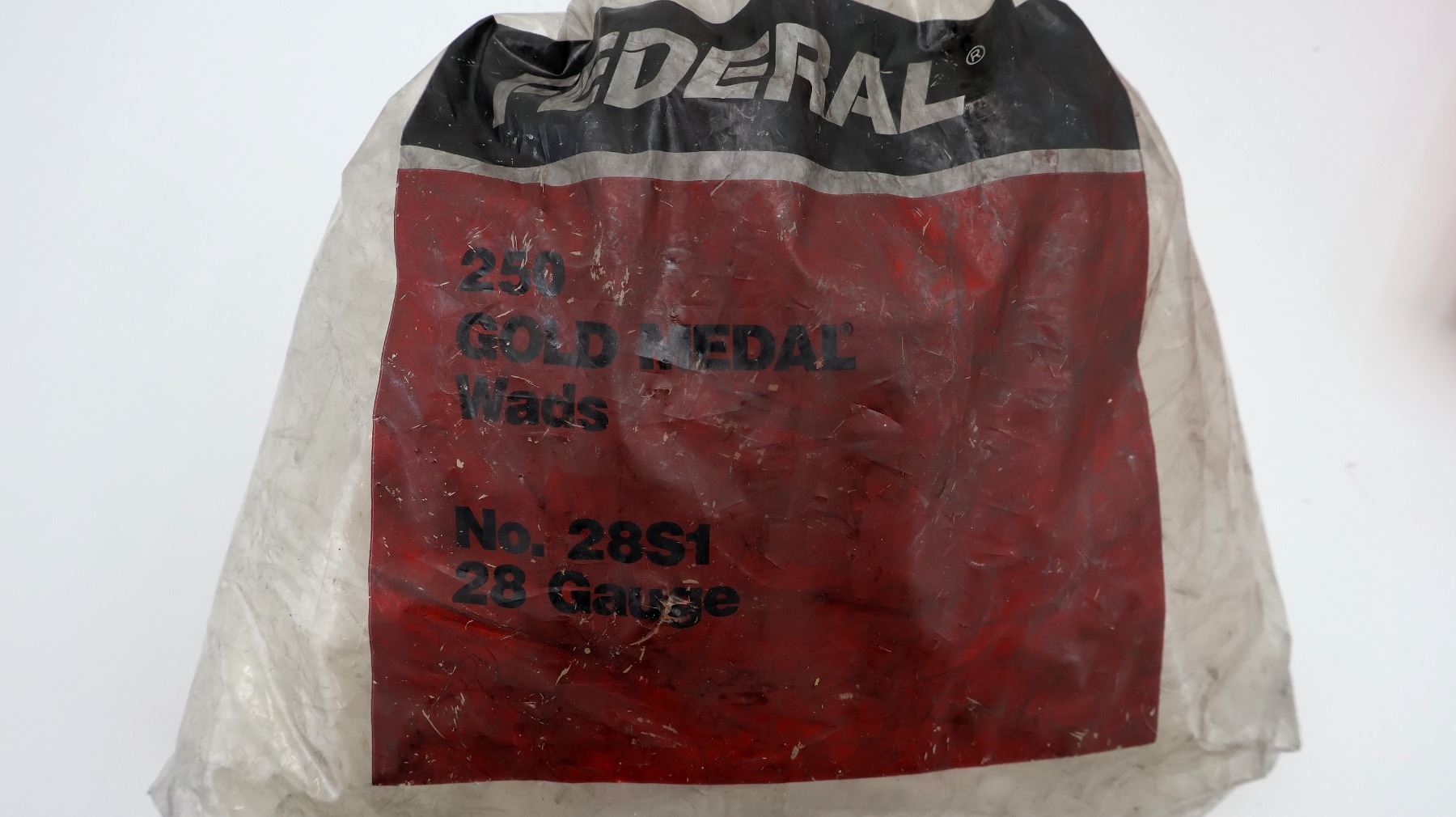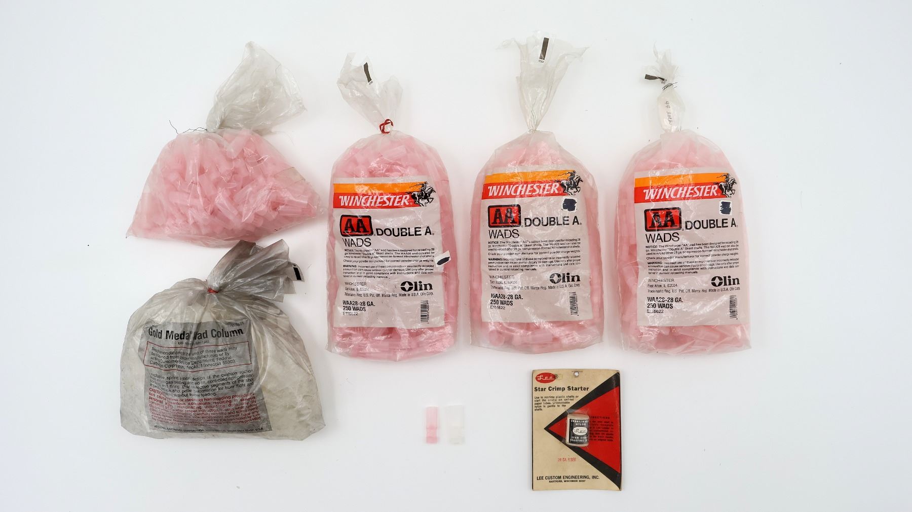 LOT INCLUDES; APPROX. (600) WINCHESTER WAA 28 GA. PLASTIC WADS, VARIOUS MARKINGS ON BAGS, APPROX. (125) FEDERAL 28 GA. GOLD MEDAL PLASTIC WADS, VARIOUS MARKINGS ON BAG & (1) LEE 28 GA. STAR CRIMP STARTER. SEE PHOTOS.