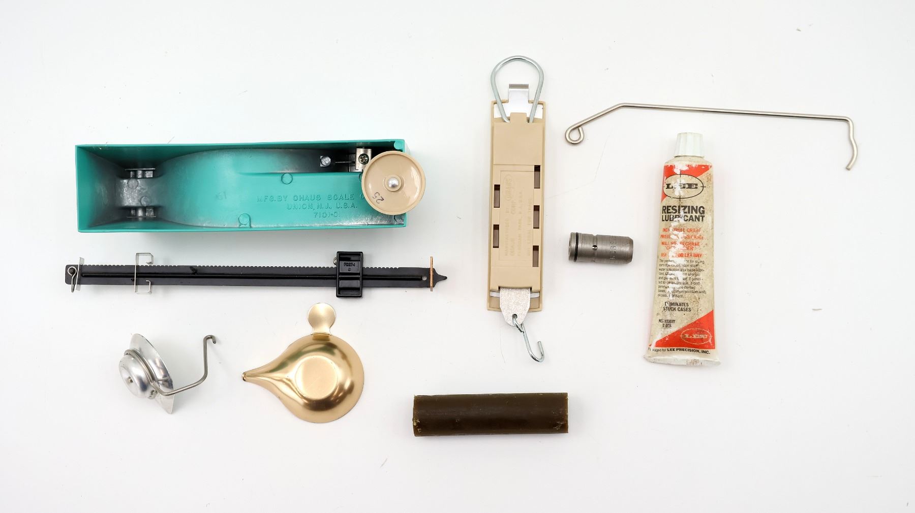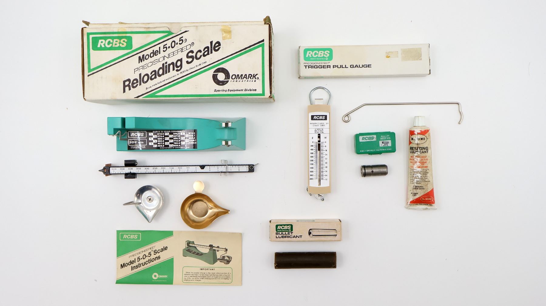LOT INCLUDES; (1) RCBS MODEL 5.0.5 RELOADING SCALE WITH ORIGINAL BOX, MAY REQUIRE ADJUSTMENTS AND/OR MAY NOT BE COMPLETE, (1) RCBS TRIGGER PULL GAUGE WITH ORIGINAL BOX, MAY REQUIRE ADJUSTMENTS AND/OR MAY NOT BE COMPLETE, (1) RCBS BULLET LUBE STICK, APPEARS NEW OLD STOCK, (1) RCBS .356 BULLET SIZER, ETC. SEE PHOTOS.