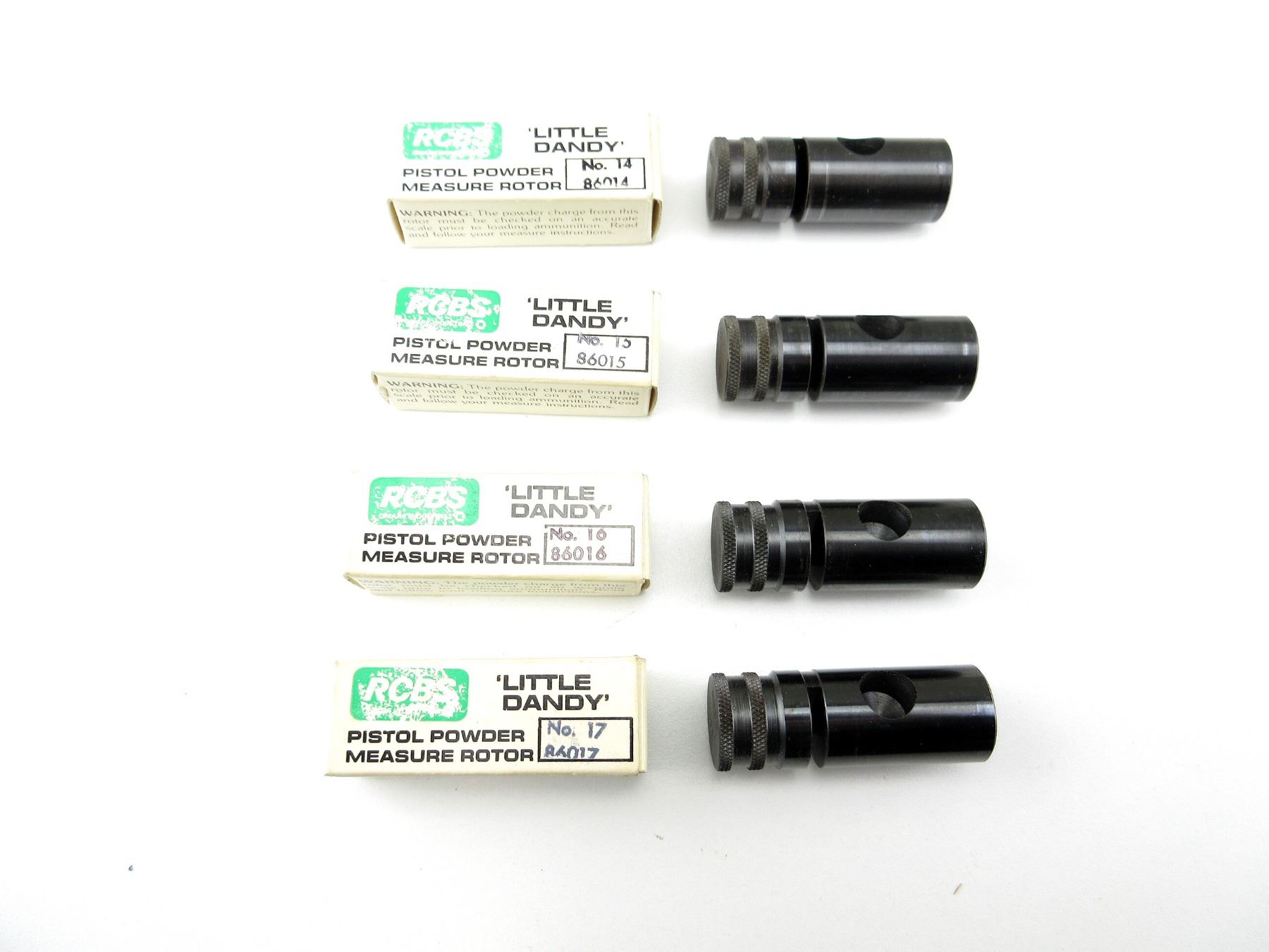 LOT INCLUDES; (4) "LITTLE DANDY" PISTOL POWDER MEASURE ROTORS, #14, #15, #16 & #17. SEE PHOTOS.