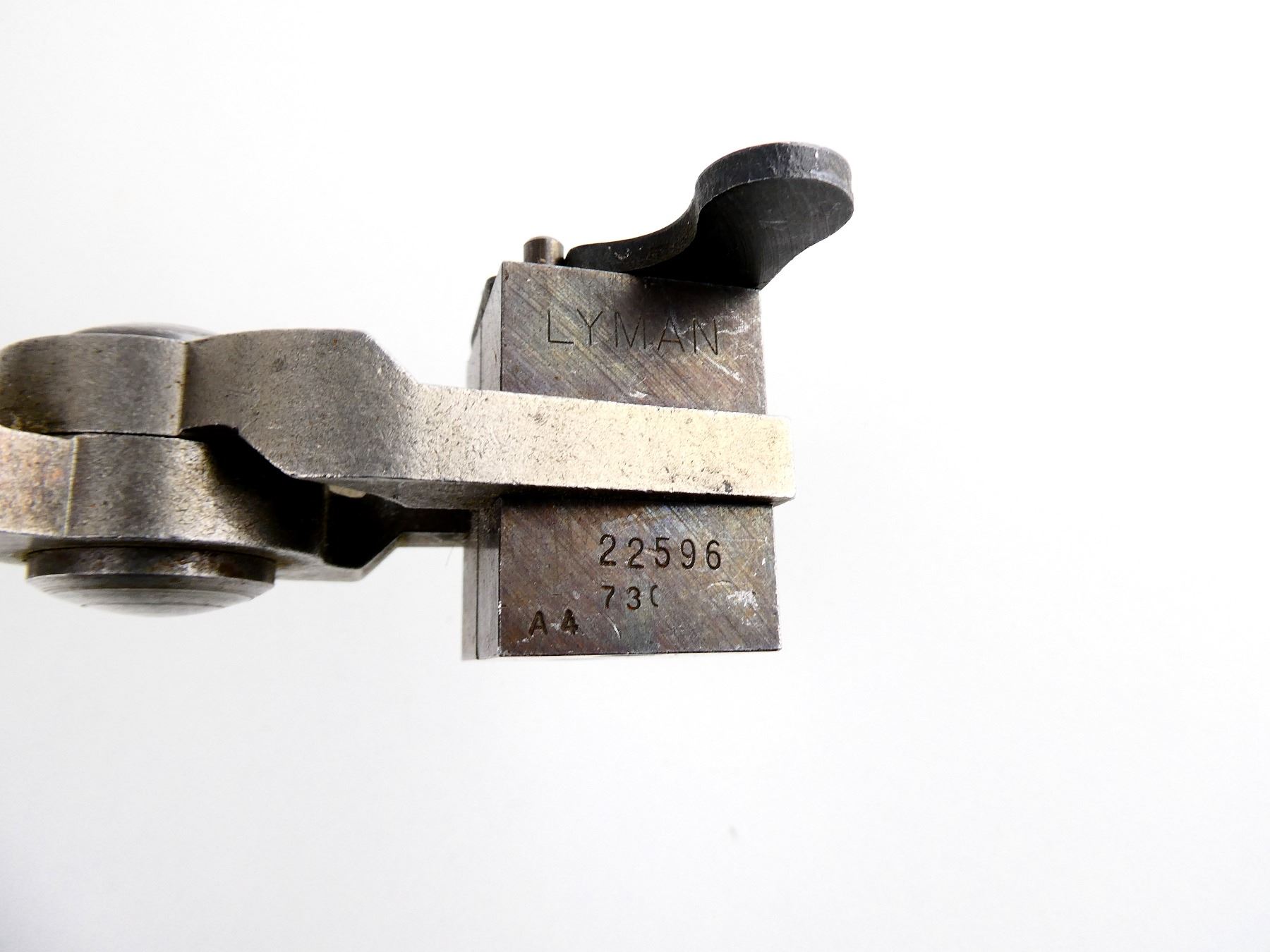 LOT INCLUDES; (1) APPROX. .22" DIA. SINGLE-CAVITY BULLET MOLD WITH WOOD HANDLES ATTACHED, MOLD MARKED: "LYMAN, 22596, 730, A4". SEE PHOTOS.