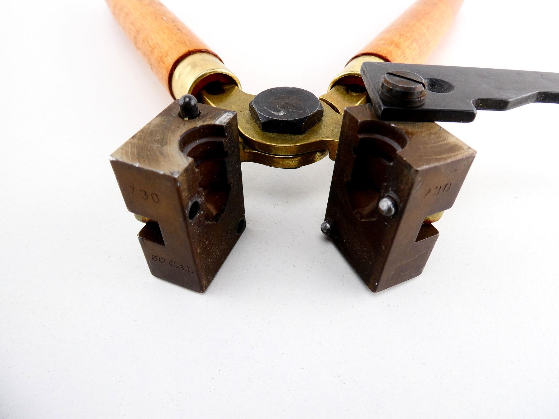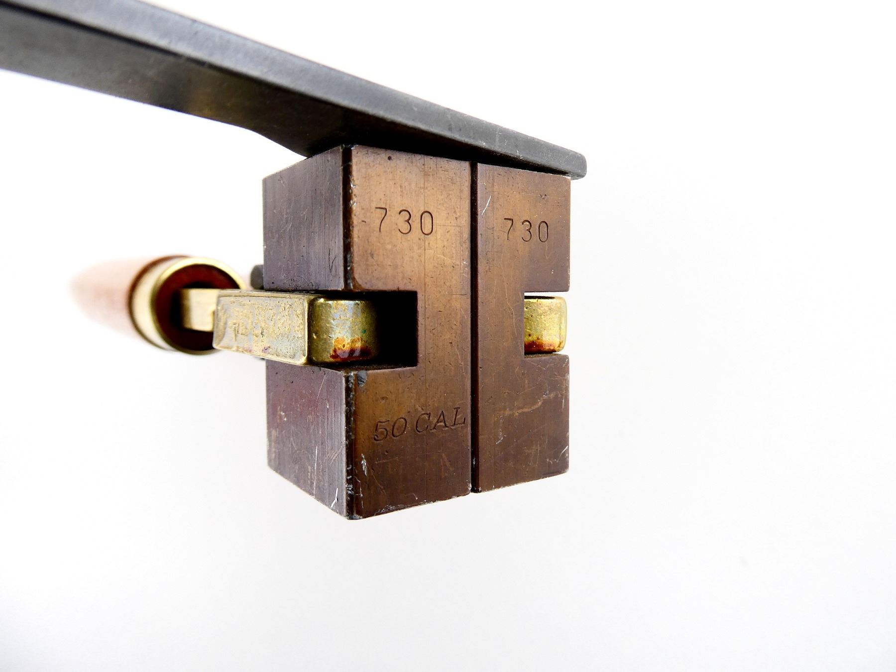 LOT INCLUDES; (1) .50 CAL. SINGLE-CAVITY BULLET MOLD WITH WOOD HANDLES ATTACHED, MOLD MARKED: "730, 50 CAL". SEE PHOTOS.