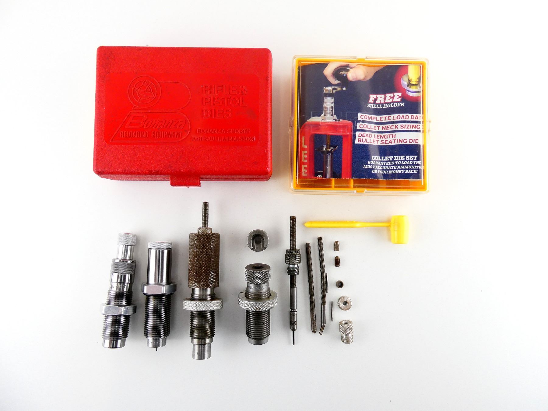 LOT INCLUDES; (1) BONANZA 7MM X 308 2-PIECE RELOADING DIES & (1) LEE 7MM / 08 REM. 2-PIECE RELOADING DIES WITH #2 SHELL HOLDER. SEE PHOTOS.