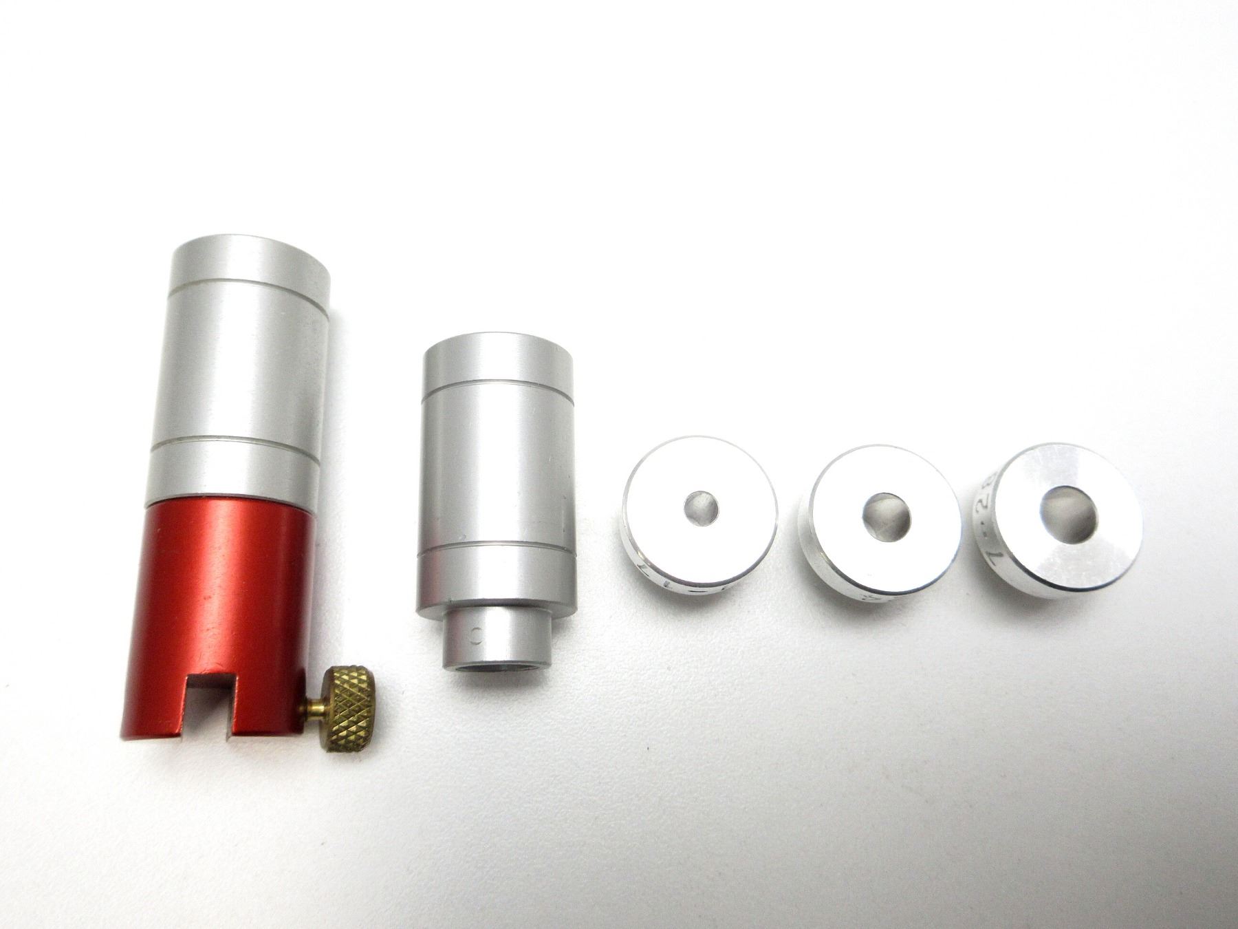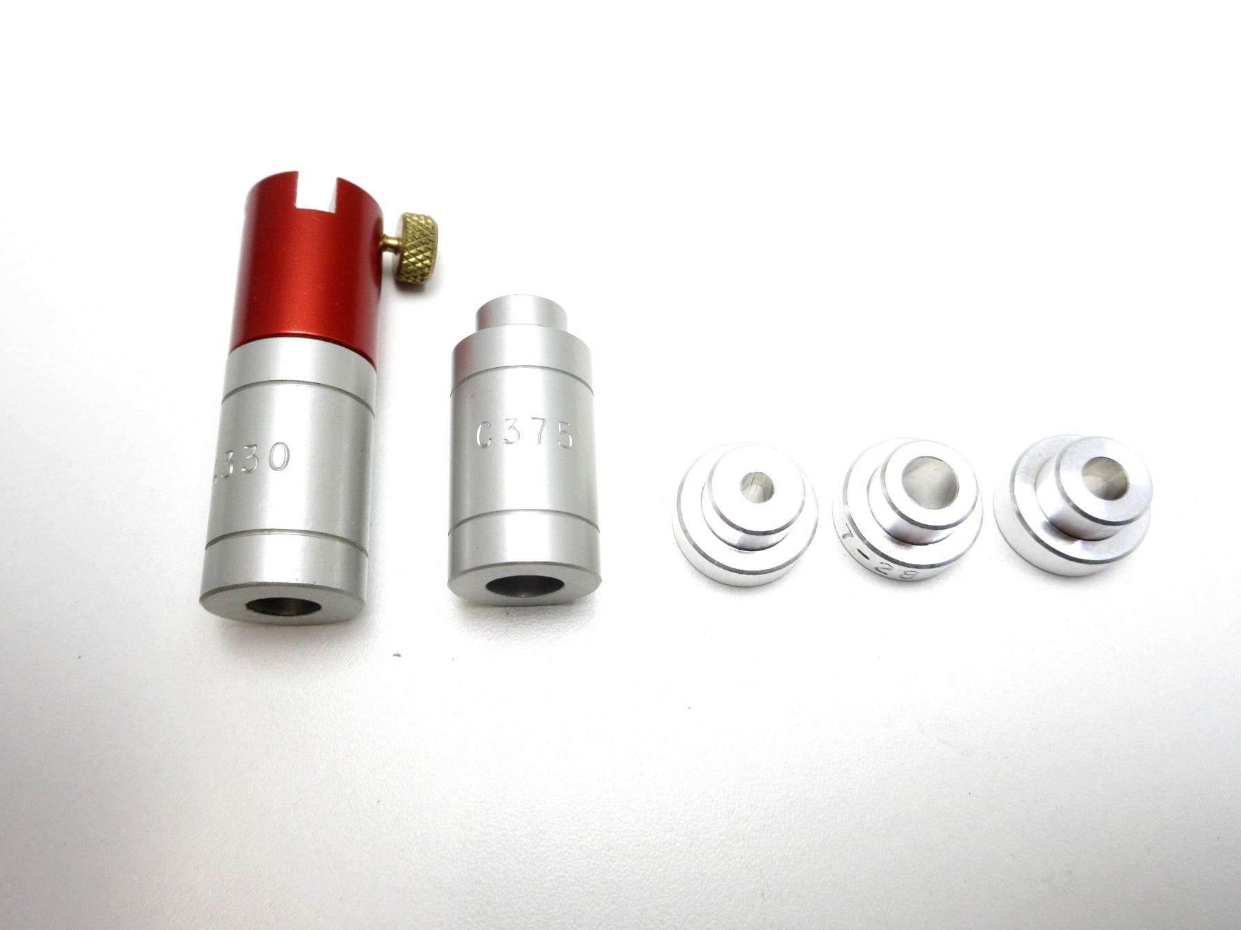 LOT INCLUDES; (1) LOCK-N-LOAD BULLET COMPARATOR BODY, (3) LOCK-N-LOAD BULLET COMPARATOR INSERTS, MARKED: "1-17", "3-24", "7-28" & (2) LOCK-N-LOAD HEAD SPACE GAUGE BUSHINGS, MARKED: "A330" & "C375". SEE PHOTOS.