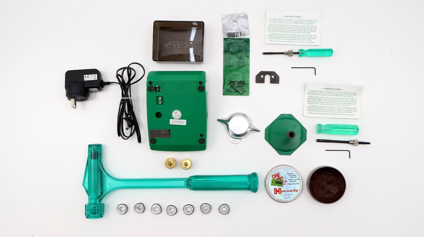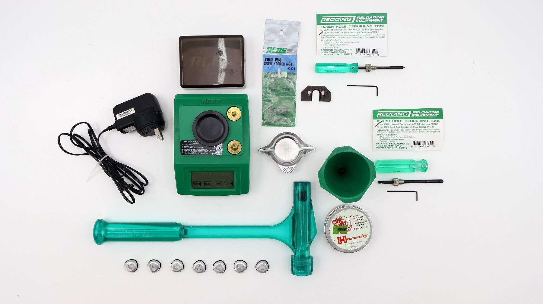 LOT INCLUDES; (1) RCBS ELECTRONIC SCALE, TESTED (WORKS), MAY NOT BE COMPLETE, (1) RCBS TRIM PRO SHELL HOLDER #3, (2) REDDING FLASH HOLE DEBURRING TOOLS, (1) RCBS .17 CAL. GREEN PLASTIC FUNNEL, (1) RCBS KINETIC BULLET PULLER WITH (7) BULLET PULLER COLLETS, ETC. SEE PHOTOS.