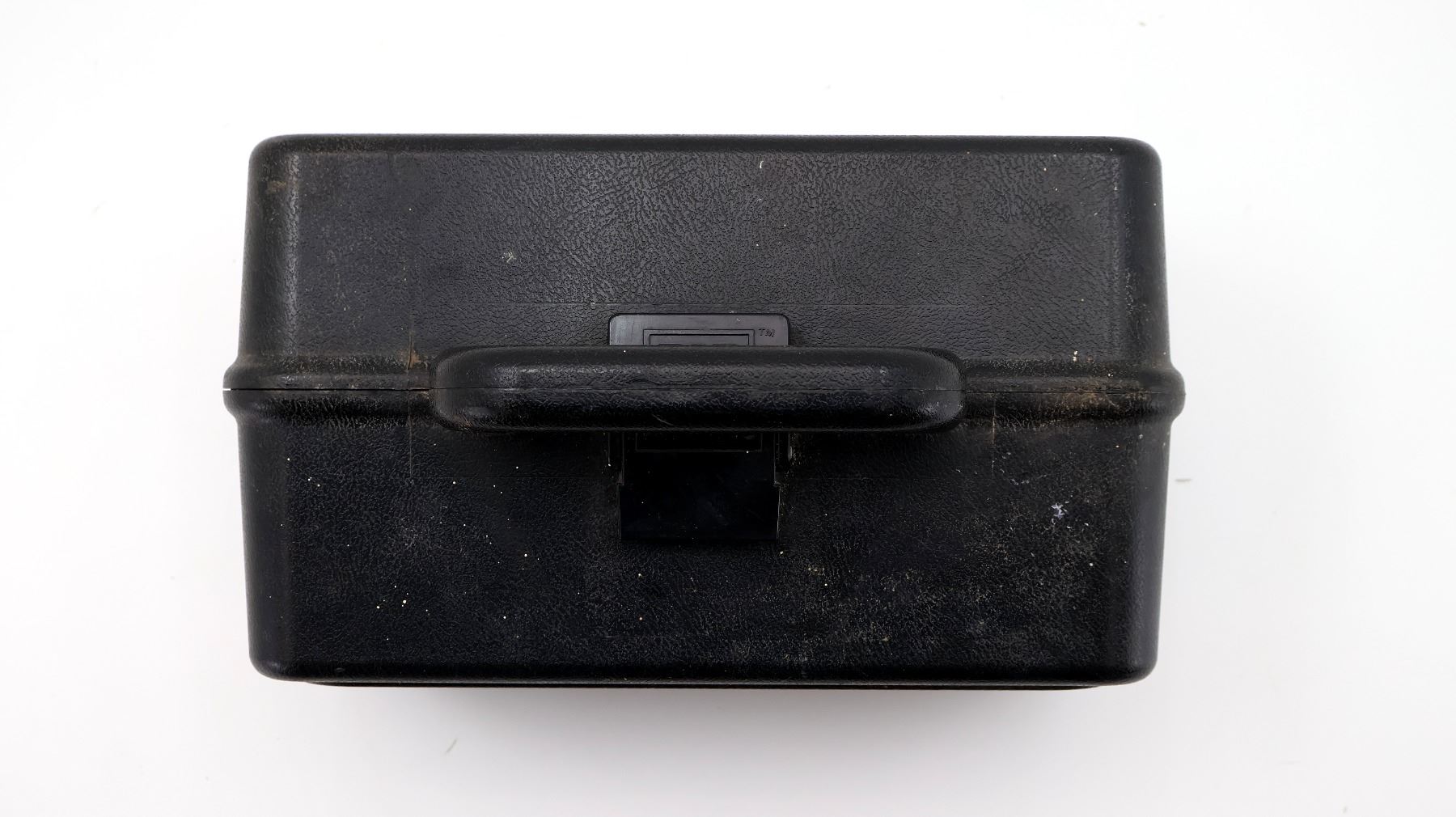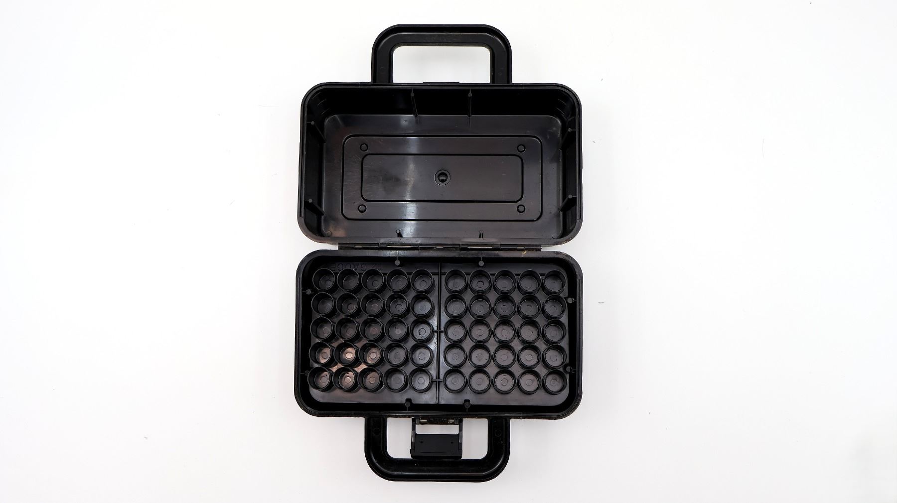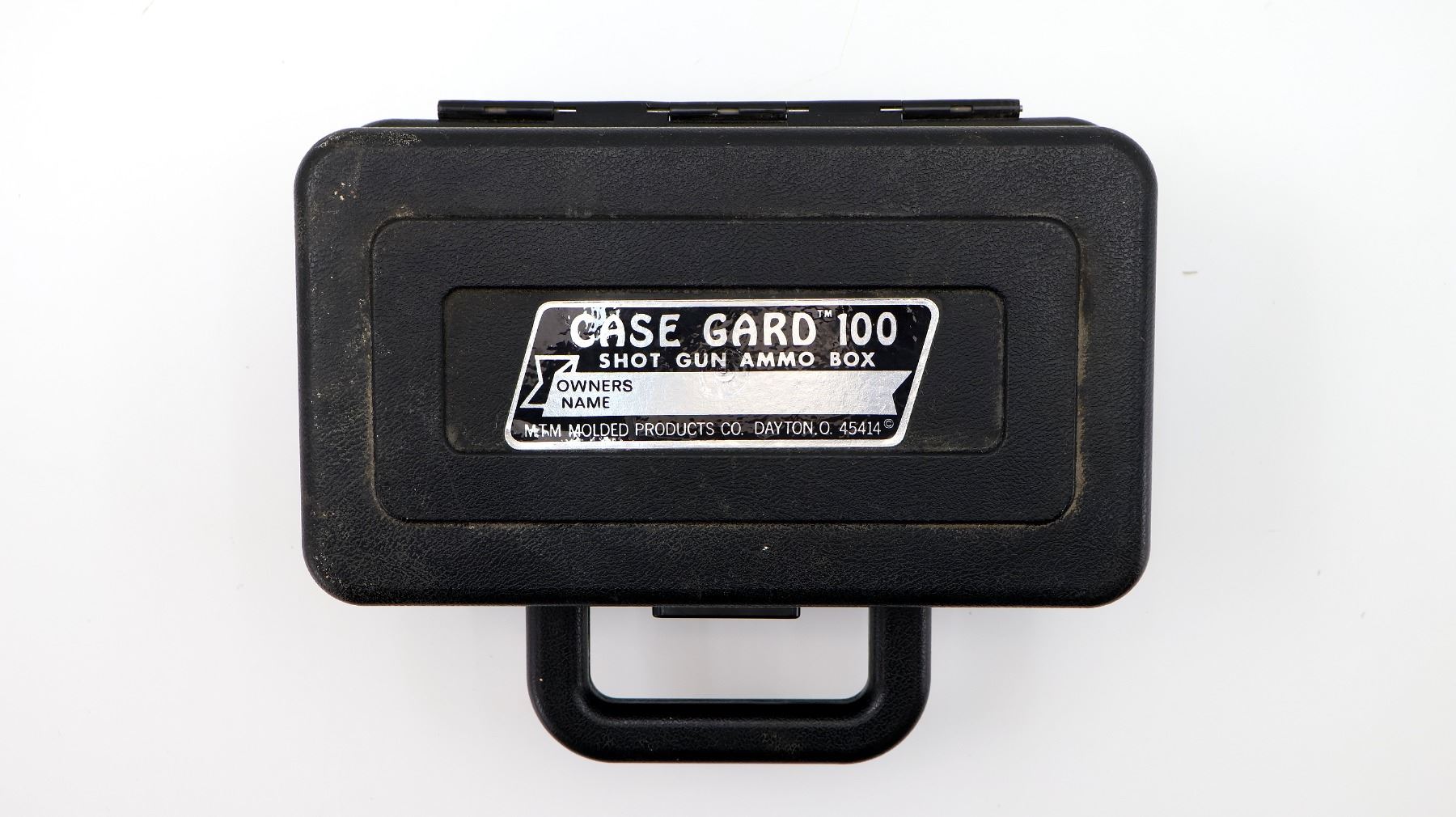 (1) BLACK PLASTIC MTM CASE GARD 100 SHOT GUN AMMO BOX, FITS 12 GA. SHELLS, HOLDS 100-RNDS, VARIOUS MARKINGS, INCLUDING HANDLE APPROX. 11.5" X 9.5" X 6.75". SEE PHOTOS.
