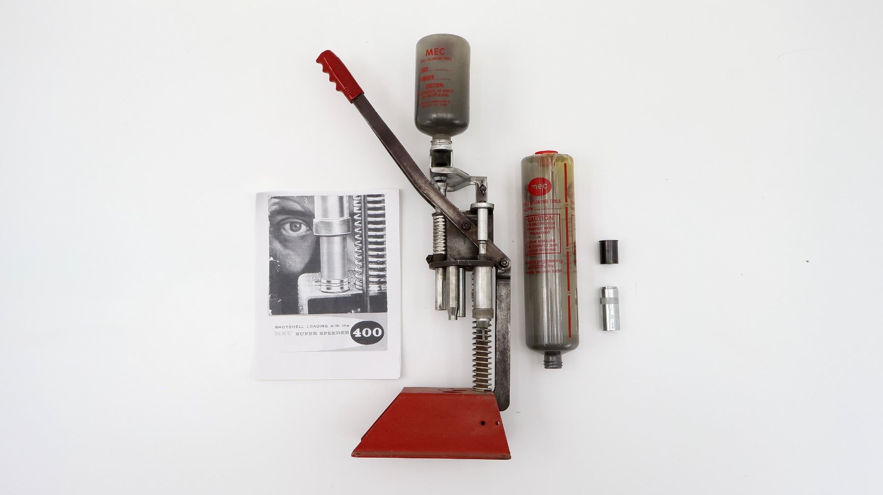 LOT INCLUDES (1) MODEL 400 12 GA. SHOT SHELL PRESS WITH (1) COPY OF INSTRUCTION MANUAL, (2) POWDER / SHOT BOTTLES, ONE IS CRACKED & TAPED ALONG TOP, ETC., NO POWDER BAR OR POWDER BUSHING, MAY REQUIRE ADJUSTMENTS AND/OR MAY NOT BE COMPLETE. SEE PHOTOS.