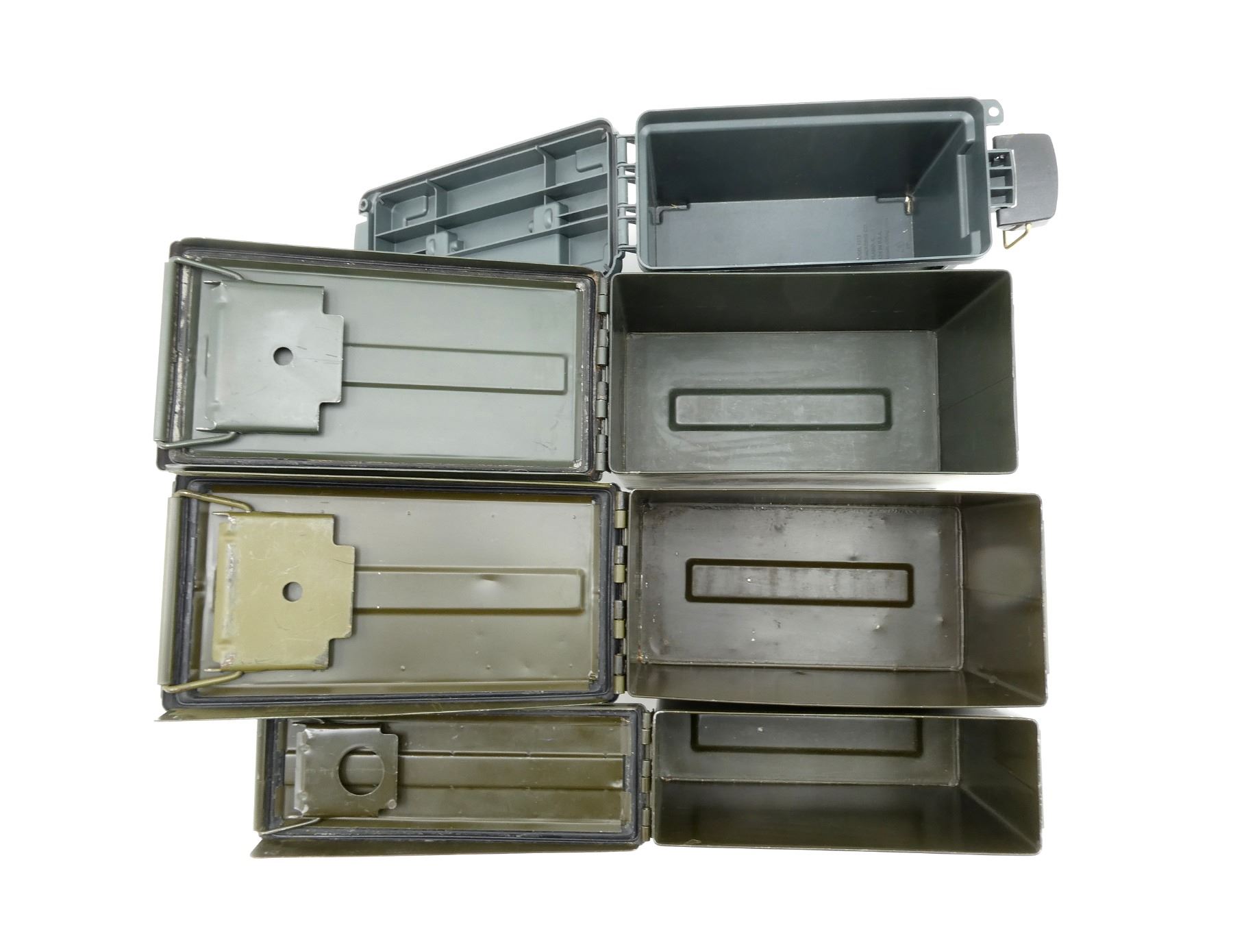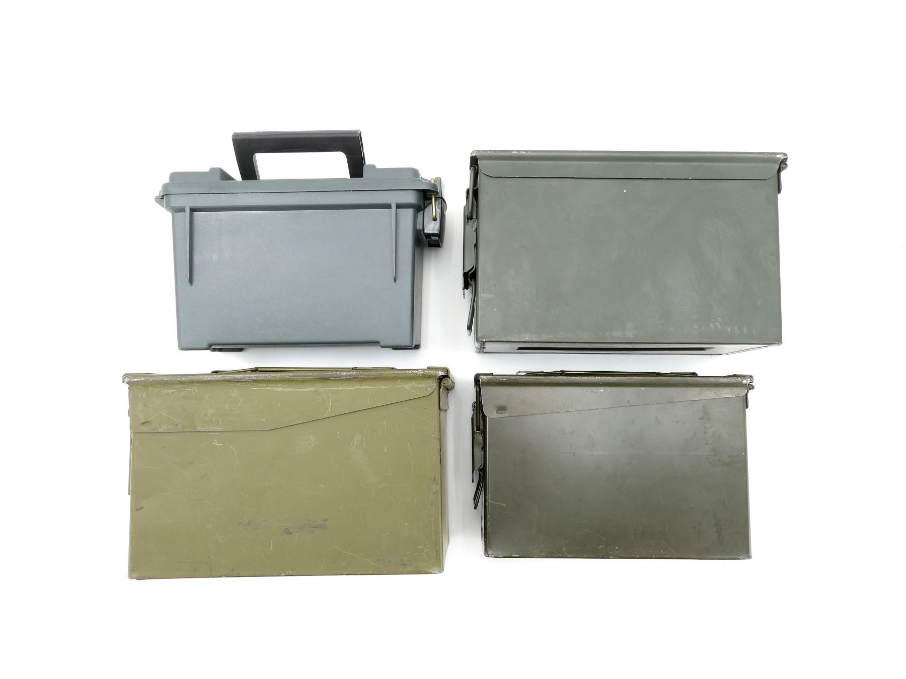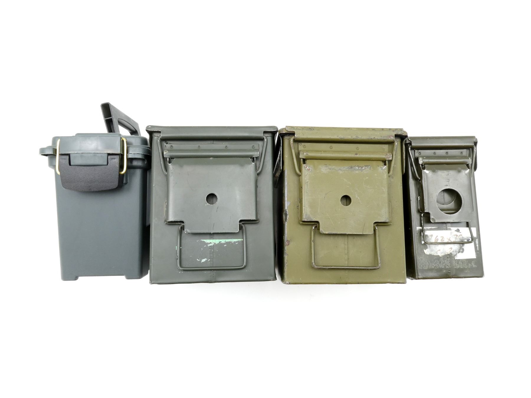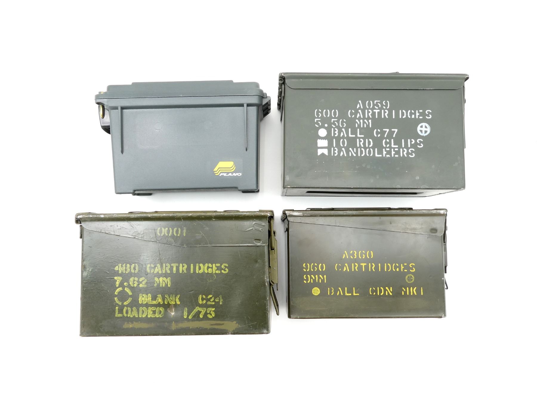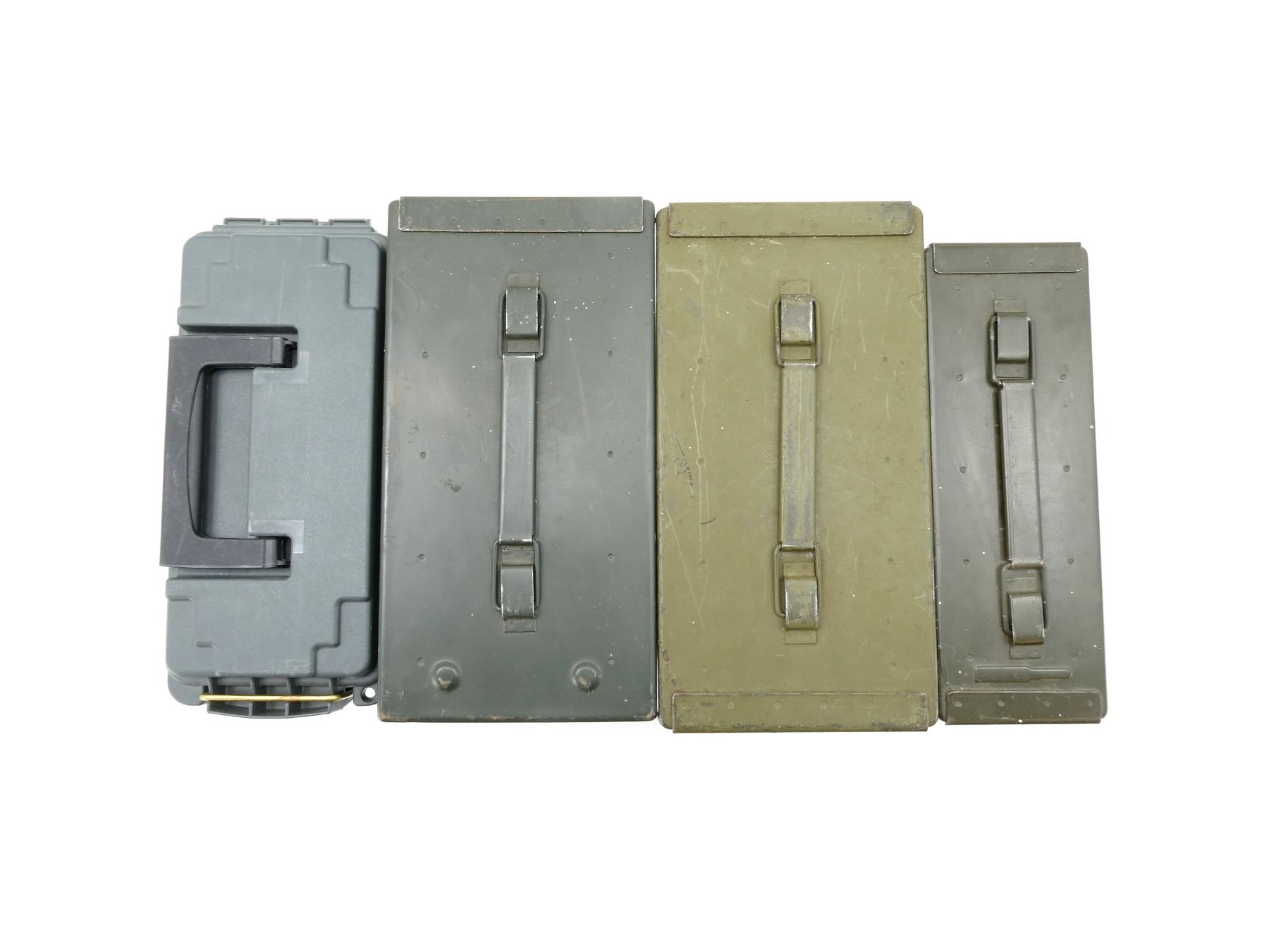 LOT INCLUDES; (2) GREEN PAINTED METAL AMMO TINS, VARIOUS MARKINGS, APPROX. 12" X 6" X 7.25", (1) GREEN PAINTED METAL AMMO TIN, VARIOUS MARKINGS, APPROX. 11" X 3.75" X 7" & (1) GREEN / GREY PLASTIC PLANO AMMO BOX, VARIOUS MARKINGS INSIDE, APPROX. 11.5" X 5" X 7.25". SEE PHOTOS.