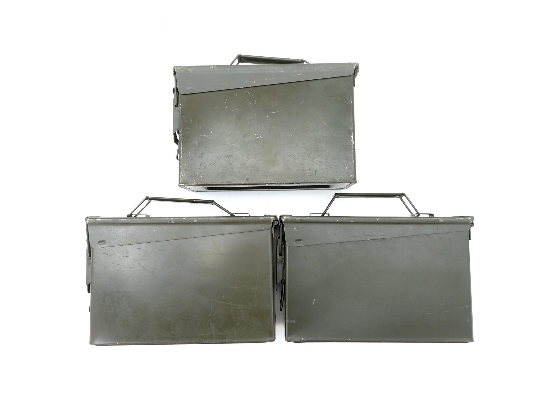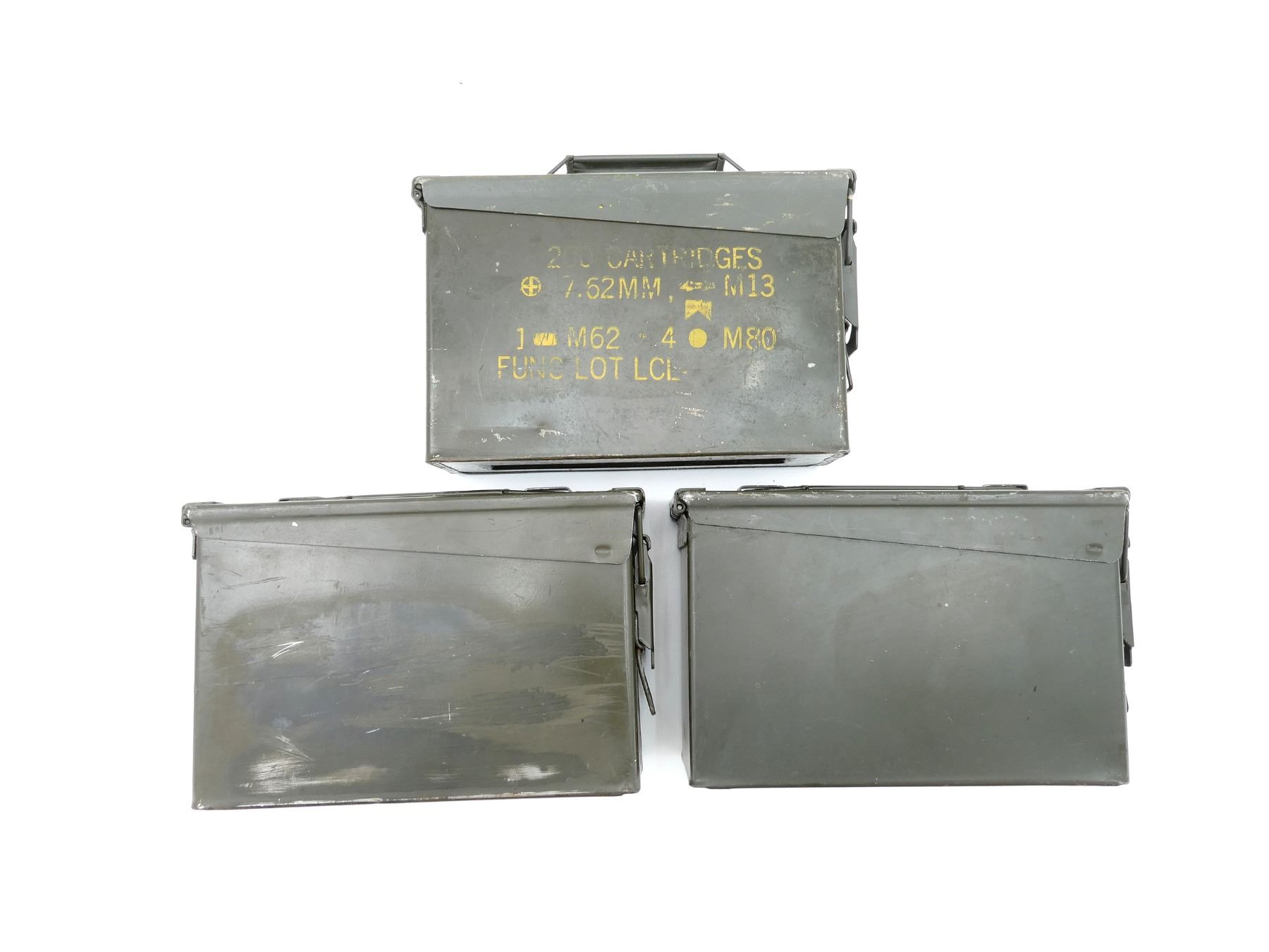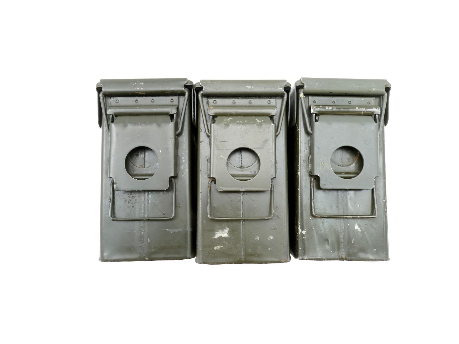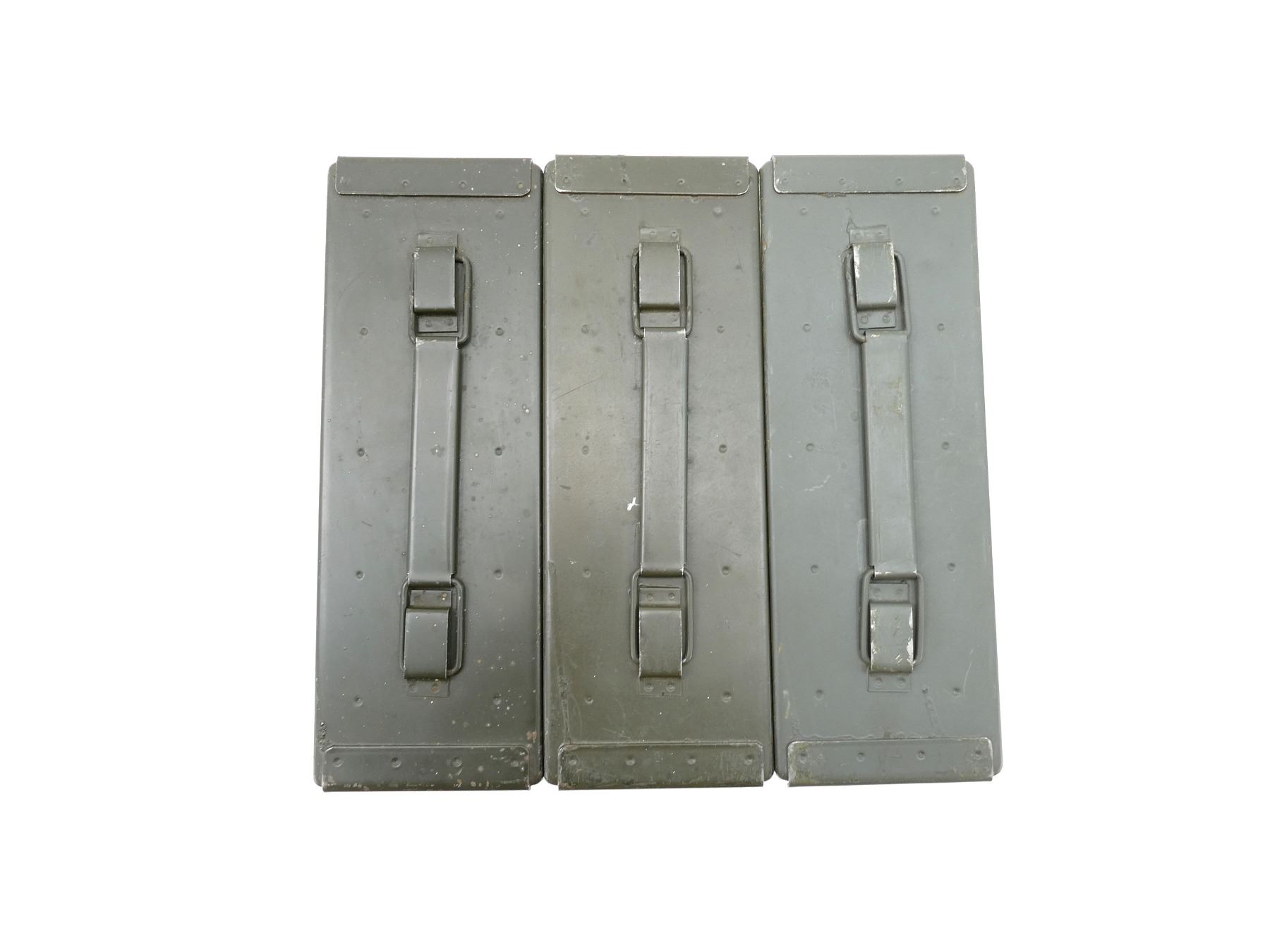 LOT INCLUDES; (3) GREEN PAINTED METAL AMMO TINS, VARIOUS MARKINGS, APPROX. 11" X 3.75" X 7". SEE PHOTOS.