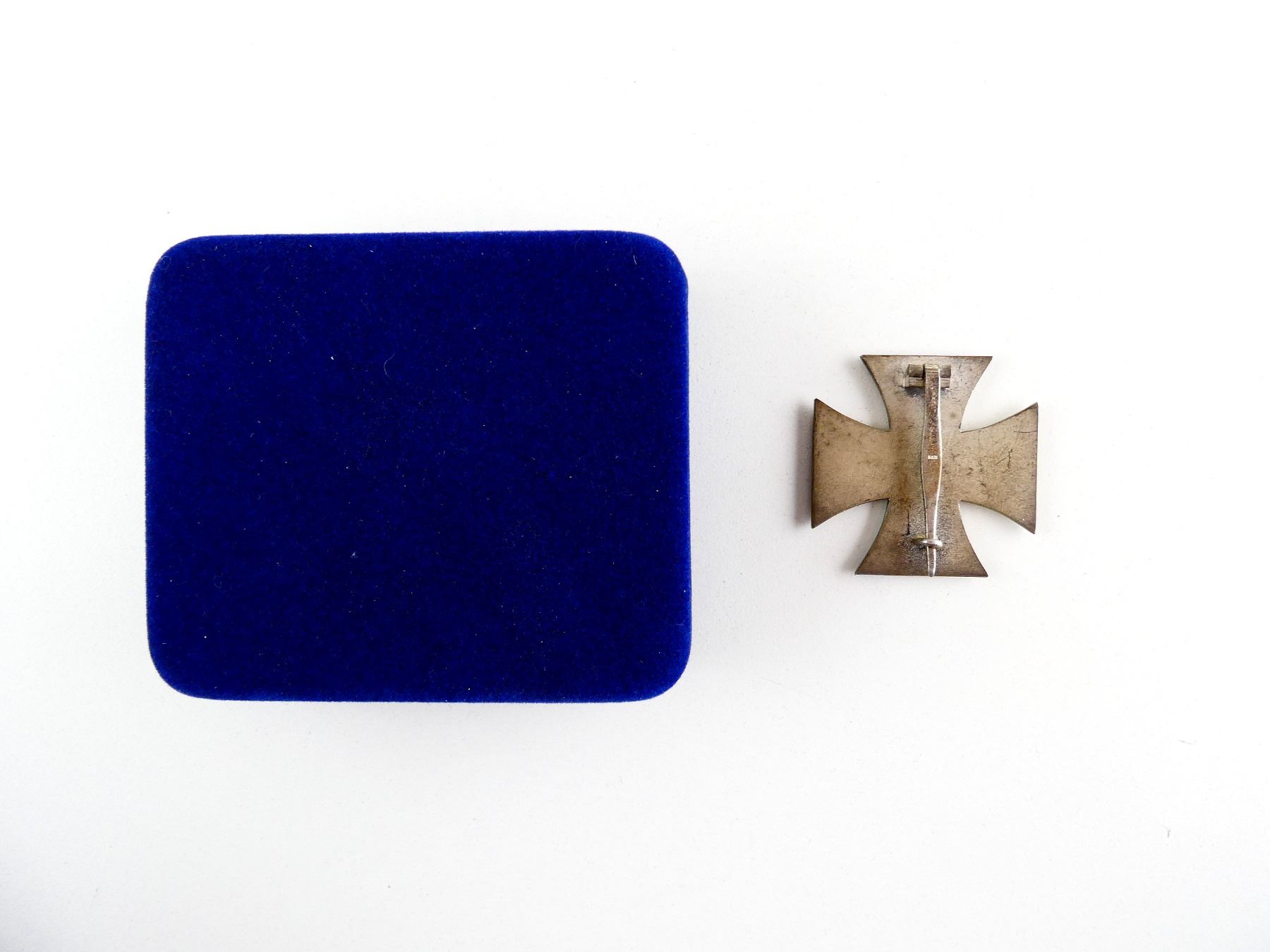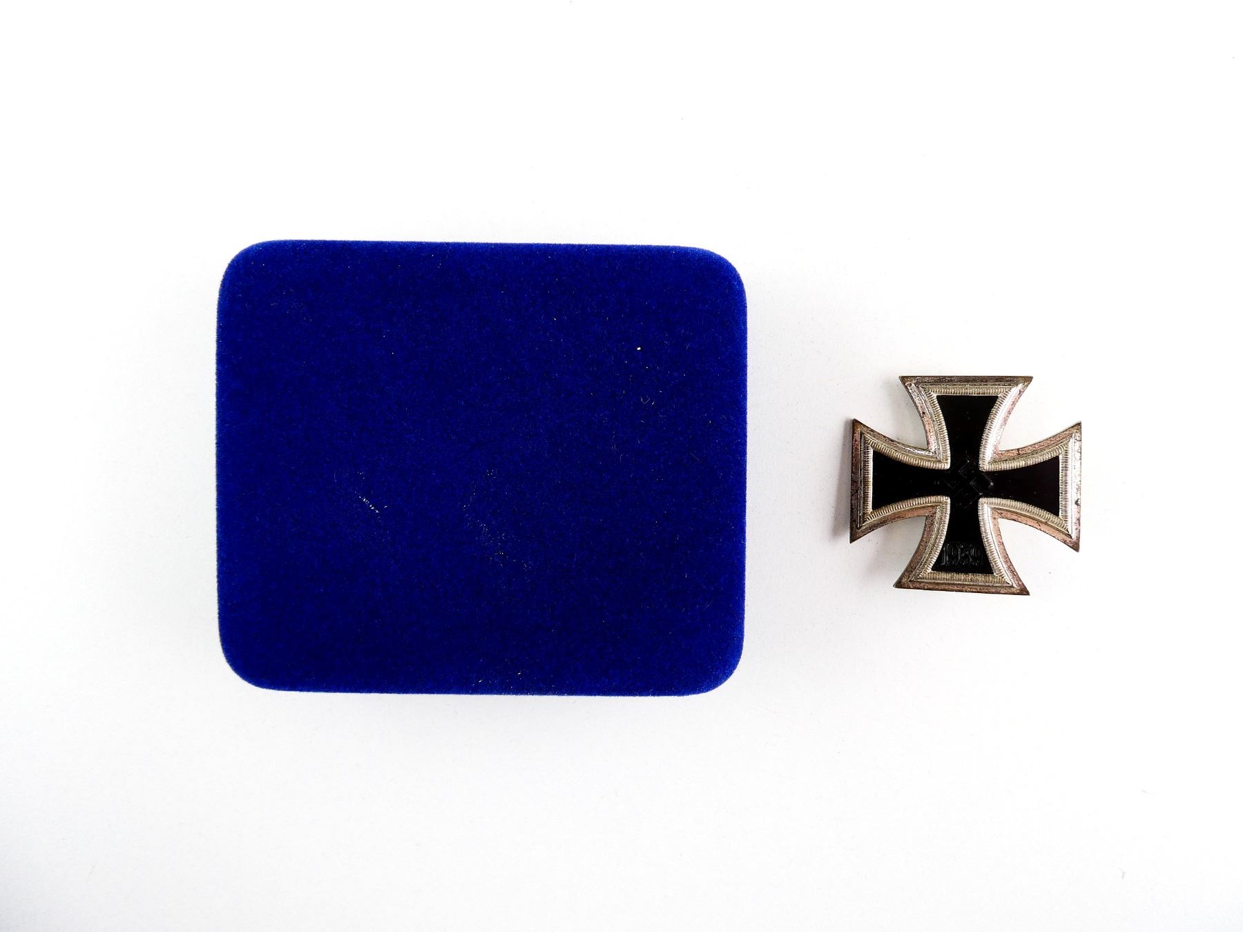(1) 1ST CLASS IRON CROSS, MEDAL MARKED WITH SWASTIKA OVER "1939", 3-PIECE CONSTRUCTION, MAGNETIC CORE, VISIBLE JOINT LINE AROUND EDGE, PAPER FITS UNDER CENTER EDGE, SILVER FINISH, FLAT TAPERED PIN BACKING, INTACT, PIN MARKED: "15", IN BLUE VELVET BOX. SEE PHOTOS.