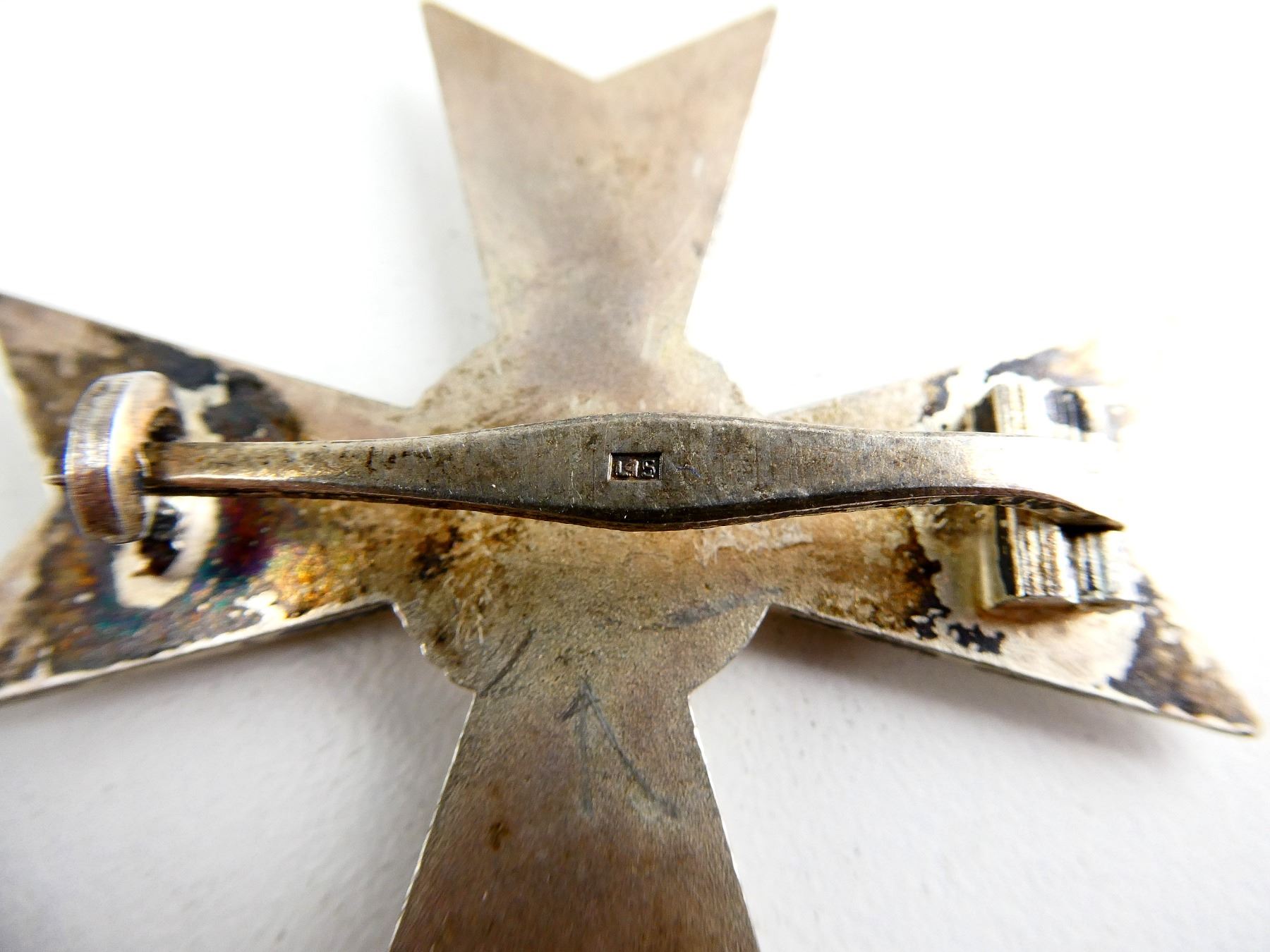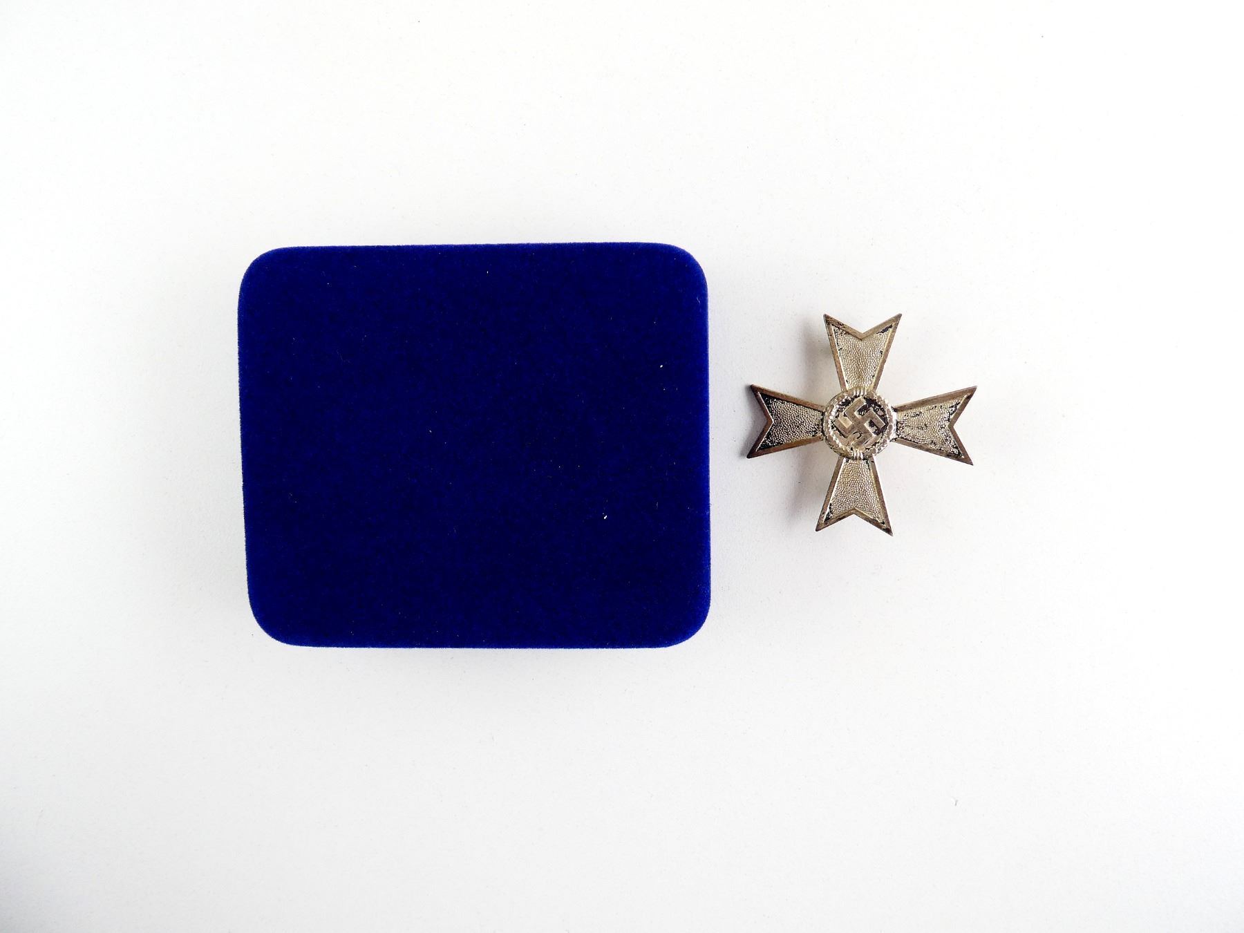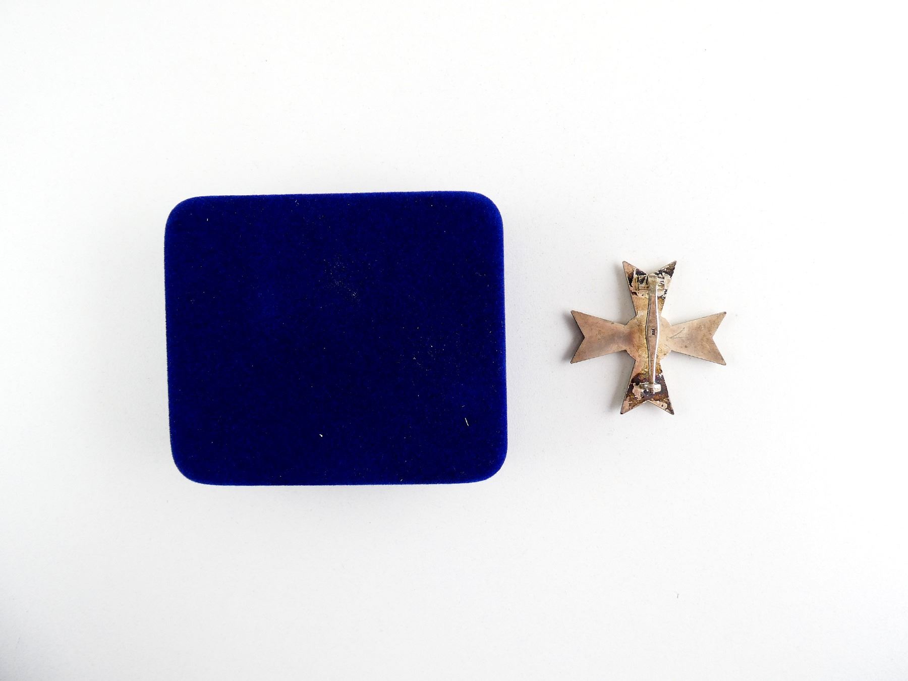 (1) SILVER UN-NAMED FULL SIZE WAR MERIT CROSS WITHOUT SWORDS, INTACT FLAT PIN & CATCH, PIN MARKED: "L15", WITH BLUE VELVET BOX. SEE PHOTOS.