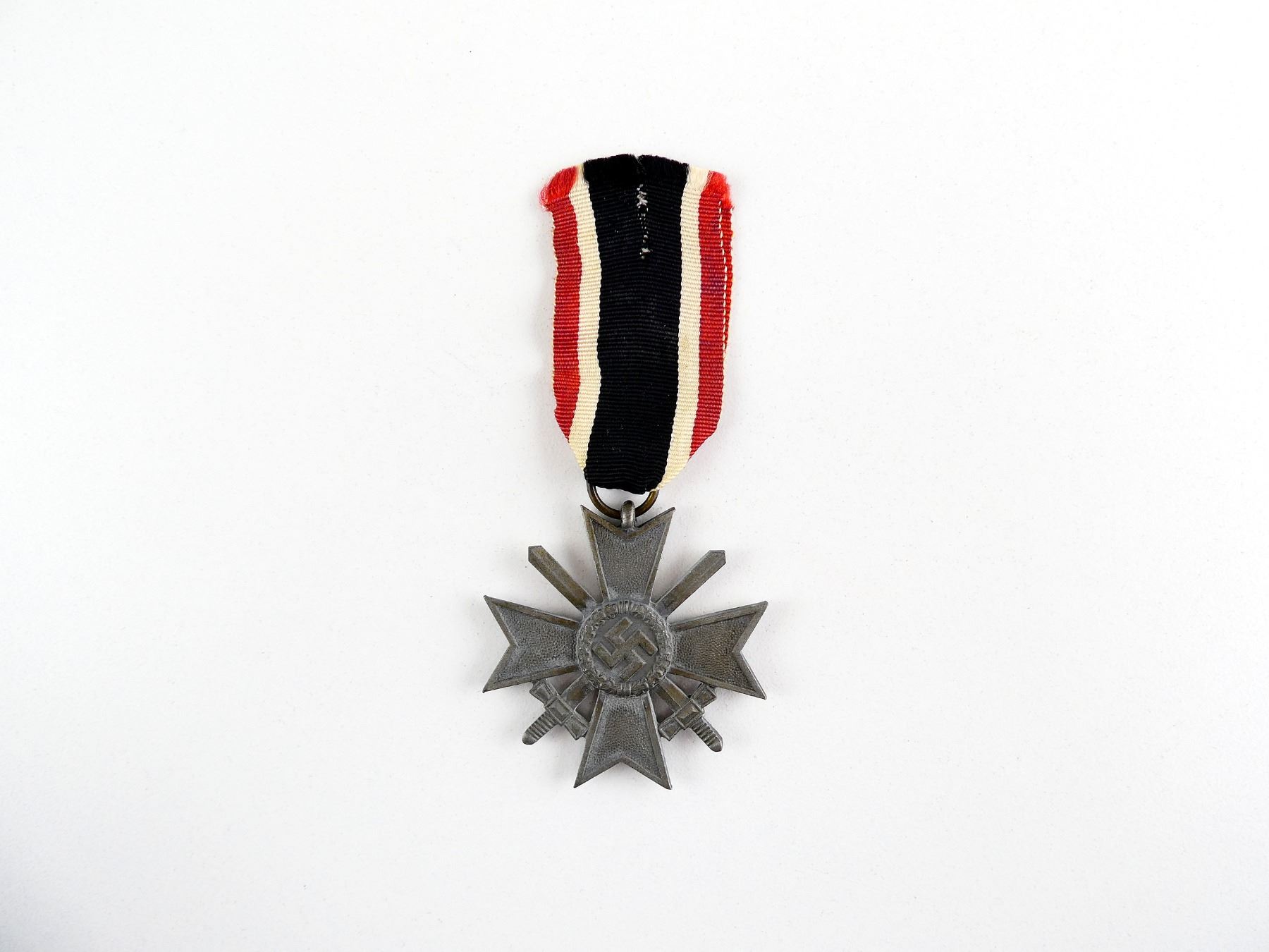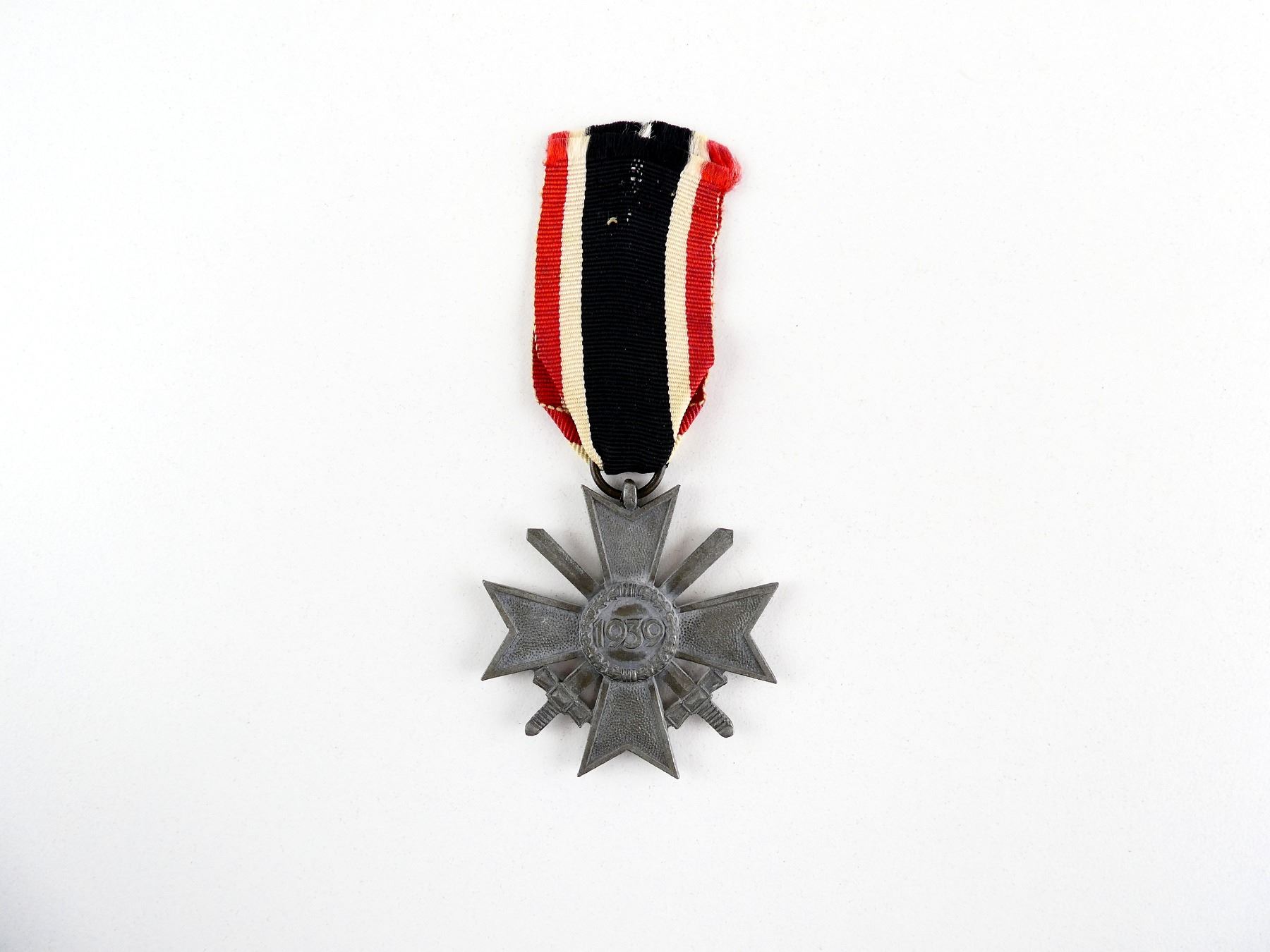 (1) UN-NAMED FULL SIZE WAR MERIT CROSS WITH SWORDS WITH RED / WHITE / BLACK RIBBON, MARKED: SWASTIKA IN A WREATH, OTHER-SIDE MARKED: "1939", NO VISIBLE MARKINGS ON RIBBON LOOP, RIBBON APPEARS TO GLOW UNDER BLACK LIGHT. SEE PHOTOS.