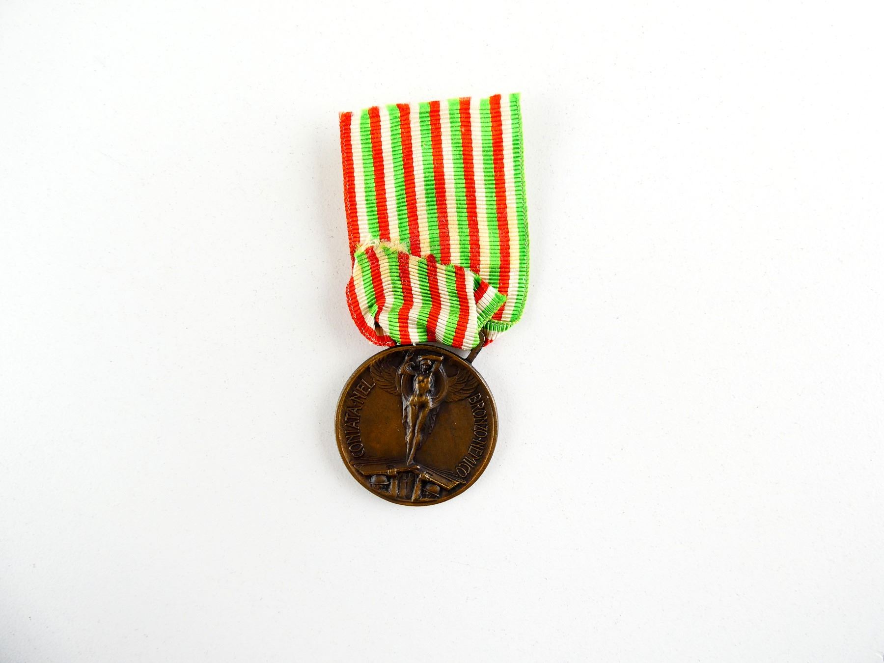 (1) UN-NAMED FULL SIZE BRONZE 1915-1918 WAR MEDAL WITH RIBBON, MARKED: "CONIATA-NEL, BRONZO-NEMICO", OTHER-SIDE MARKED: "GVERRA PER L'VNITA, D'ITALIA, 1915 1918" FAINT MARKING UNDER / RIGHT SIDE OF VITTORIO EMANUELE III PROFILE. SEE PHOTOS.