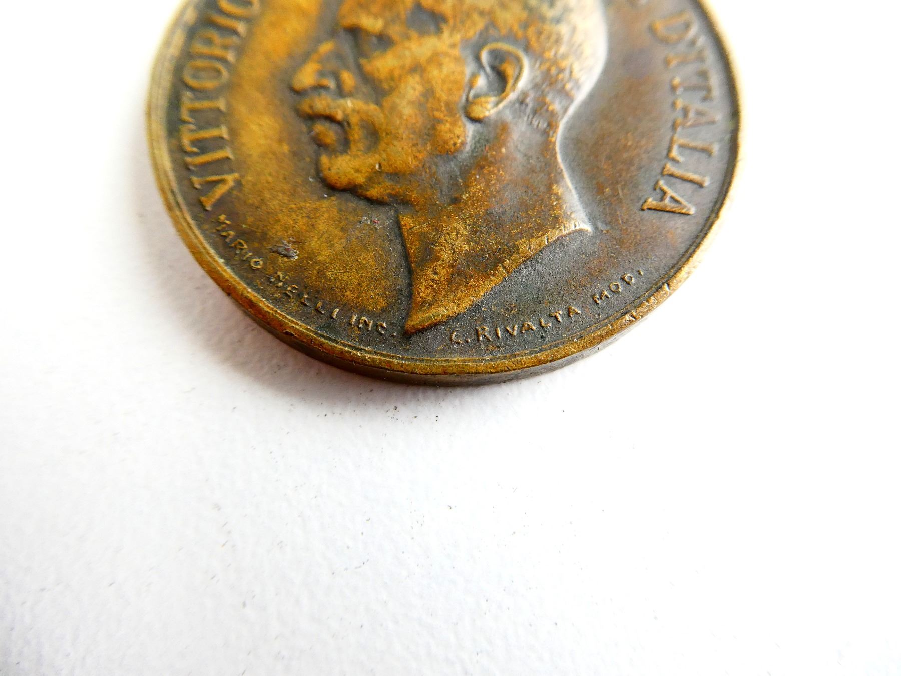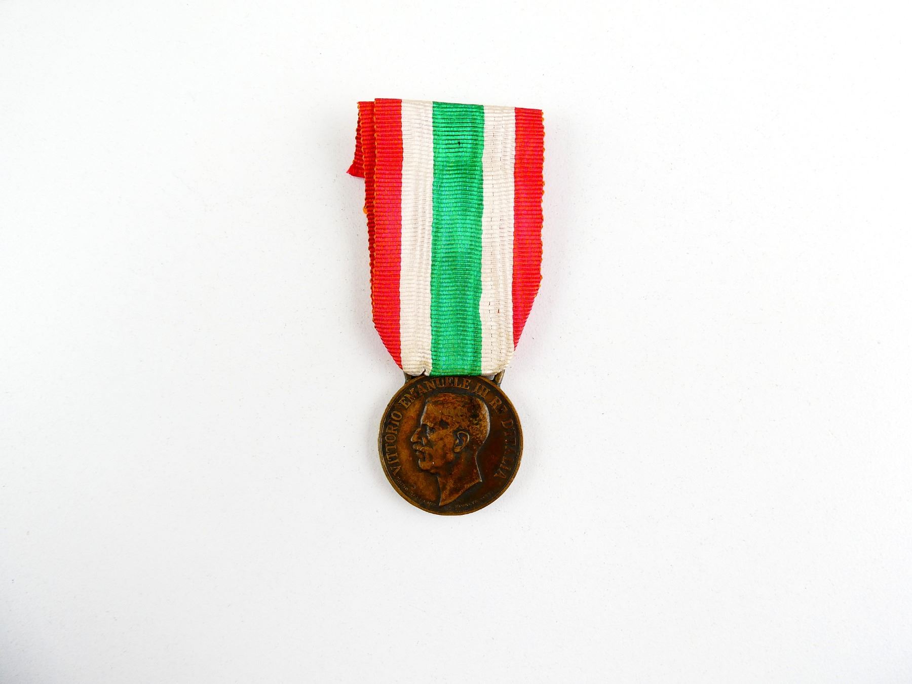 (1) UN-NAMED FULL SIZE BRONZE UNIFICATION OF ITALY MEDAL 1848-1918 WITH RIBBON, AWARDED TO VETERANS OF THE GREAT WAR FROM 1922, MARKED: "VITTORIO EMANUELE III RE D'ITALIA", ALONG BOTTOM UNDER BUST "MARIO NELLI INC., C.RIVALTA MOD." WITH BUST OF VITTORIO, OTHER-SIDE MARKED: "UNITA D'ITALIA 1848-1918", BOTTOM CENTER UNDER WREATH "CBC". SEE PHOTOS.