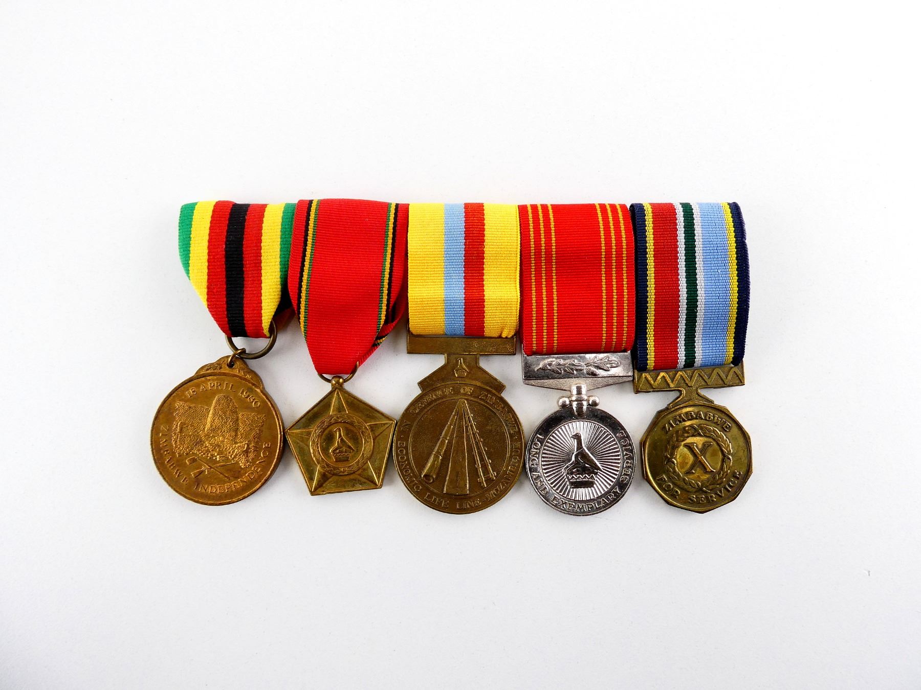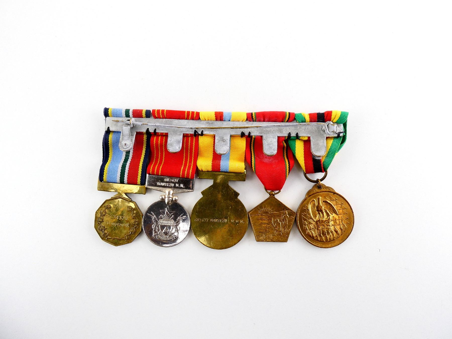 ALL AFFIXED TO MEDAL BAR, WITH PAPERWORK, LOT INCLUDES; (1) ZIMBABWE INDEPENDENCE MEDAL WITH RIBBON, RIM MARKED: "38245", (1) ZIMBABWE LIBERATION MEDAL WITH RIBBON, RIM MARKED: "69834", (1) ZIMBABWE MOZAMBIQUE CAMPAIGN MEDAL WITH RIBBON, BACK MARKED: "683437 MANYEZU M.M M.", (1) ZIMBABWE LONG AND EXEMPLARY SERVICE MEDAL WITH RIBBON, BACK OF SUSPENSION MARKED: "683437, MANYEZU M.M." & (1) ZIMBABWE 10 YEARS SERVICE MEDAL WITH RIBBON, BACK MARKED: "683437Q, MANYEZUMK". SEE PHOTOS.