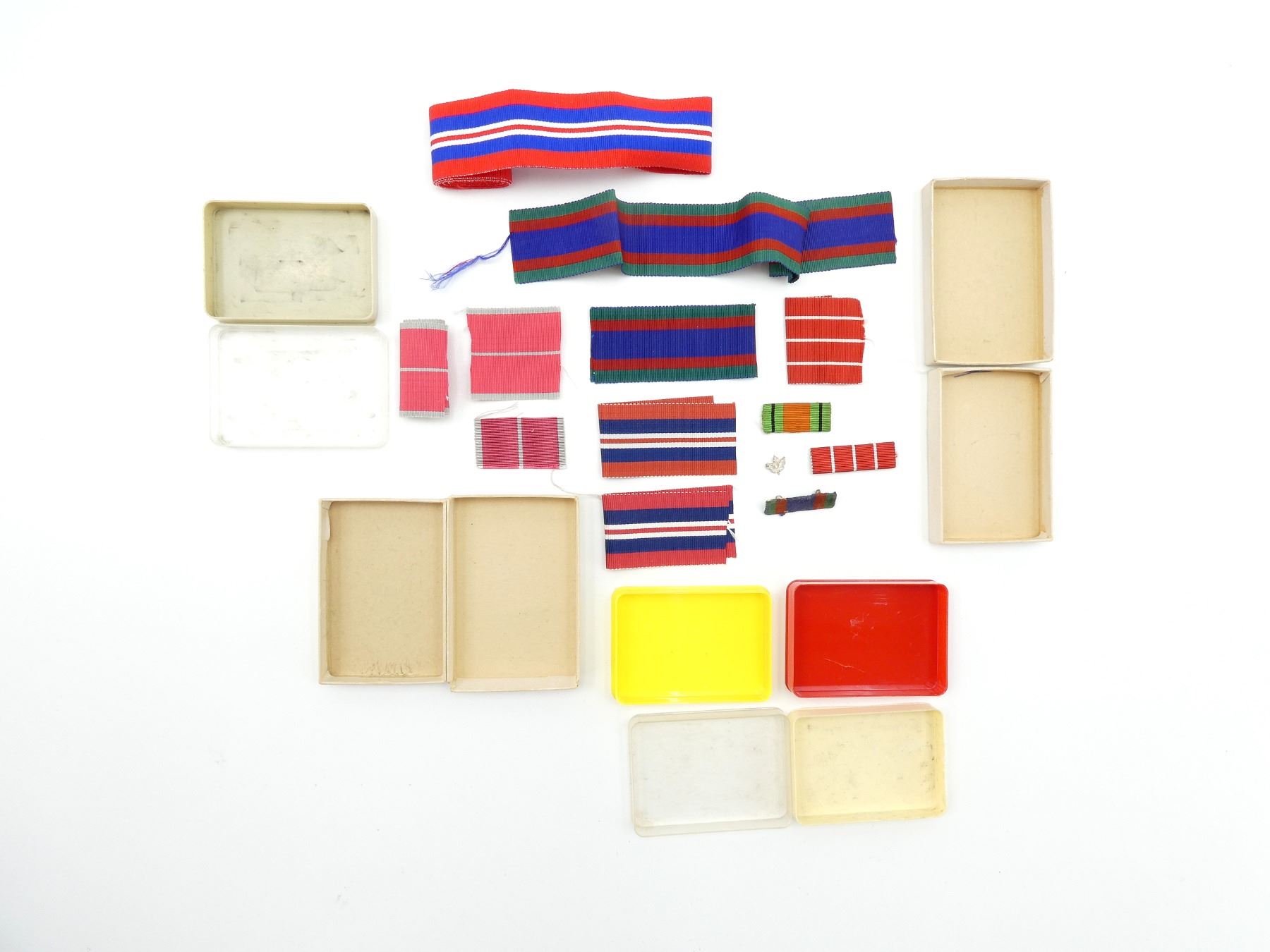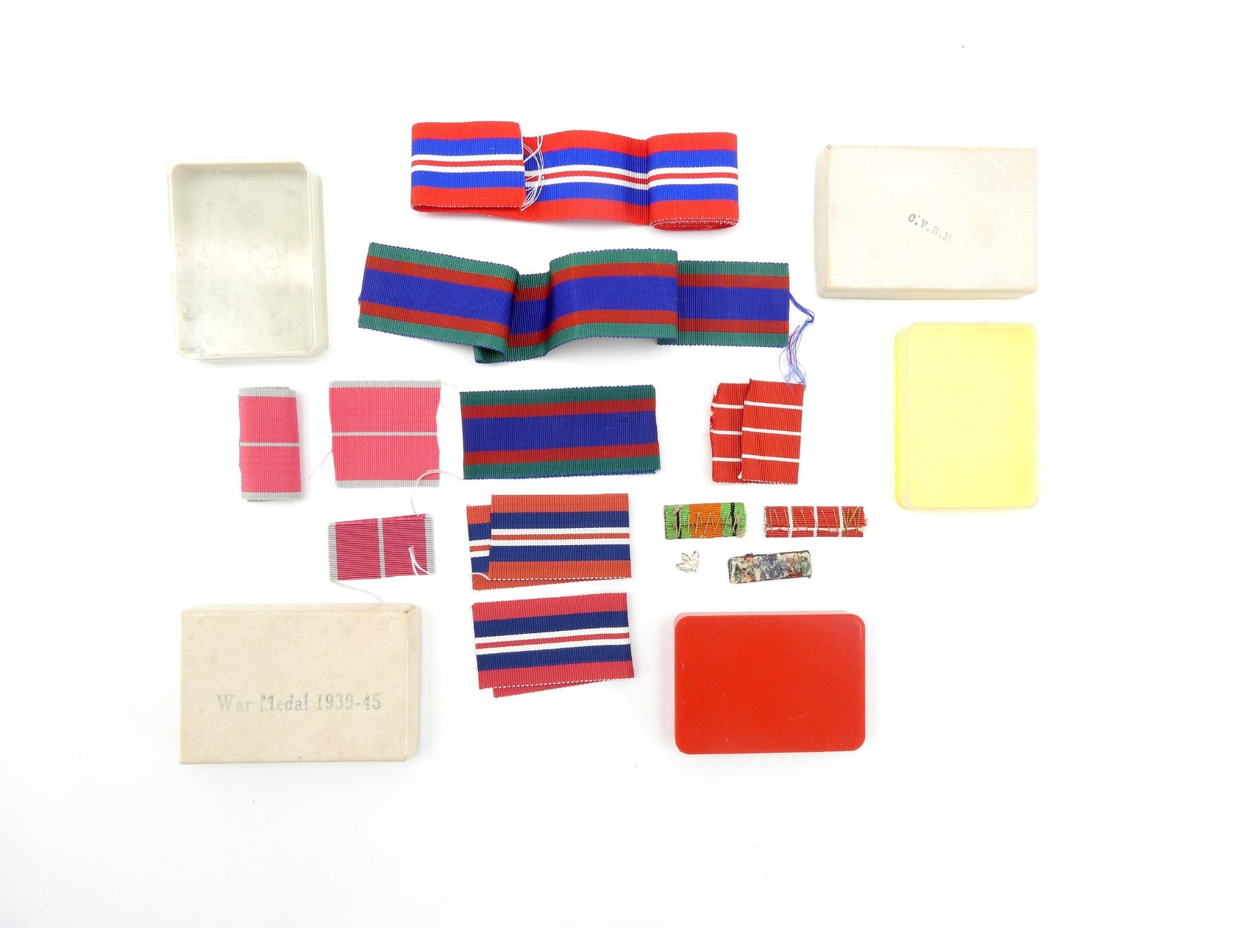 LOT INCLUDES; (3) 1939-1945 WAR MEDAL RIBBONS, (1) 1939-1945 WAR MEDAL BOX, (2) WWII CANADIAN VOLUNTEER SERVICE MEDAL RIBBONS, (1) CVSM MEDAL BOX, (1) WWII CVSM RIBBON BAR, (1) CANADIAN FORCES' DECORATION MEDAL RIBBON, (1) CANADIAN FORCES' DECORATION RIBBON BAR, (3) COMMANDER / OFFICER OF THE MOST EXCELLENT ORDER OF THE BRITISH EMPIRE MEDAL RIBBONS, (1) WWII CANADIAN DEFENCE MEDAL RIBBON BAR, (1) MAPLE LEAF FOR RIBBONS & (3) PLASTIC MEDAL BOXES. SEE PHOTOS.
