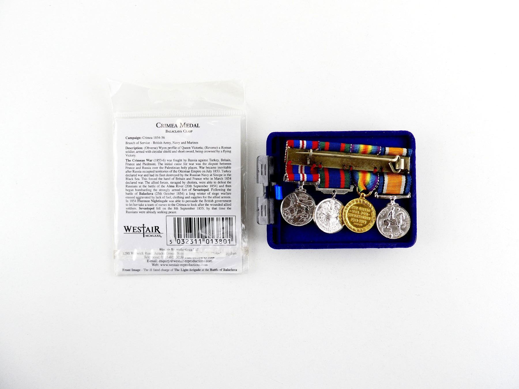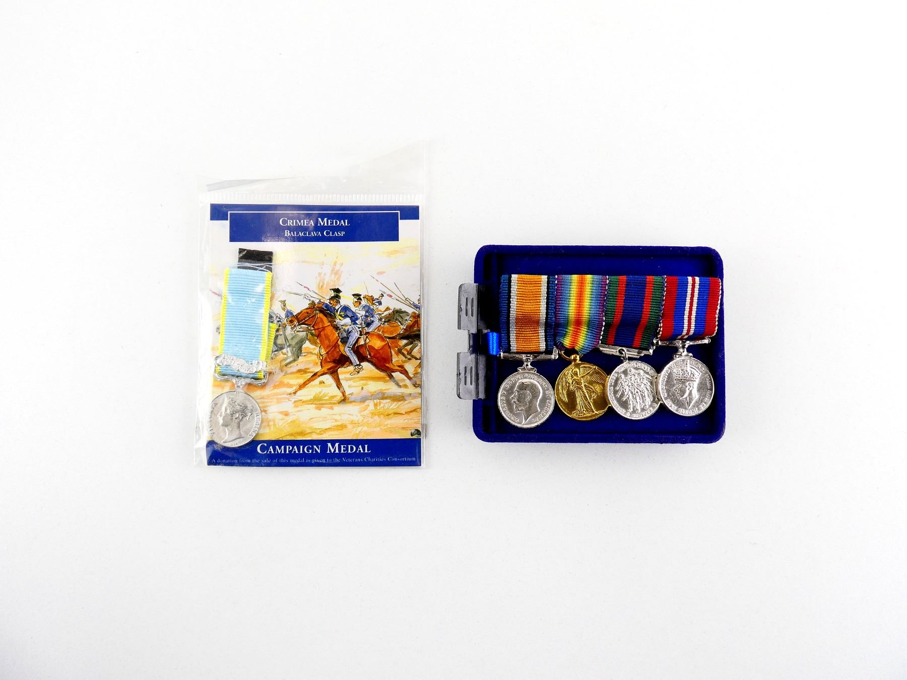 LOT INCLUDES; (1) RIBBON BAR WITH FOUR MINIATURE MEDALS ATTACHED, WWI BRITISH WAR MEDAL, WWI VICTORY MEDAL, WWII CANADIAN VOLUNTEER SERVICE MEDAL & WWII 1939-1945 WAR MEDAL WITH LOWER PORTION OF MEDAL CASE & (1) REPRODUCTION BRITISH MILITARY MINIATURE CRIMEA MEDAL WITH RIBBON & BALACLAVA CLASP, COMES WITH CARD BACKING WITH INFORMATION ABOUT MEDAL. SEE PHOTOS.