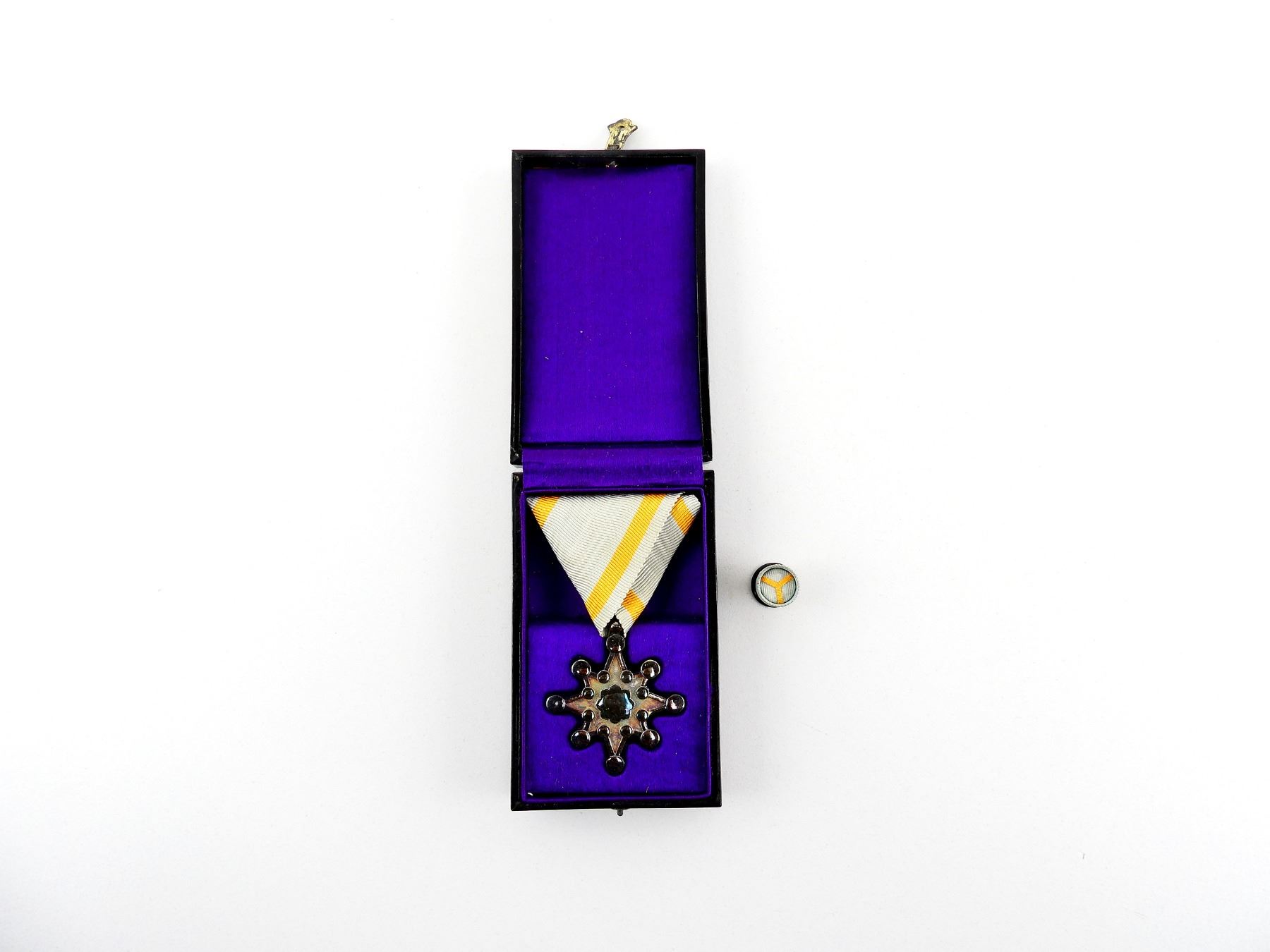 (1) ORDER OF SACRED TREASURE 8TH CLASS MEDAL WITH RIBBON, 8TH CLASS ROSETTE & MEDAL CASE, VARIOUS JAPANESE CHARACTERS ON BACK OF MEDAL / ON LID OF MEDAL CASE. SEE PHOTOS.