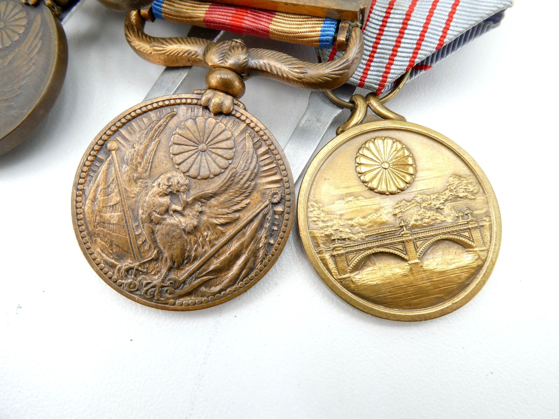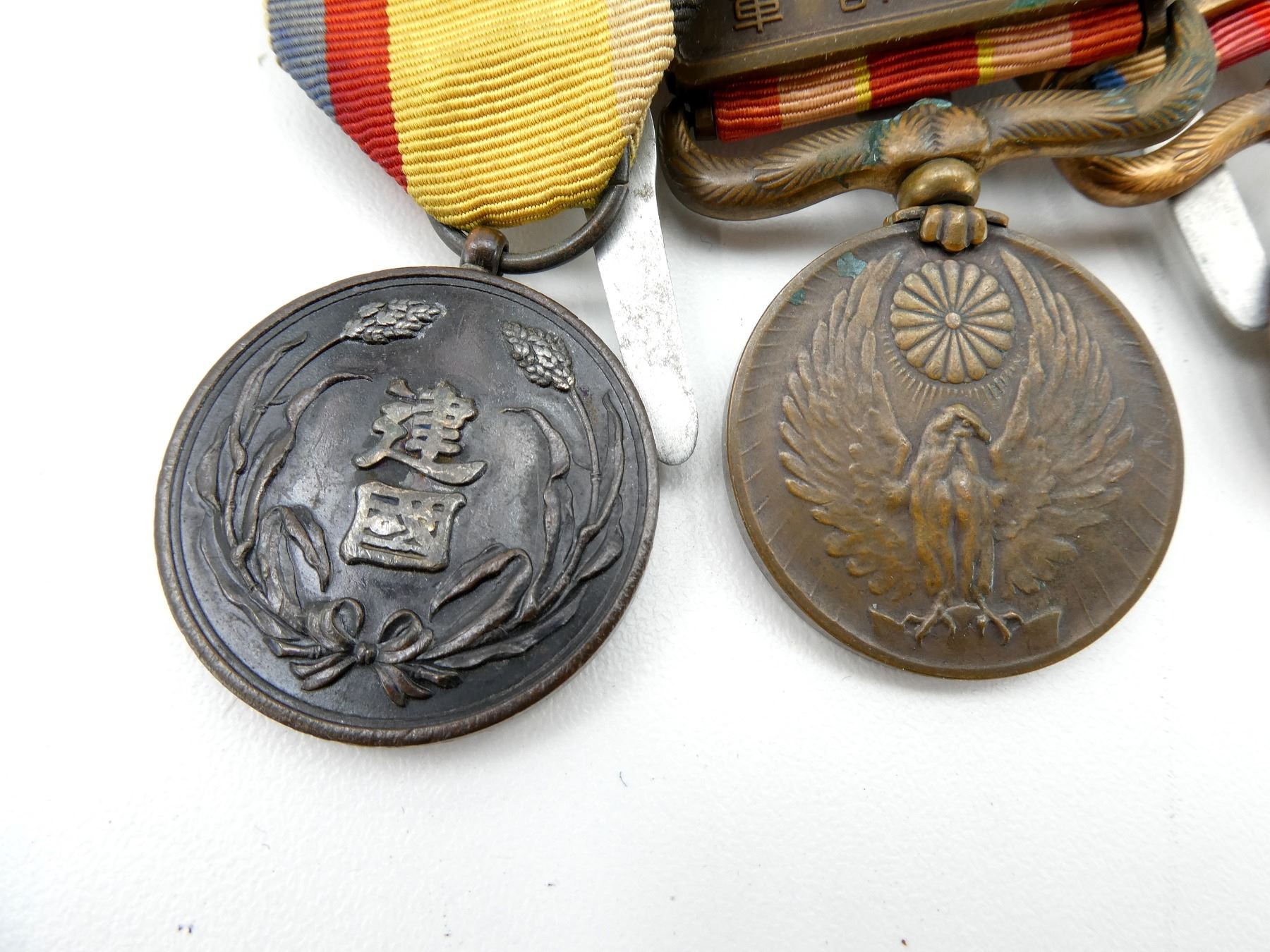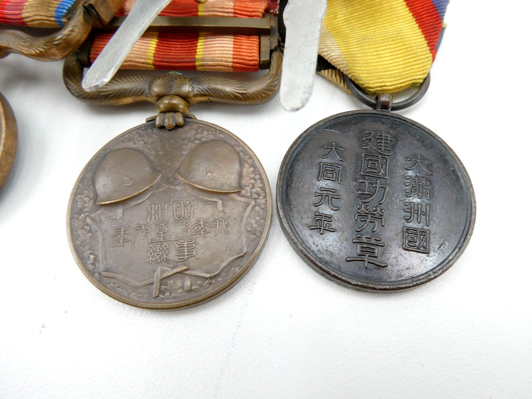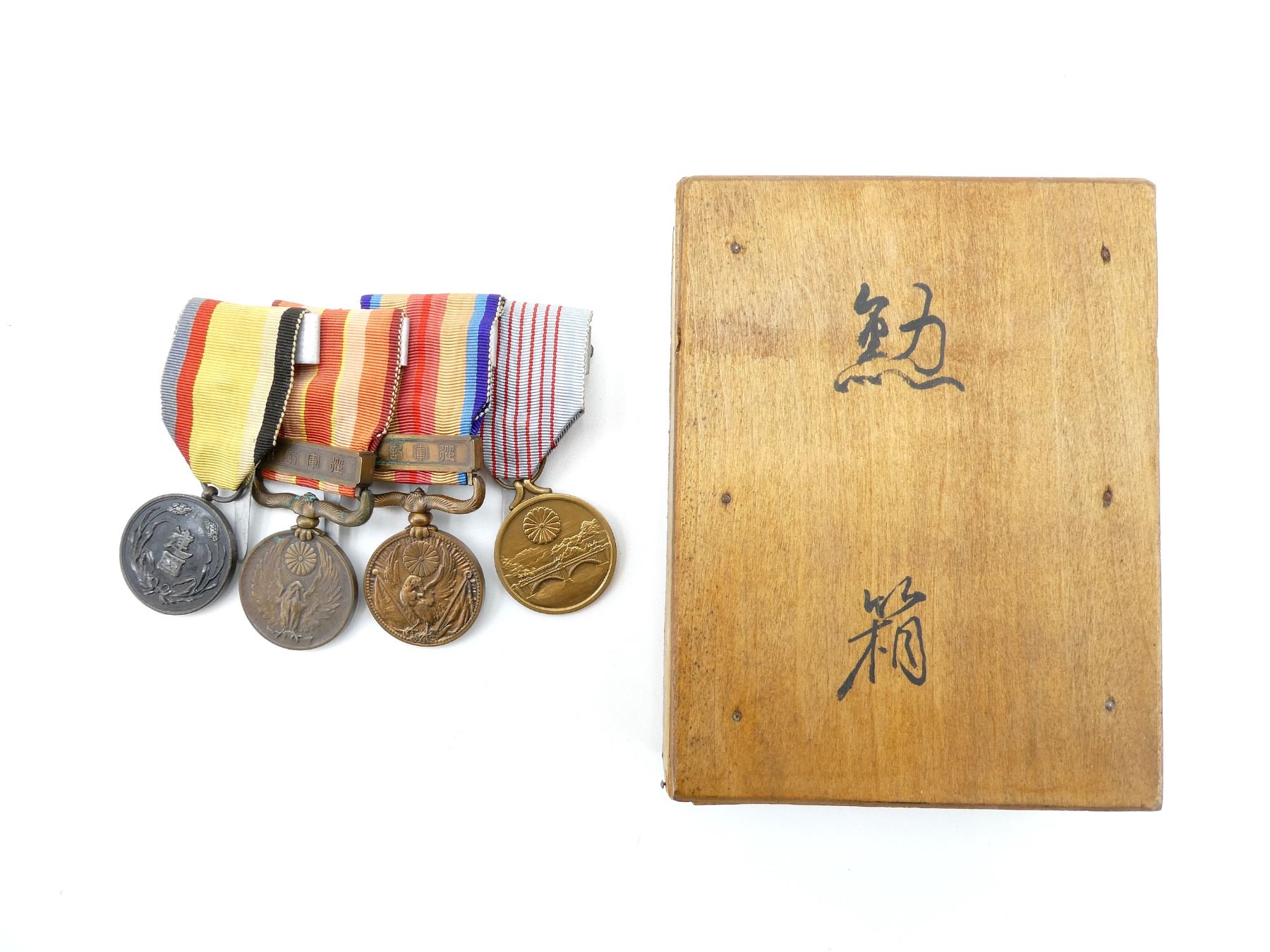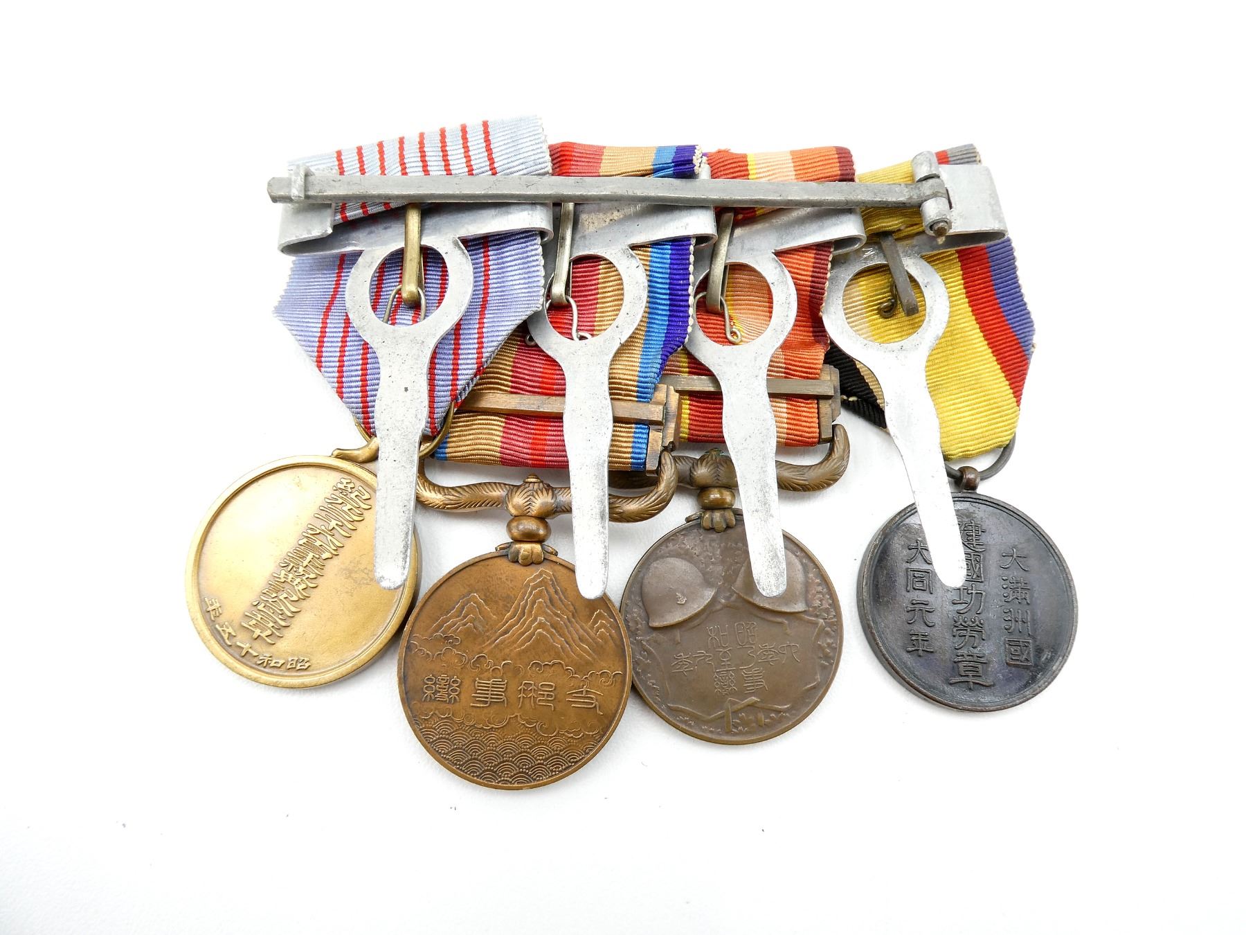 ALL AFFIXED TO MEDAL BAR, LOT INCLUDES; (1) MANCHUKUO NATIONAL FOUNDATION MERIT MEDAL WITH RIBBON, INSTITUTED IN 1933, BLACKENED BRONZE, (1) 1931-1934 MANCHURIAN INCIDENT COMMEMORATIVE MEDAL WITH RIBBON, (1) 1937-1945 CHINA INCIDENT WAR MEDAL WITH RIBBON, (1) 2600TH NATIONAL ANNIVERSARY COMMEMORATIVE MEDAL WITH RIBBON, AWARDED TO MILITARY PERSONNEL / CIVILIANS WHO PARTICIPATED IN THE CELEBRATIONS HELD IN 1940 & (1) WOODEN BOX FOR MEDALS WITH VARIOUS JAPANESE CHARACTERS ON THE LID / SIDE OF BOX, APPROX. 5.25" X 4" X 1 5/8". SEE PHOTOS.