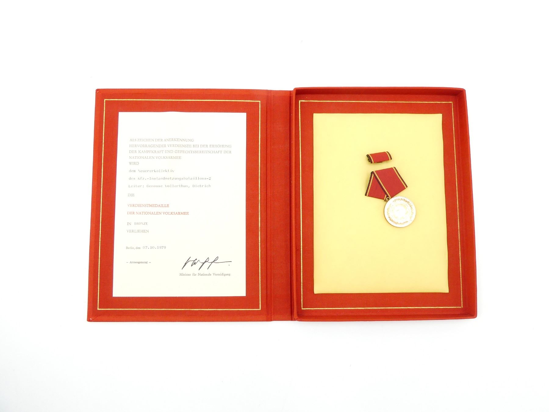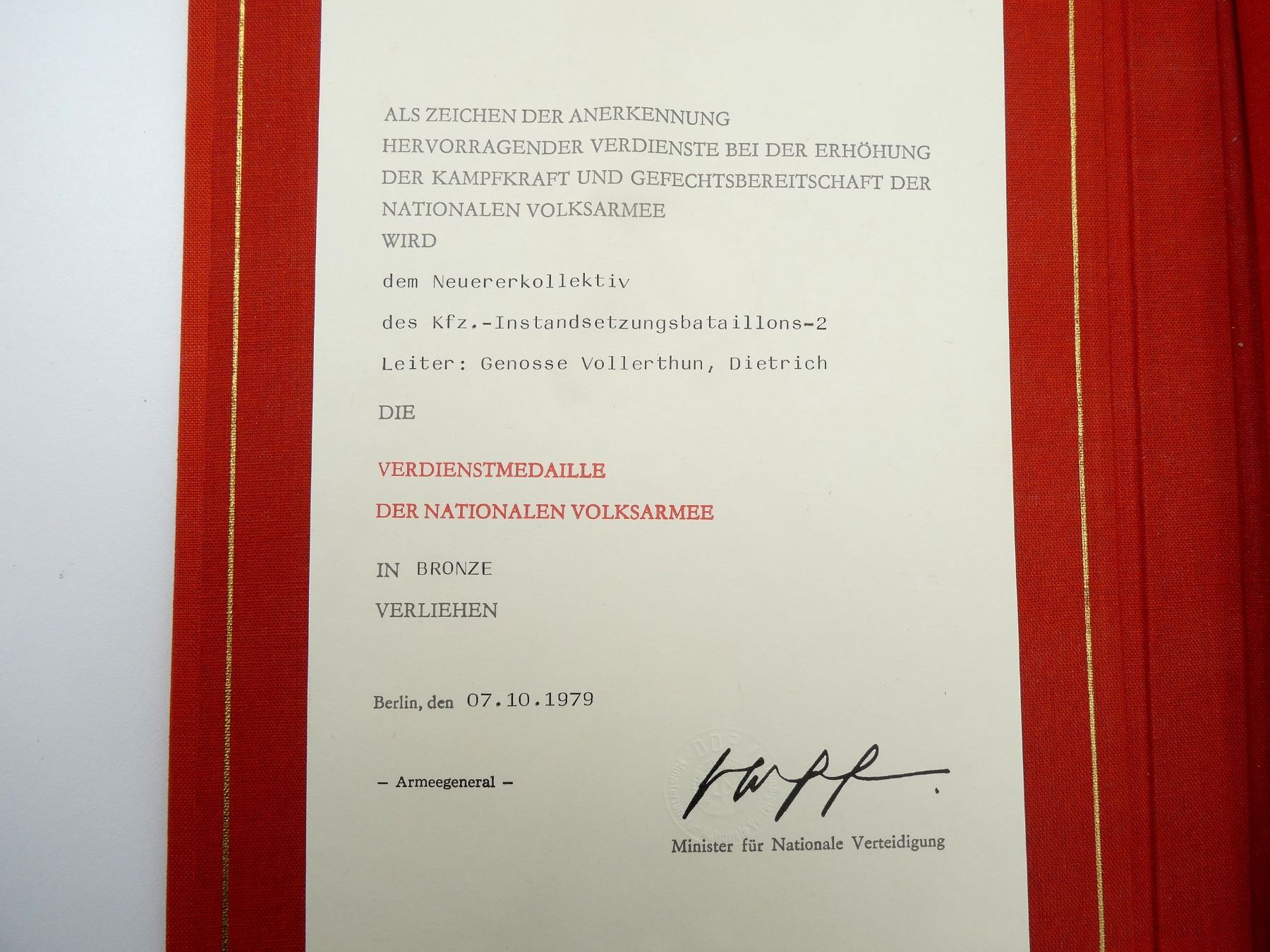 (1) MEDAL OF MERIT OF THE NATIONAL PEOPLE'S ARMY IN BRONZE WITH RIBBON & RIBBON BAR, CERTIFICATE NAMES MEDAL TO: "2ND MOTOR VEHICLE REPAIR BATTALION, COMMANDER: COMRADE VOLLERTHUN, DIETRICH", CERTIFICATE DATED: "07.10.1979", RED FABRIC COVERED PRESENTATION BOX WITH GOLD COLOURED WRITING / DETAILS, BOX APPROX. 10 3/8" X 8". SEE PHOTOS.