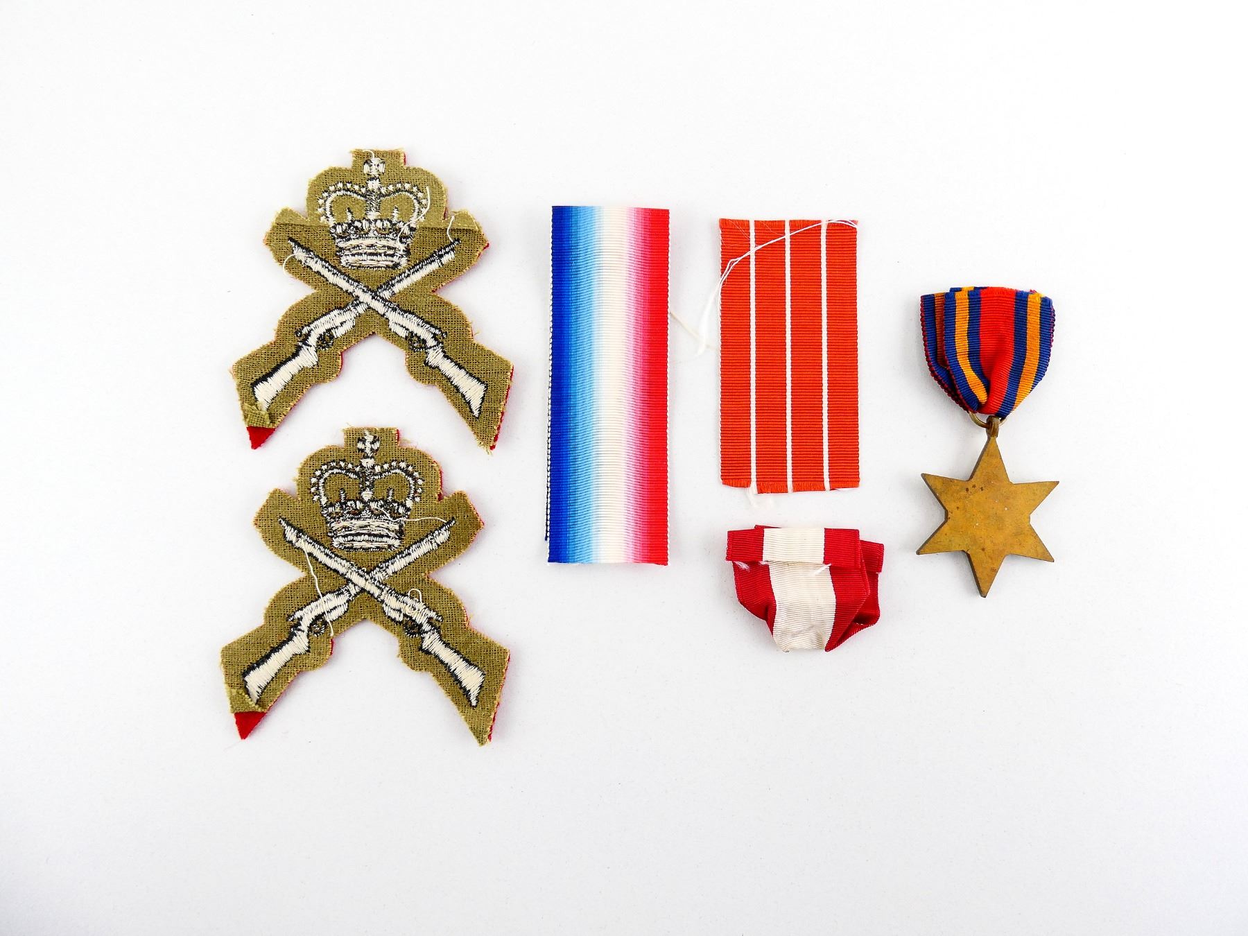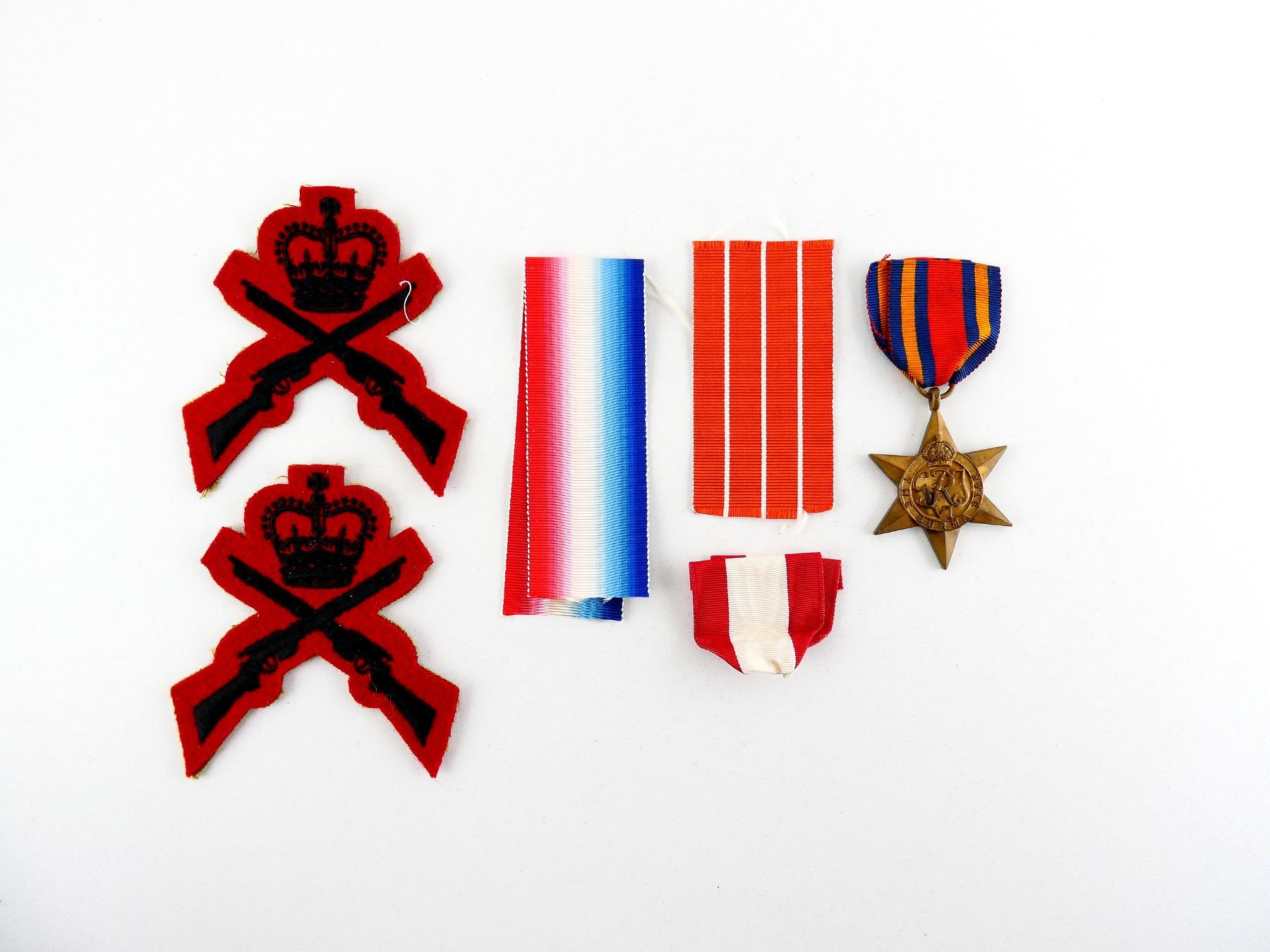 LOT INCLUDES; (1) WWII CANADIAN / BRITISH BURMA STAR WITH RIBBON, (1) WWI CANADIAN / BRITISH 1914-1915 STAR RIBBON, (1) CANADIAN FORCES' DECORATION RIBBON, (1) UNKNOWN MILITARY, POSSIBLY FRENCH, RED / WHITE STRIPED RIBBON & (2) CANADIAN MILITARY RIFLE MARKSMANSHIP BADGES. SEE PHOTOS.