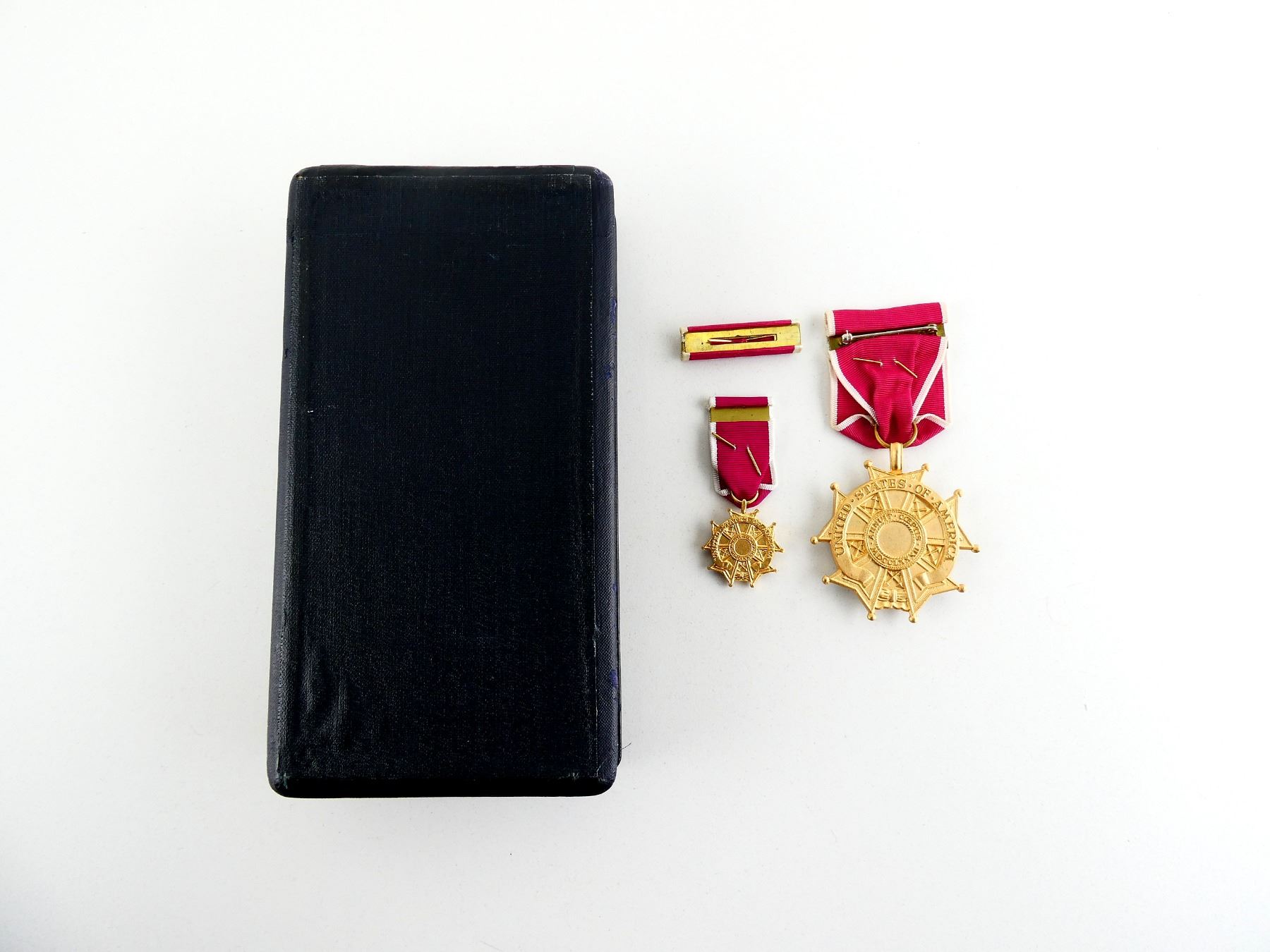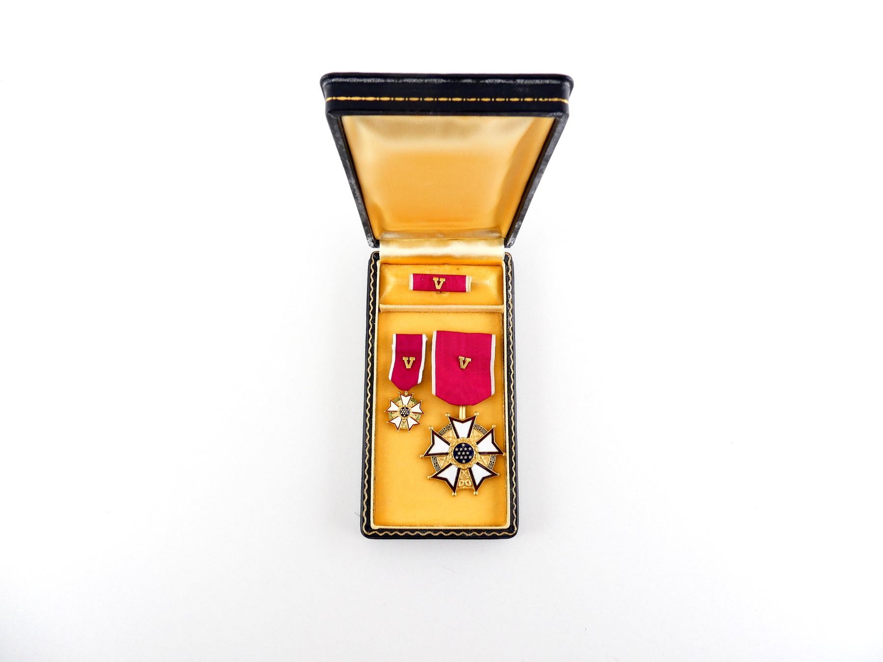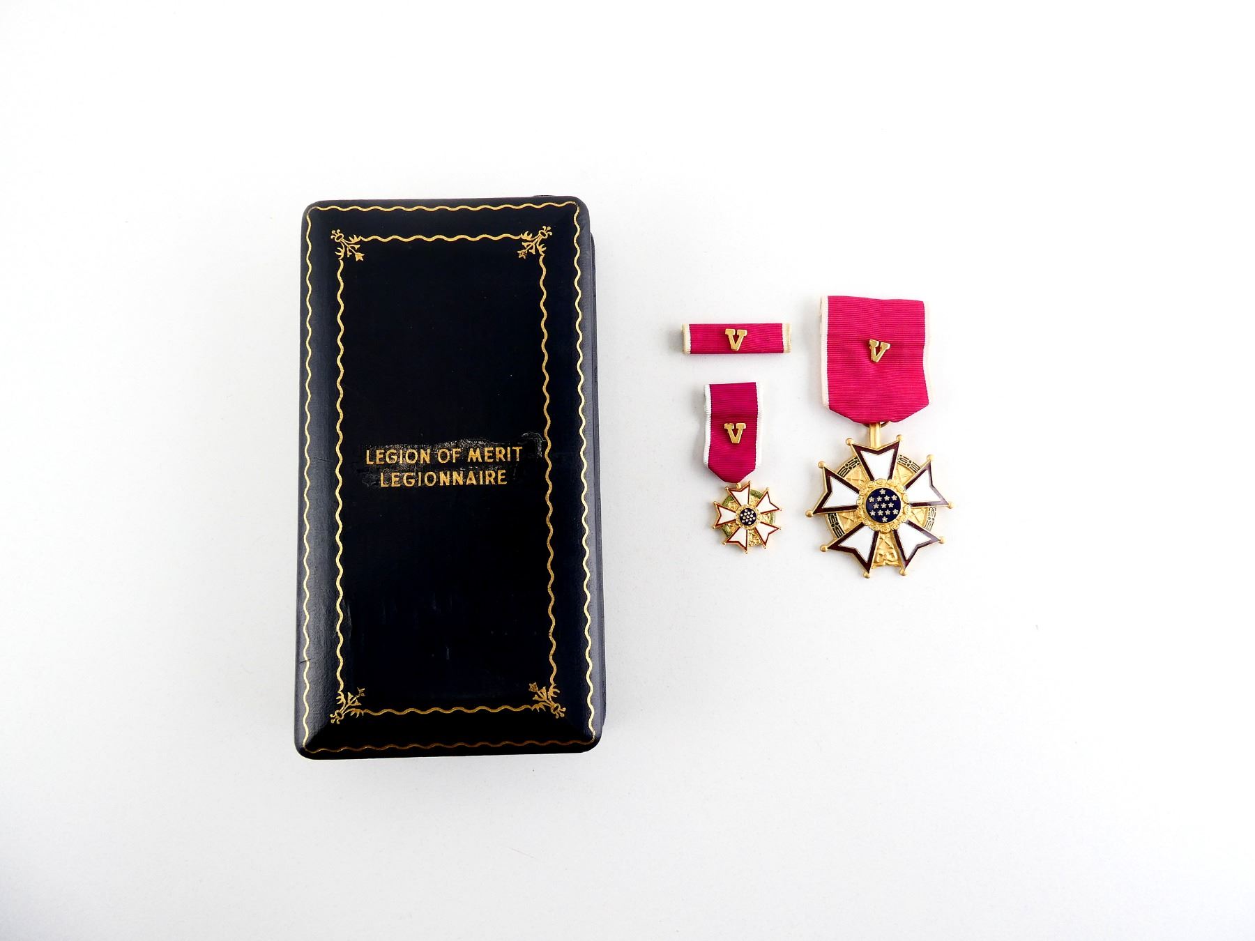 LOT INCLUDES; (1) FULL-SIZED LEGION OF MERIT LEGIONNAIRE MEDAL WITH RIBBON THAT HAS COMBAT "V" ON RIBBON WHICH DENOTES THE NAVY / MARINE CORPS / COAST GUARD, (1) MINIATURE LEGION OF MERIT LEGIONNAIRE MEDAL WITH RIBBON THAT HAS COMBAT "V" ON RIBBON WHICH DENOTES THE NAVY / MARINE CORPS / COAST GUARD, (1) LEGION OF MERIT LEGIONNAIRE RIBBON BAR WITH COMBAT "V" & (1) CONSIGNOR STATES: "WWII "COFFIN" CASE", CASE MARKED: "LEGION OF MERIT, LEGIONNAIRE" IN GOLD COLOURED WRITING WITH VARIOUS GOLD COLOURED DETAILS, CASE APPROX. 6.5" X 3.5" X 1.25". SEE PHOTOS.
