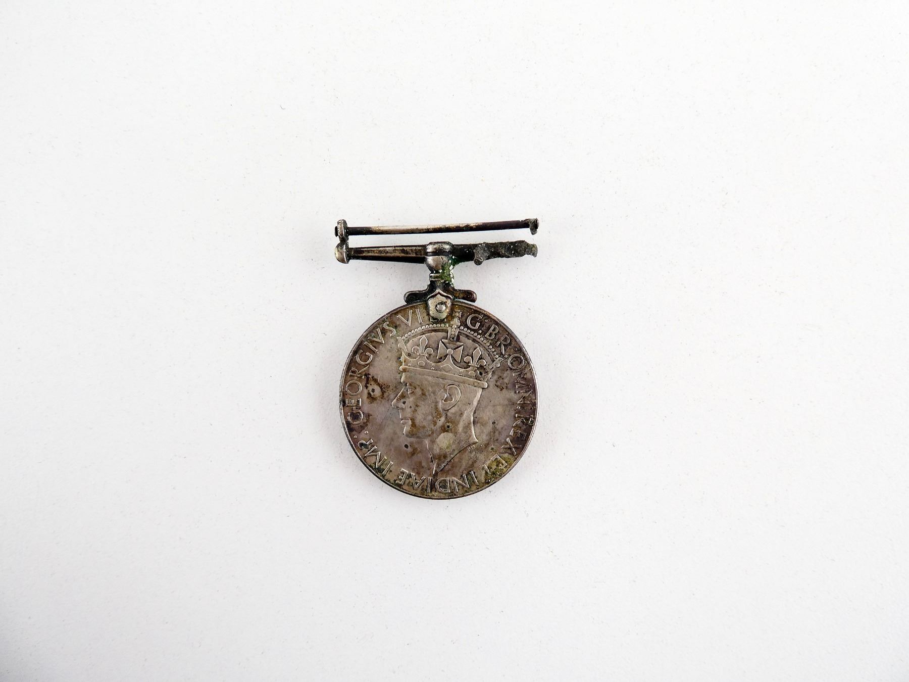 (1) 1939-1945 WAR MEDAL, MISSING RIBBON, CONSIGNOR STATES: ".800 SILVER, 35.6 GRAMS WHEN ISSUED, PRESENTED TO JACK KING - A MEMBER OF THE IRISH REGIMENT OF CANADA, RANK OF C.Q.M.S. - COMPANY QUARTERMASTER SERGEANT". SEE PHOTOS.