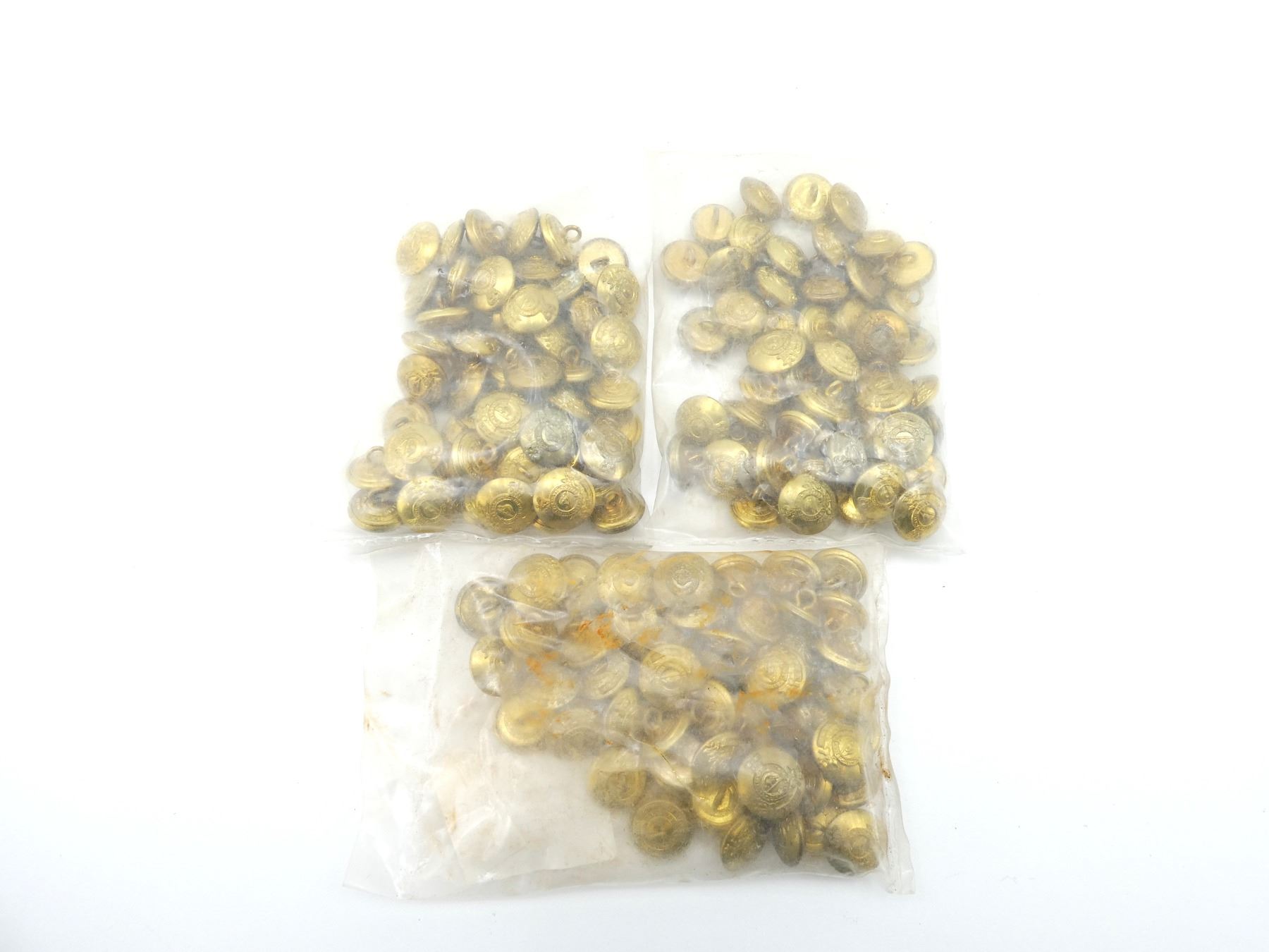 LOT INCLUDES; APPROX. (150) QUEEN'S CROWN BRASS ROYAL CANADIAN ARMY PAY CORPS (R.C.A.P.C.) BUTTONS, SMALL SIZE, NEW OLD STOCK, IN ORIGINAL UN-OPENED PACKAGING. SEE PHOTOS.