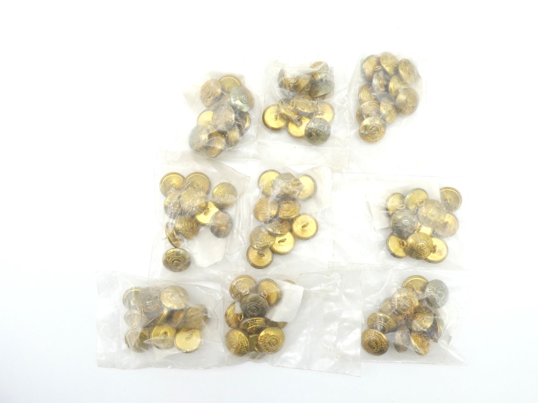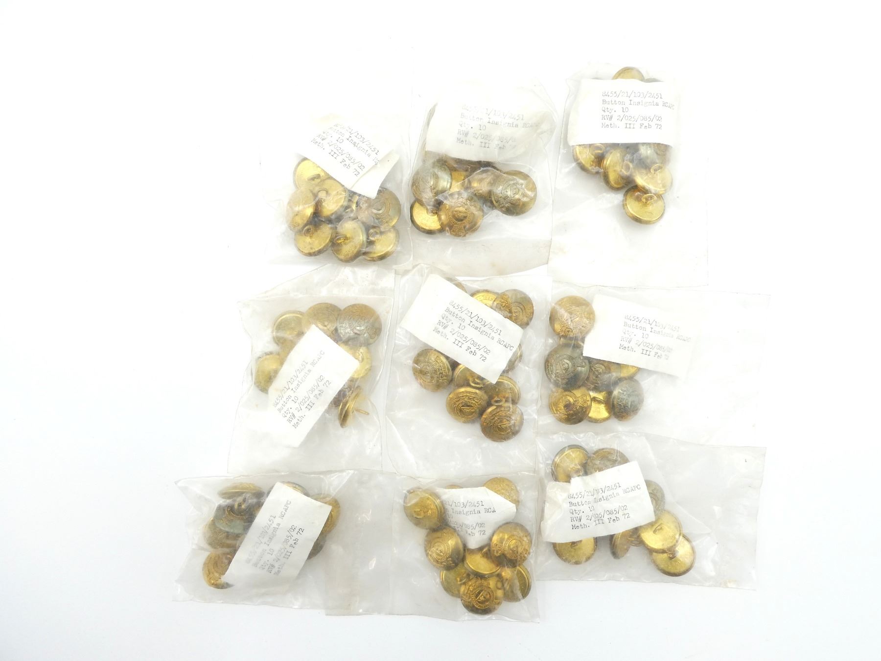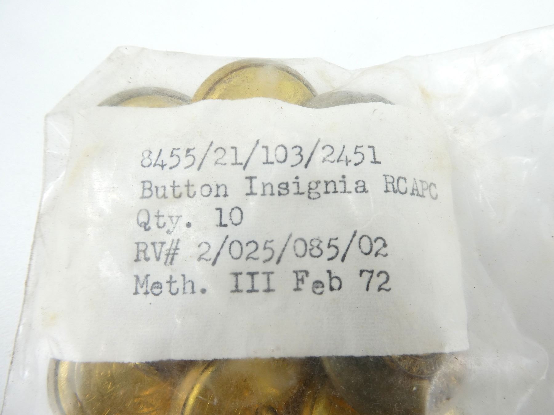 LOT INCLUDES; APPROX. (90) QUEEN'S CROWN BRASS ROYAL CANADIAN ARMY PAY CORPS (R.C.A.P.C.) BUTTONS, LARGE SIZE, NEW OLD STOCK, IN ORIGINAL UN-OPENED PACKAGING. SEE PHOTOS.