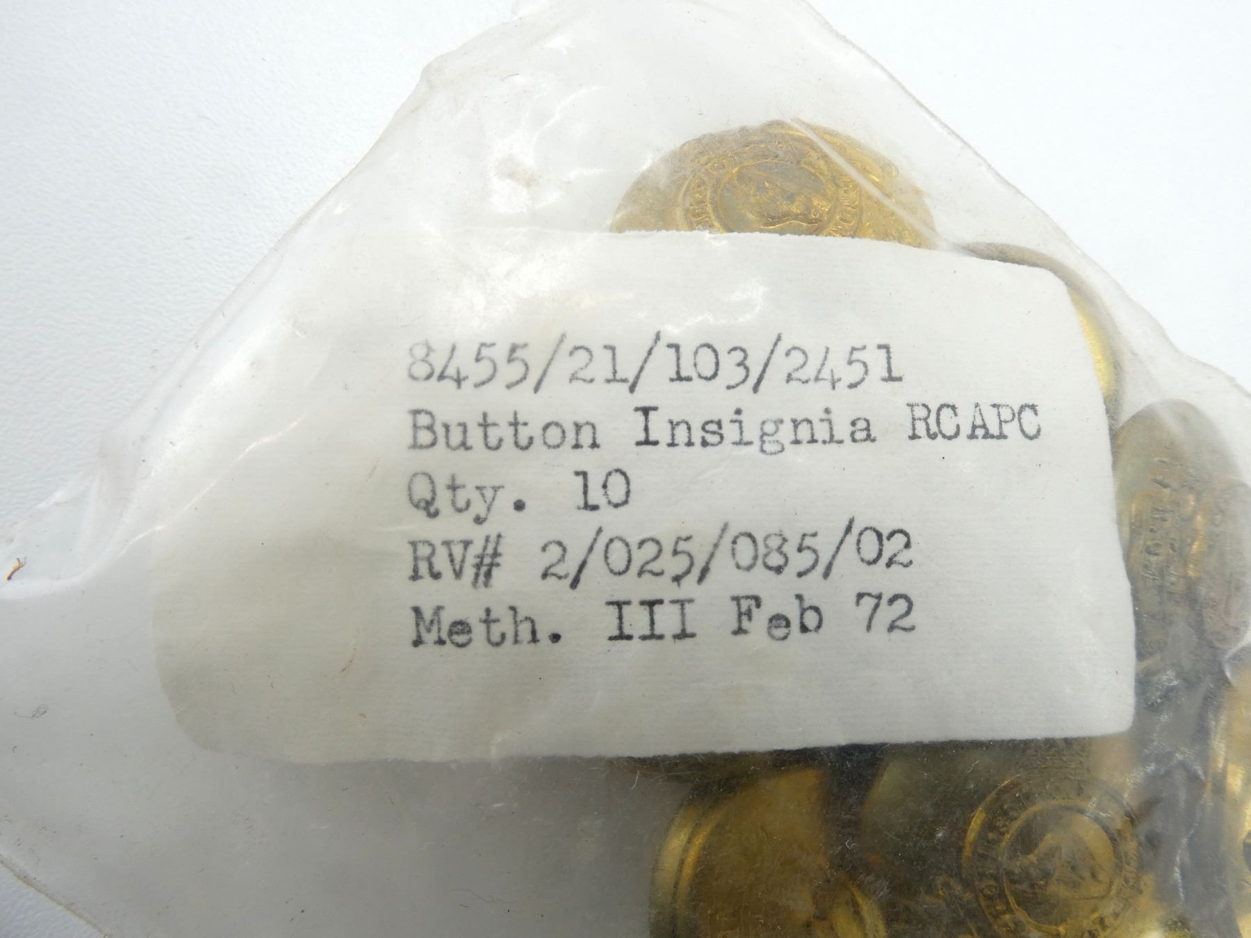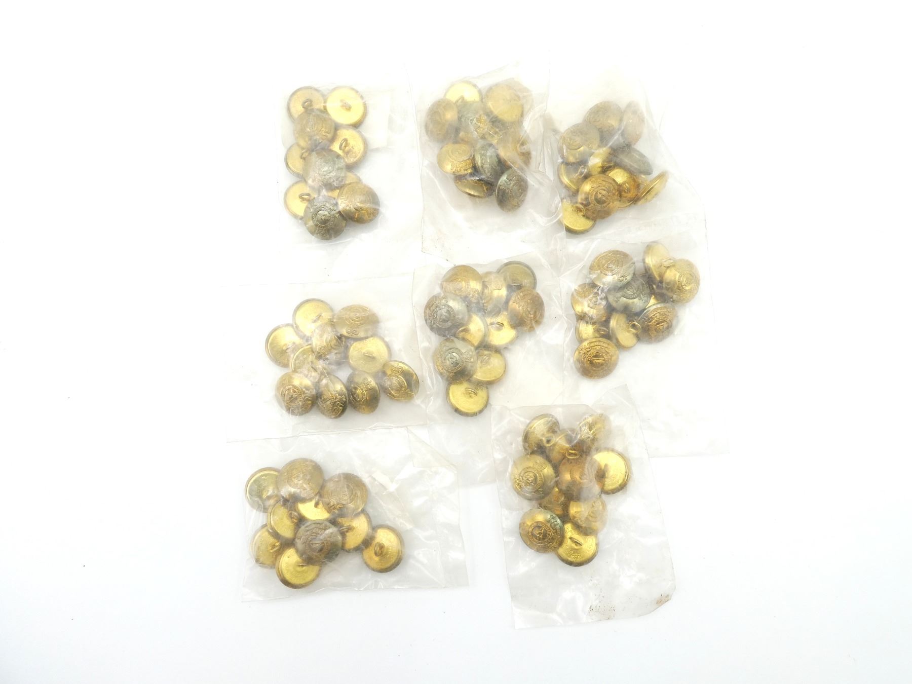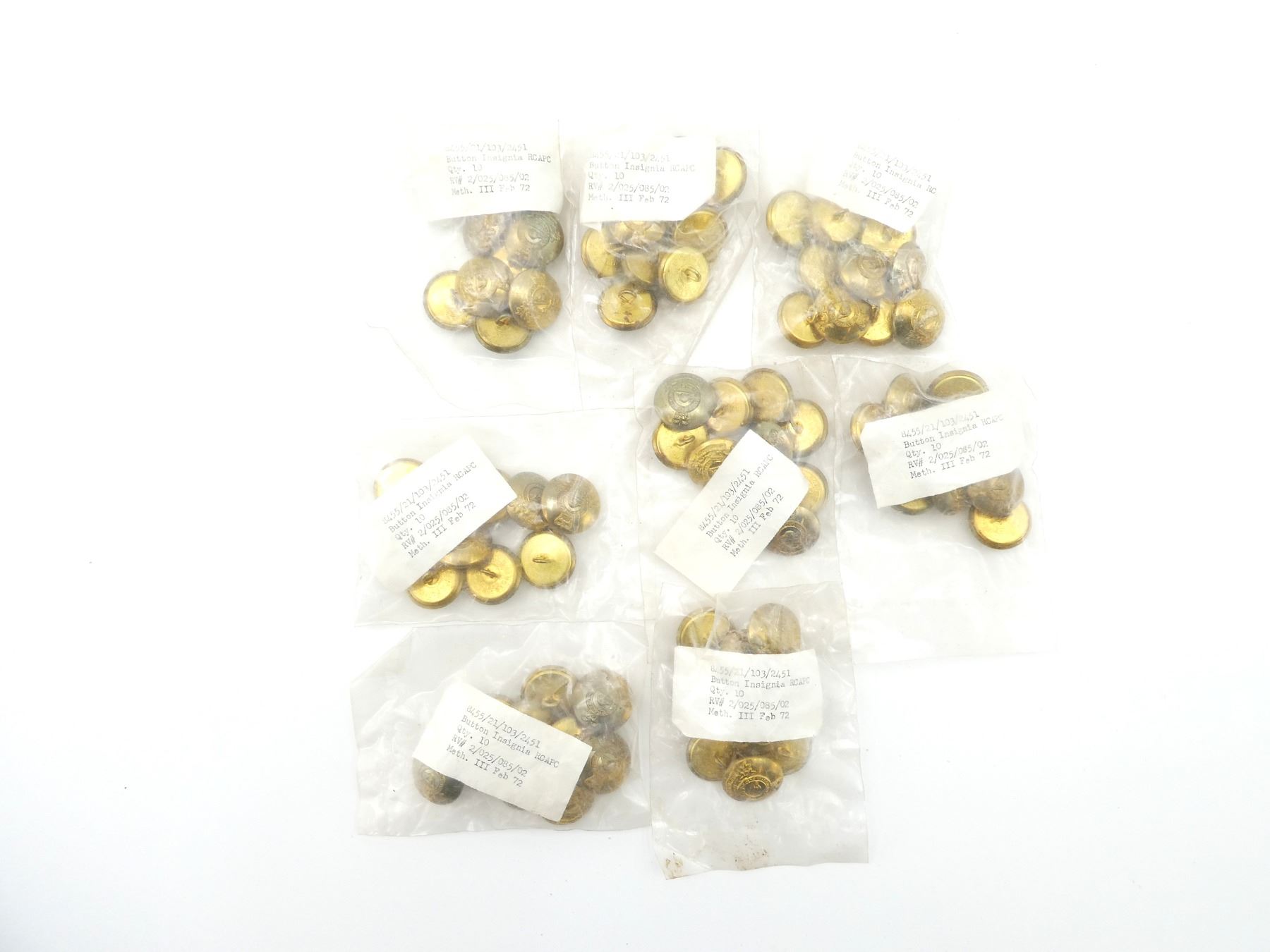 LOT INCLUDES; APPROX. (80) QUEEN'S CROWN BRASS ROYAL CANADIAN ARMY PAY CORPS (R.C.A.P.C.) BUTTONS, LARGE SIZE, NEW OLD STOCK, IN ORIGINAL UN-OPENED PACKAGING. SEE PHOTOS.
