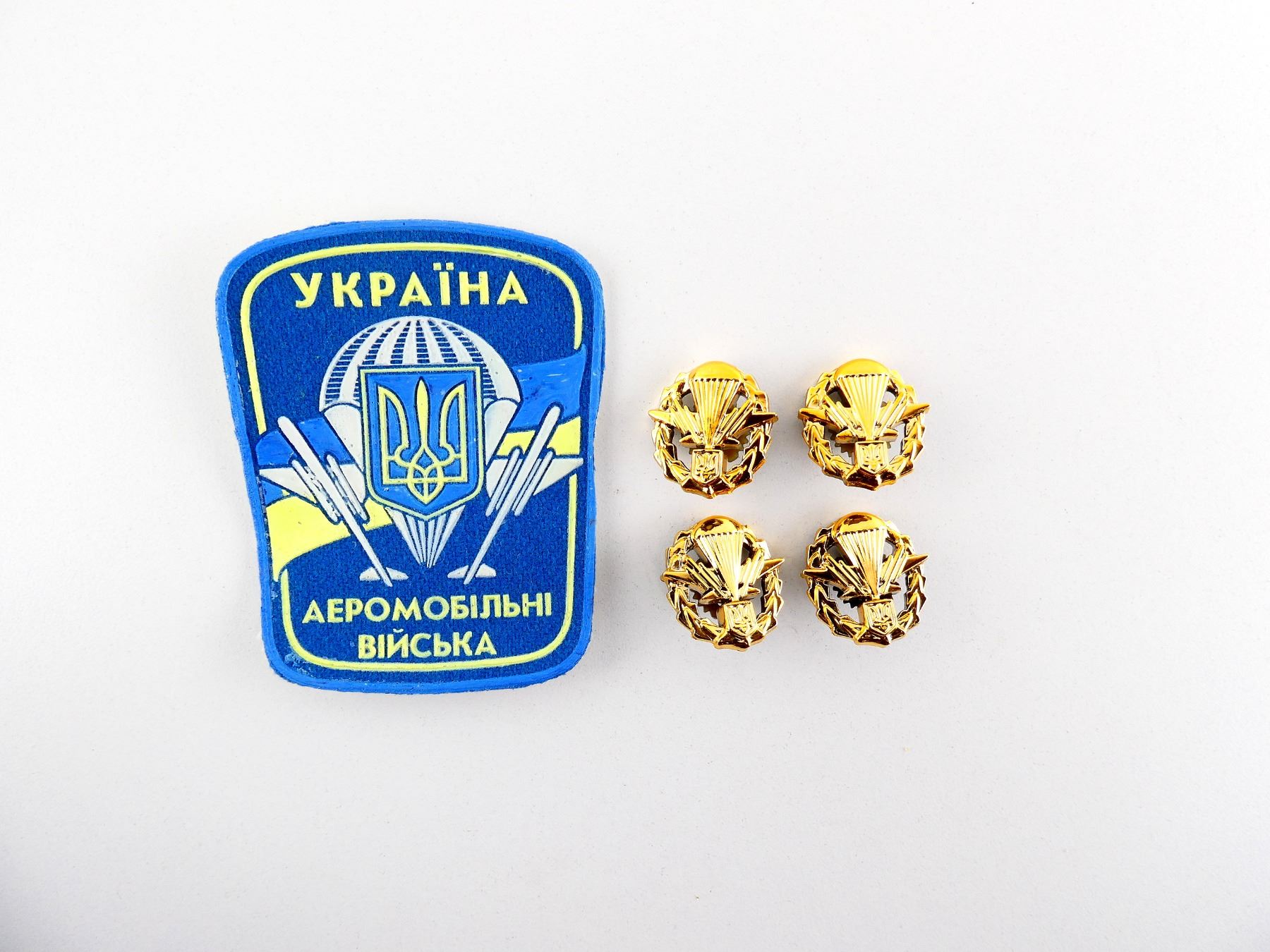 LOT INCLUDES; (1) UKRAINIAN AIRBORNE FORCES BADGE & (4) UKRAINIAN AIRBORNE FORCES COLLAR DOGS, GOLD COLOURED PLASTIC. SEE PHOTOS.