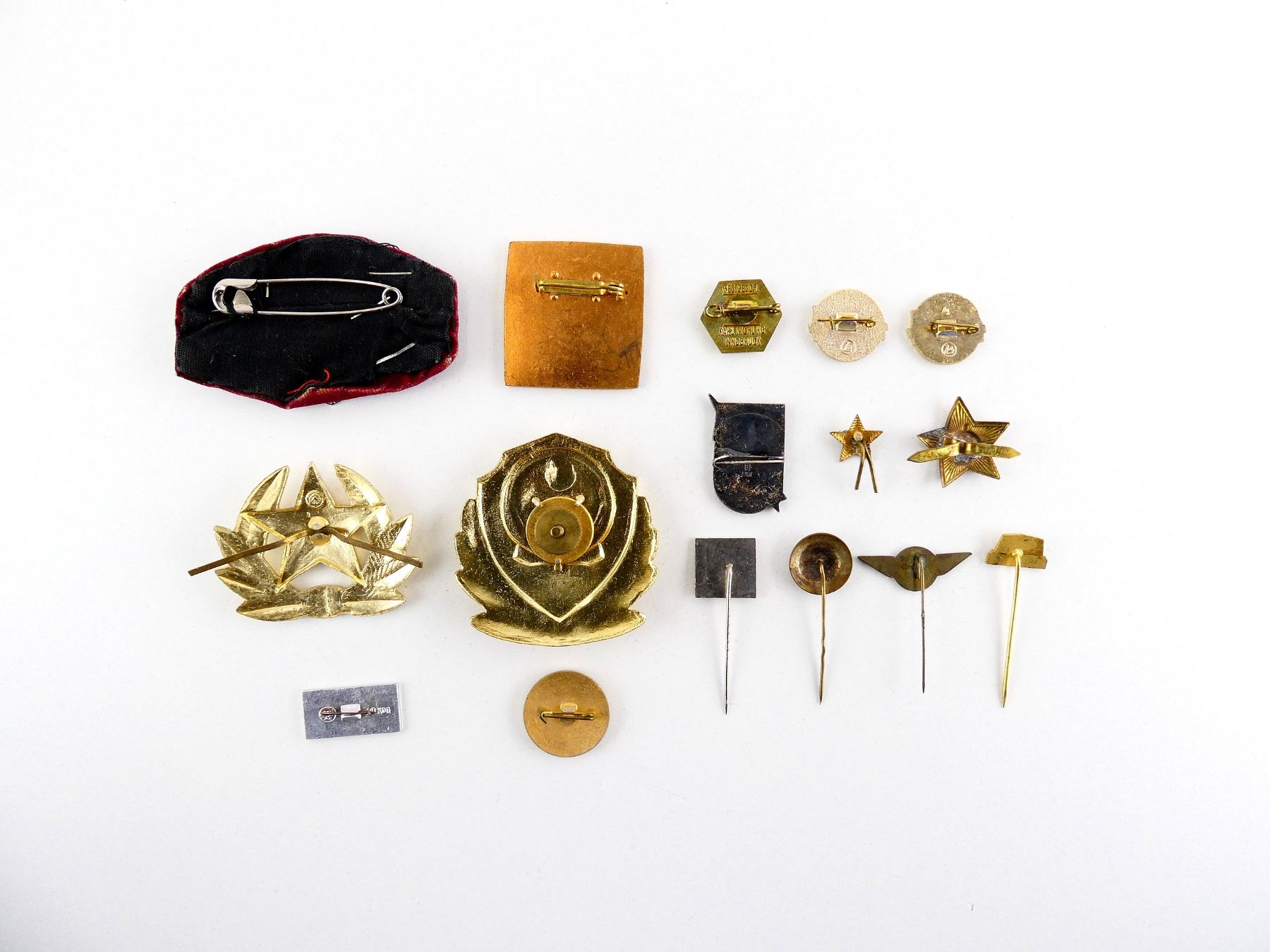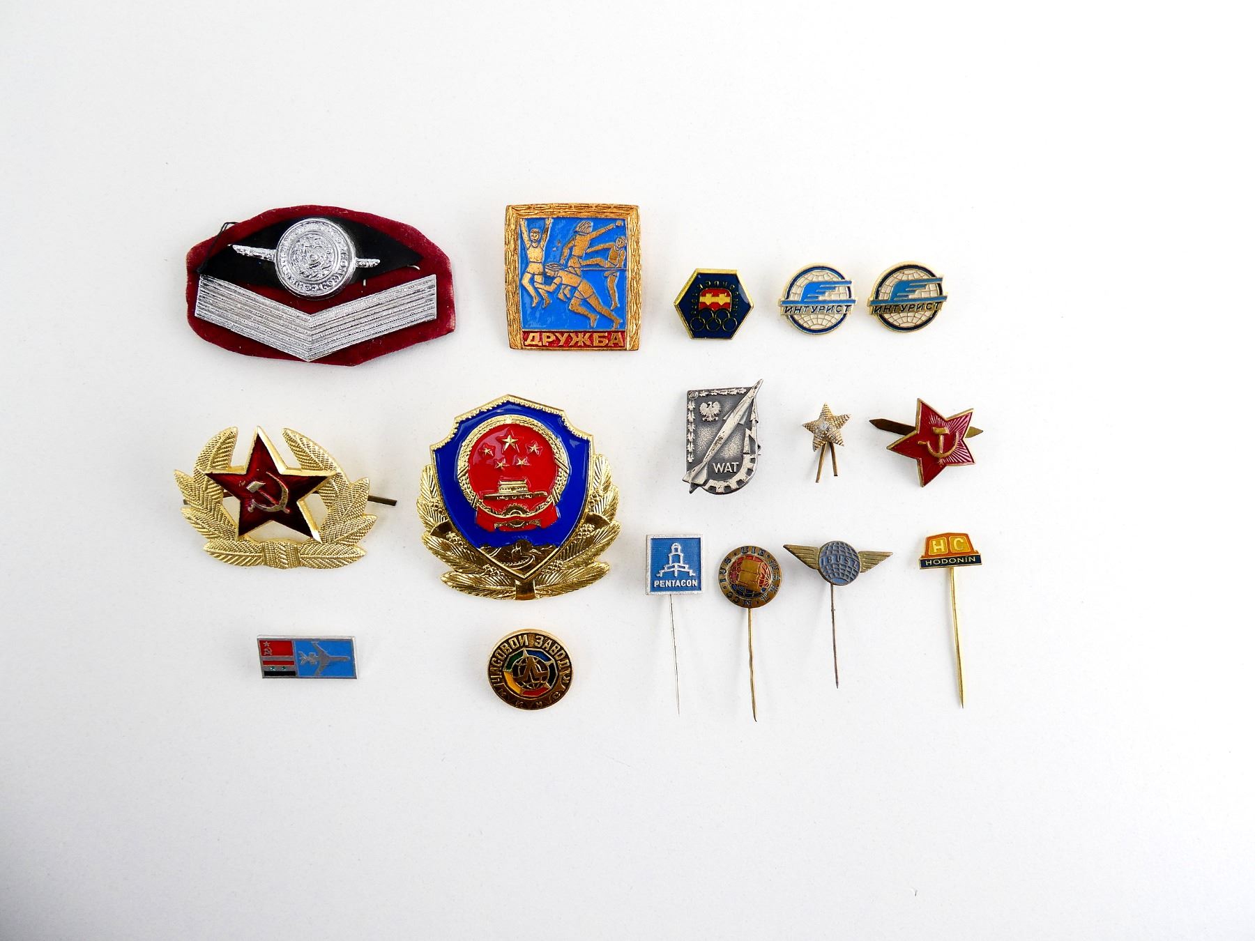 APPROX. (16) PIECES, VARIOUS COUNTRIES, VARIOUS SIZES / MATERIALS, LOT INCLUDES; RUSSIAN MILITARY RED ENAMELED STAR WITH HAMMER / SICKLE PIN, RUSSIAN MILITARY STAR PIN, CHINESE MILITARY CAP BADGE, RUSSIAN MILITARY CAP BADGE, VINTAGE RUSSIAN / SOVIET ERA FRIENDSHIP ENAMELED PIN, VINTAGE RUSSIAN / SOVIET AVIATION BADGE, VINTAGE RUSSIAN / SOVIET INTOURIST TRAVEL AGENCY PINS, 1976 INNSBRUCK AUSTRIA WINTER OLYMPICS PIN, VINTAGE POLISH MILITARY UNIVERSITY OF TECHNOLOGY BADGE, ETC. SEE PHOTOS.