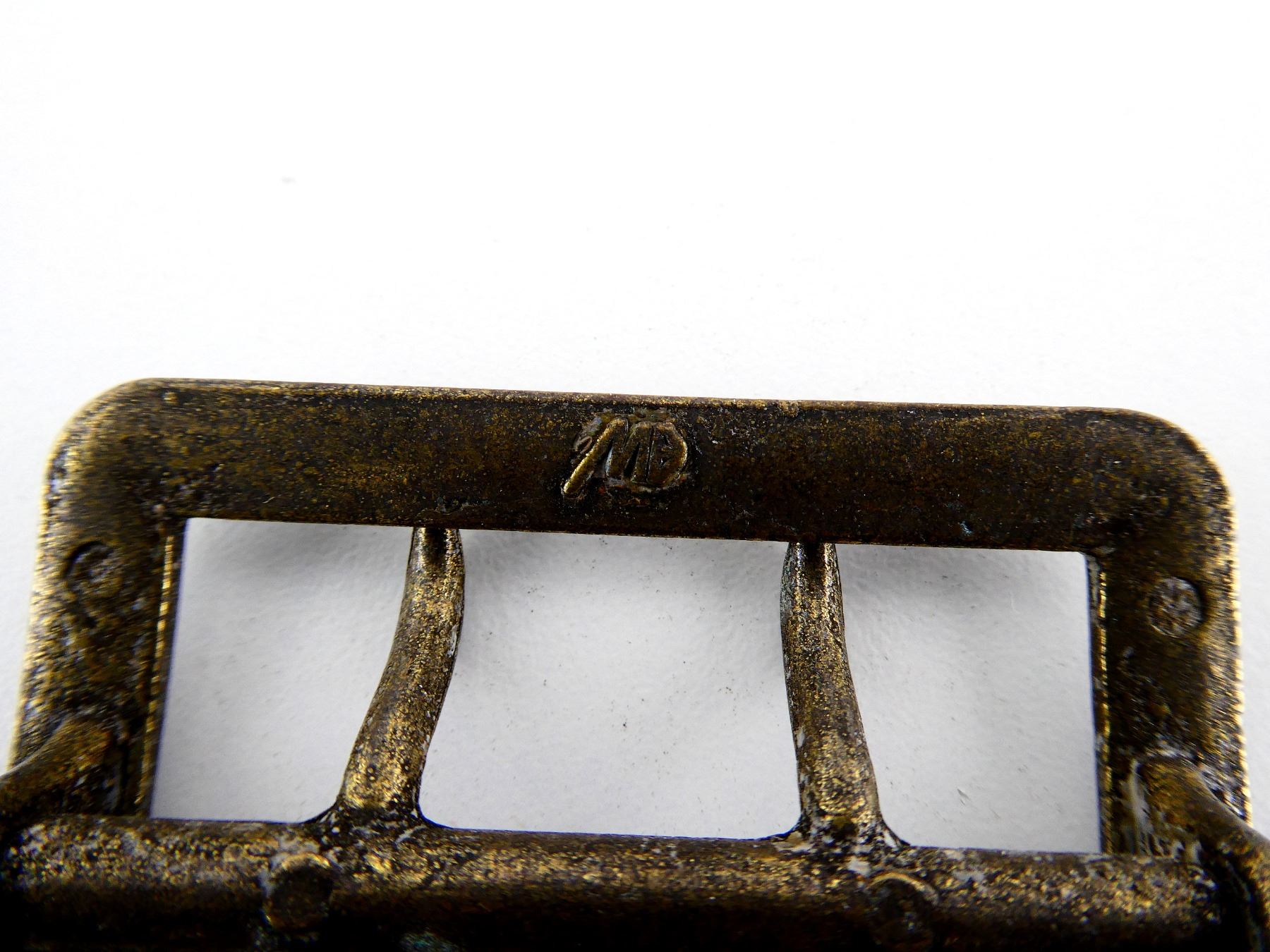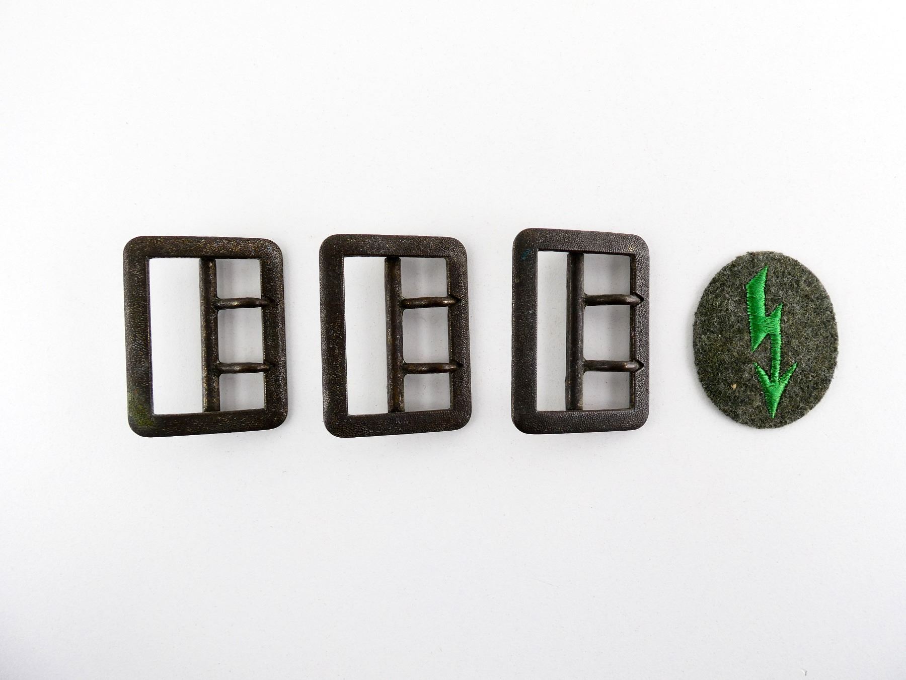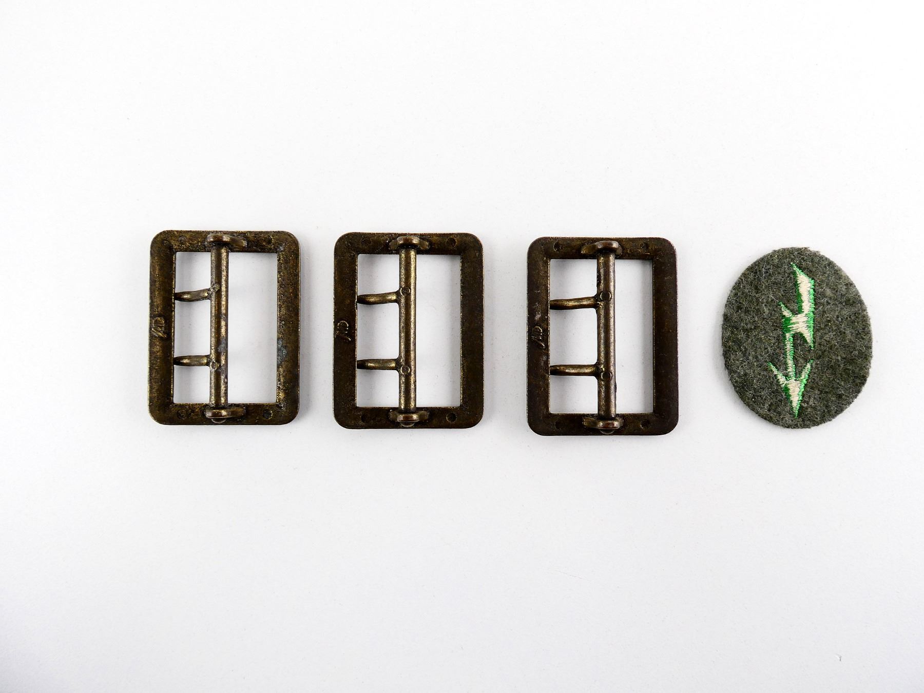 LOT INCLUDES; (3) BRASS PEBBLED BELT BUCKLES, TWO PRONGED, RECTANGULAR SHAPED, MAKER'S MARKS ON BACK & (1) PANZER GRENADIER SIGNALS TRADE BADGE, GREEN THREADING WITH GREY WOOL BACKING, DOES NOT APPEAR TO GLOW UNDER BLACK LIGHT. SEE PHOTOS.
