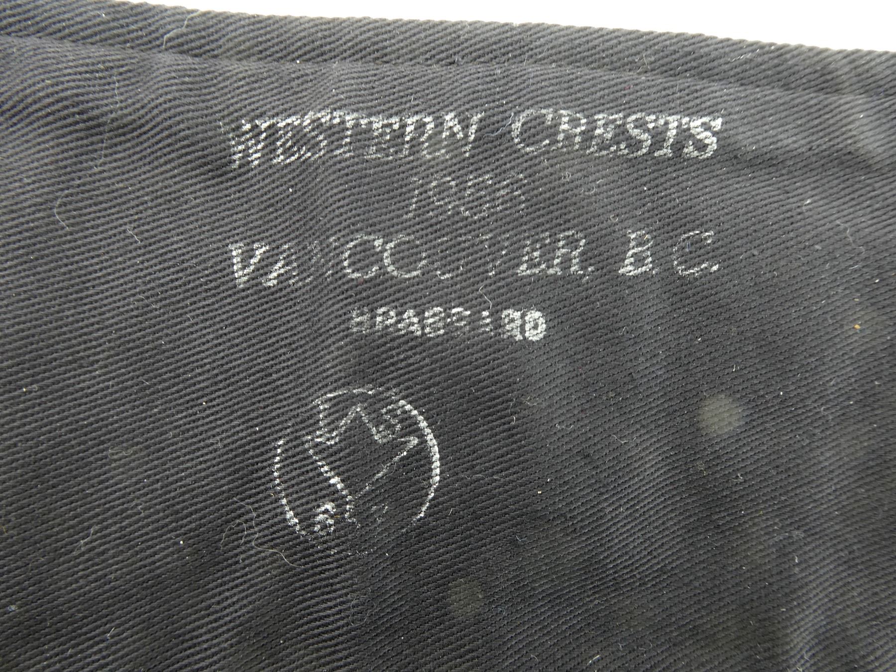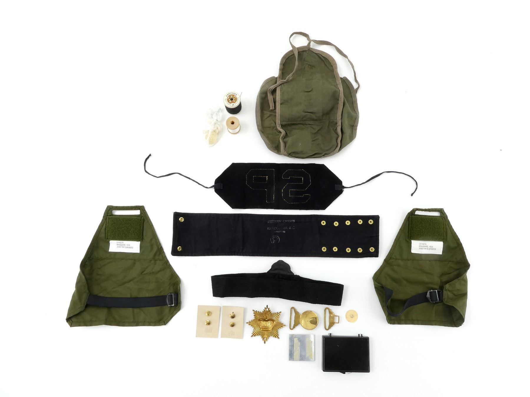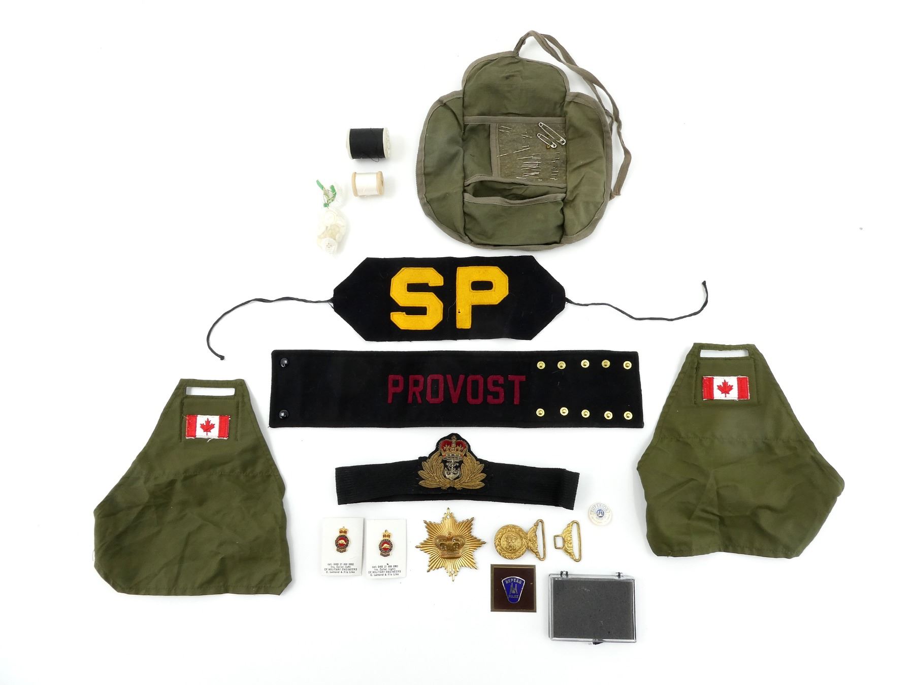 APPROX. (11) PIECES, INCLUDES; U.S. NAVY SHORE PATROL ARM BAND, 1956 CANADIAN PROVOST CORPS ARM BAND, CANADIAN / BRITISH MILITARY BRASS VICTORIAN CROWN SHAKO / HELMET BADGE, 1955 CANADIAN MILITARY SEWING KIT (HOUSE WIFE), CANADIAN MILITARY PAIR OF ENGINEER COLLAR BADGES (LEFT / RIGHT), CANADIAN GREEN NYLON BRASSARDS WITH CANADIAN FLAG BADGES, CANADIAN MILITARY QUEEN'S CROWN NAVAL WIRE BULLION ATTACHED TO CAP BAND, REPRODUCTION 1850'S U.S. NAVY BRASS DRESS BELT BUCKLE, ETC. SEE PHOTOS.
