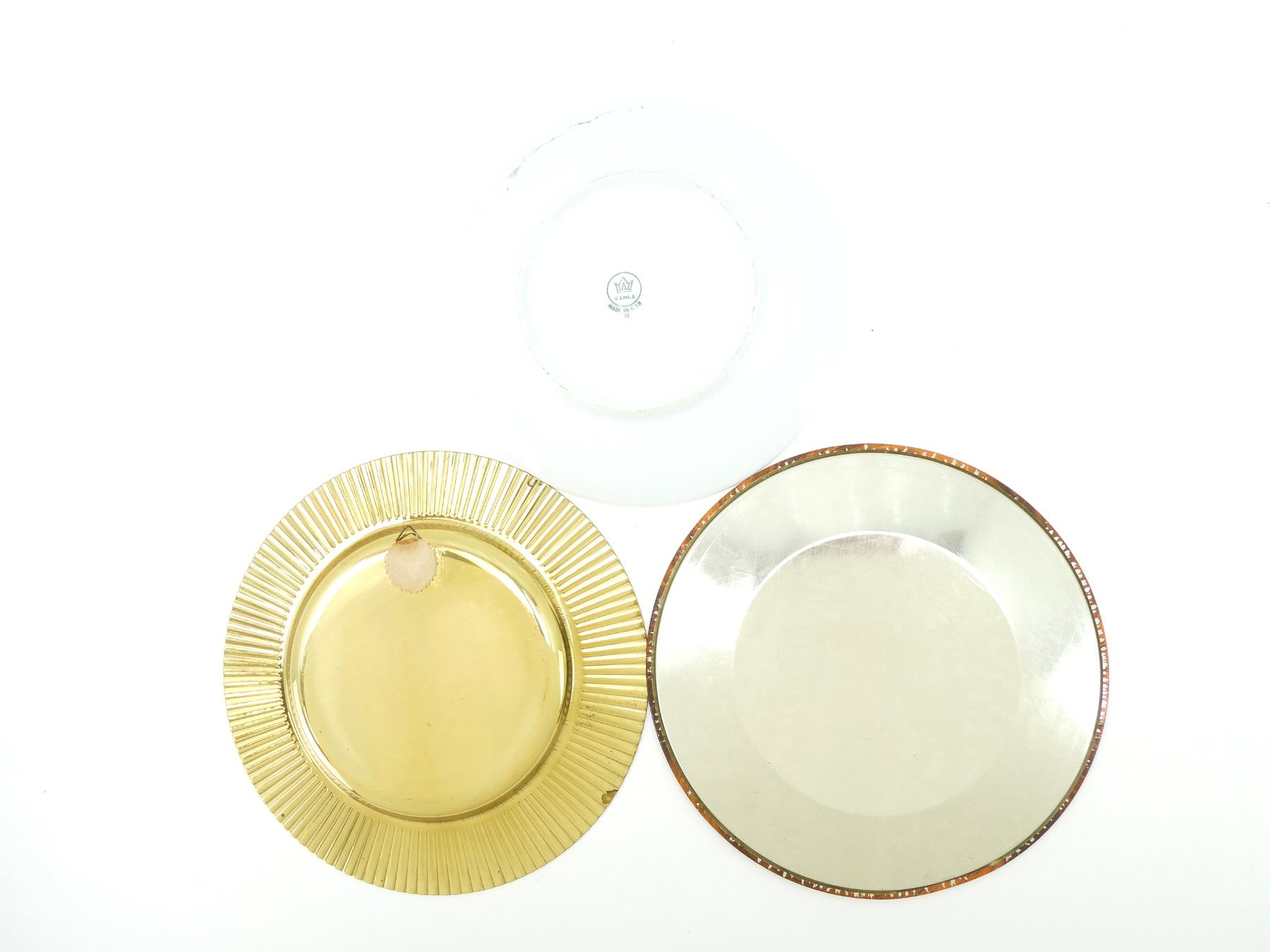 LOT INCLUDES; (1) EAST GERMAN POLICE COMMEMORATIVE PLATE, MARKED: "40 JAHRE, DEUTSCHE VOLKSPOLIZEI (40 YEARS GERMAN PEOPLE'S POLICE)" WITH EAST GERMAN POLICE SYMBOL, MAKER'S MARK ON BACK OF PLATE, APPROX. 7 5/8" DIA., (1) EAST GERMAN COMMEMORATIVE BRASS WITH RED CENTER WALL PLATE, RED CENTER MARKED: "FUR DEUTSCH-SOWJETISCHE FREUNDSCHAFT (FOR GERMAN-SOVIET FRIENDSHIP)", HANGER ON BACK, NO VISIBLE MAKER'S MARK, APPROX. 8.25" DIA. & (1) EAST GERMAN MAGNETIC METAL COMMEMORATIVE PLATE WITH WOOD LIKE PATTERN, MARKED: "BEZIRK, POTSDAM, KAMPFGRUPPENBATAILLONE (M) (DISTRICT POTSDAM COMBAT GROUP BATTALIONS)", TOP CREST MARKED: "25 YEARS OF THE WORKERS' COMBAT GROUPS", HANS BEIMLER CREST, ARTUR LADWIG CREST, PETER LAMBERZ CREST & BRUNO BAUM CREST, NO VISIBLE MAKER'S MARKS, APPROX. 8 1/8" DIA. SEE PHOTOS.
