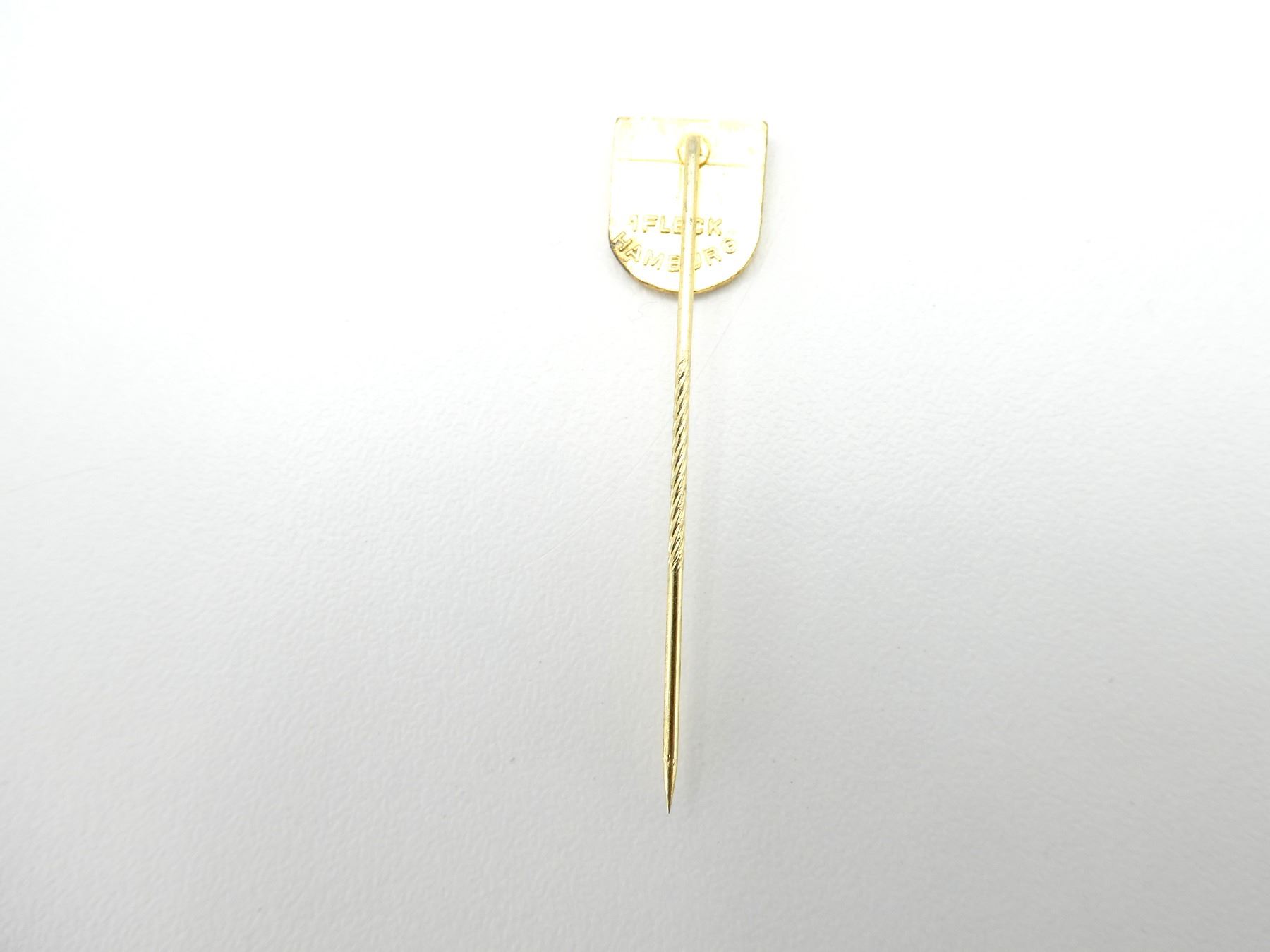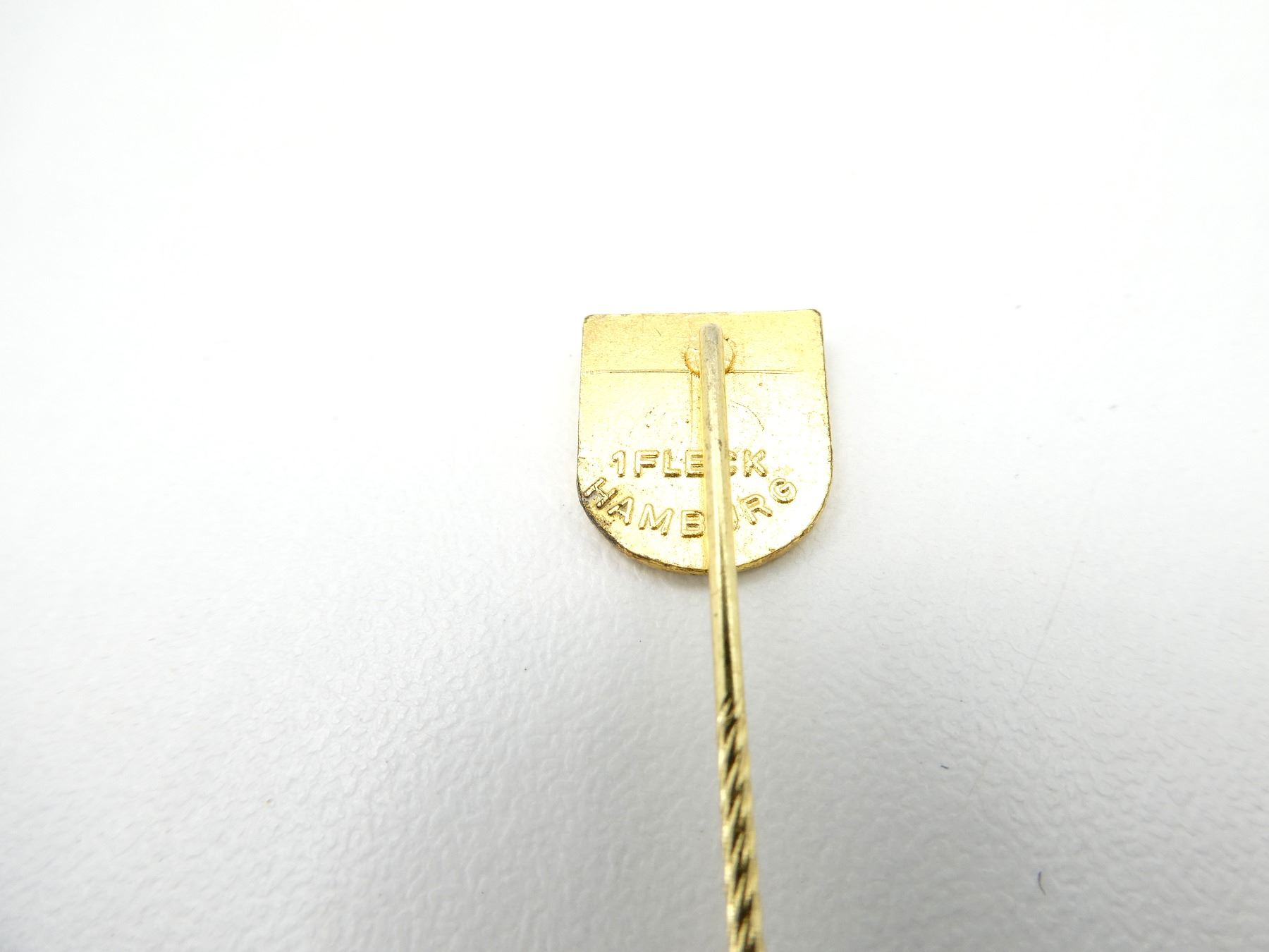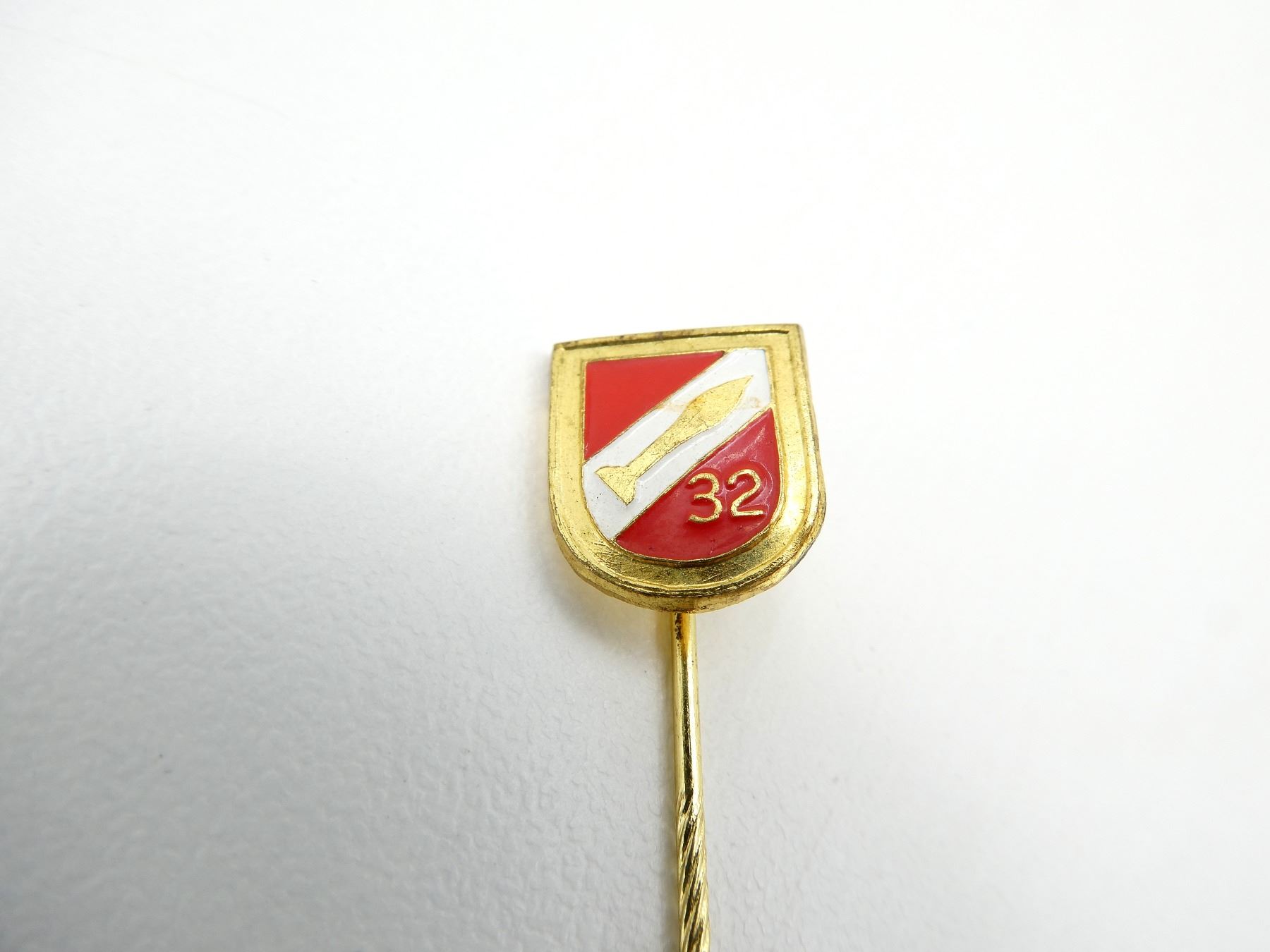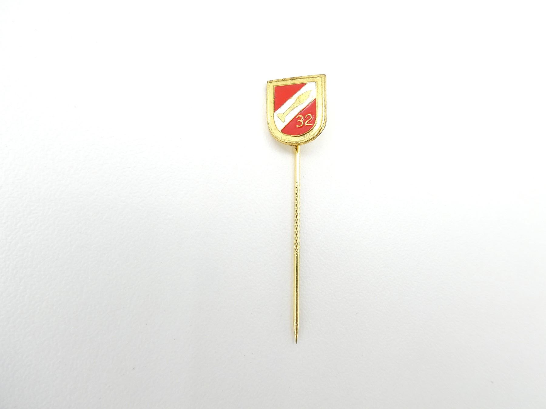 (1) BRASS PIN WITH RED / WHITE ENAMELED FRONT, FRONT MARKED WITH ROCKET SYMBOL OVER "32", BACK MARKED: "1FLECK, HAMBURG", STICK PIN INTACT. SEE PHOTOS.