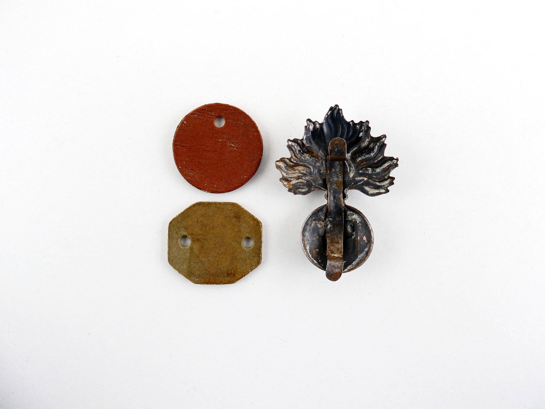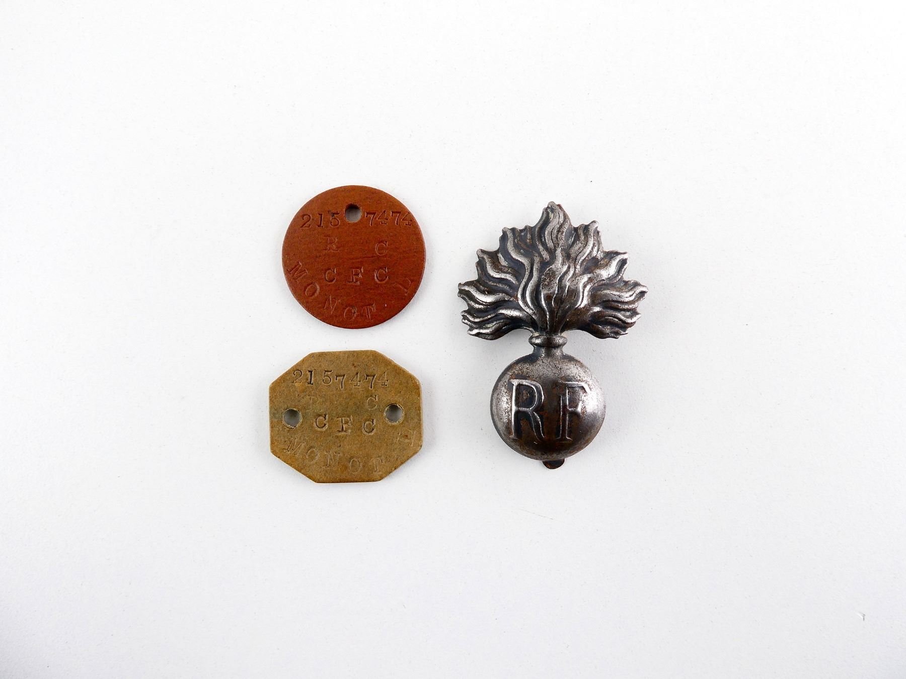 LOT INCLUDES; (1) SET OF DOG TAGS, ONE ROUND HARD BOARD, APPROX. 35MM DIA., MARKED: "2157474, RC, CFC, MONOT L", ONE 8-SIDED HARD BOARD, APPROX. 37MM L X 36MM W, MARKED: "2157474, RC, CFC, MONOT L" & (1) WWI FRENCH REPUBLIC FLAMING BOMB CAP BADGE, FRONT MARKED: "RF (FRENCH REPUBLIC)", RECORDS AVAILABLE THRU GOVERNMENT OF CANADA DATABASE. SEE PHOTOS.