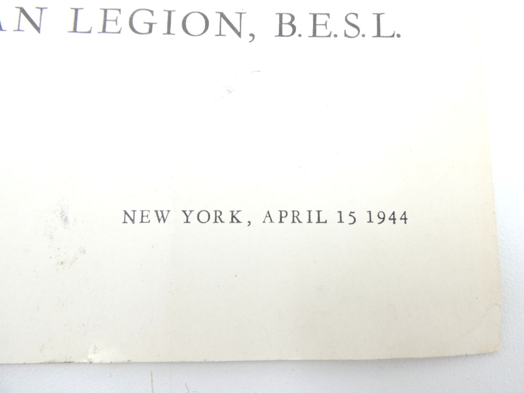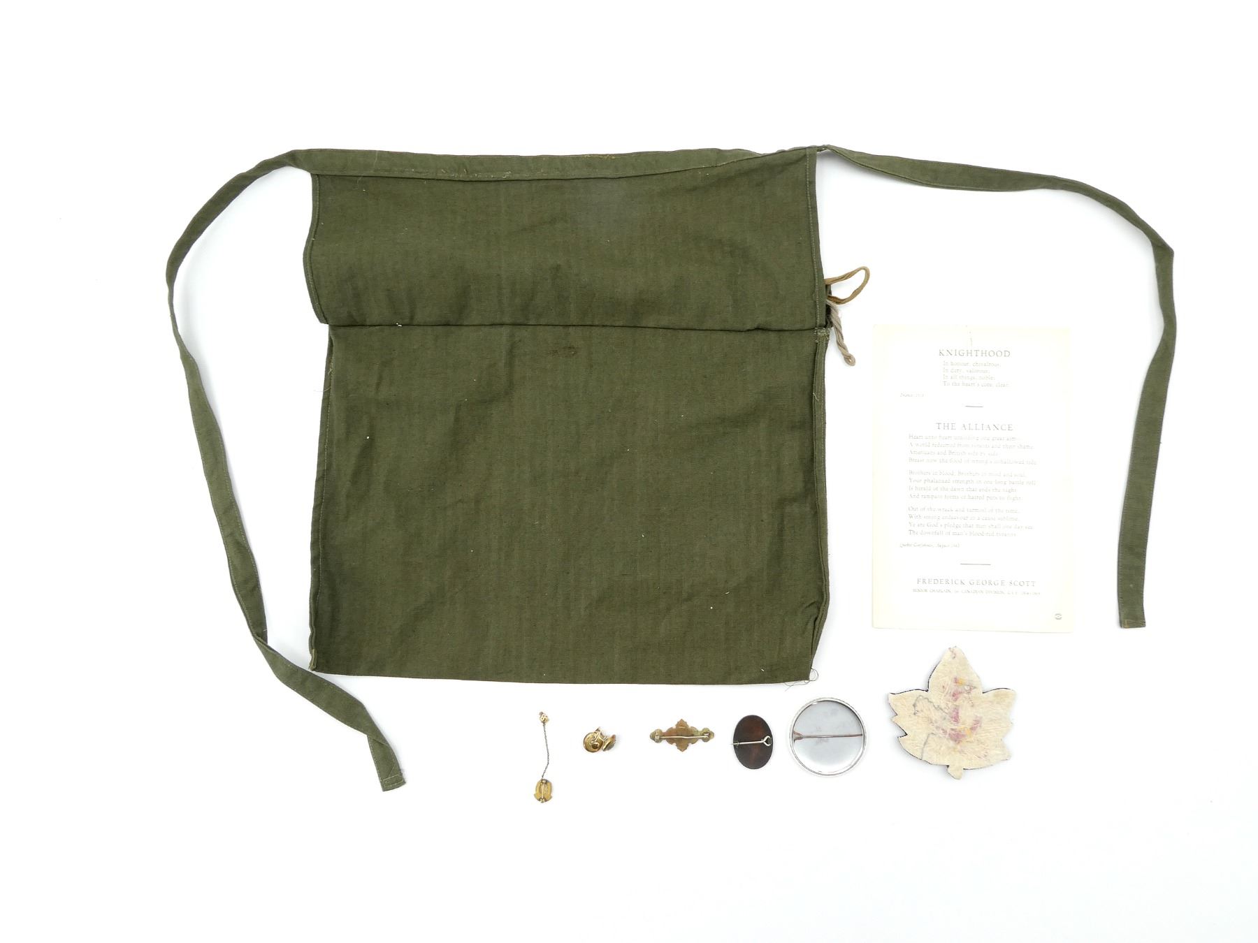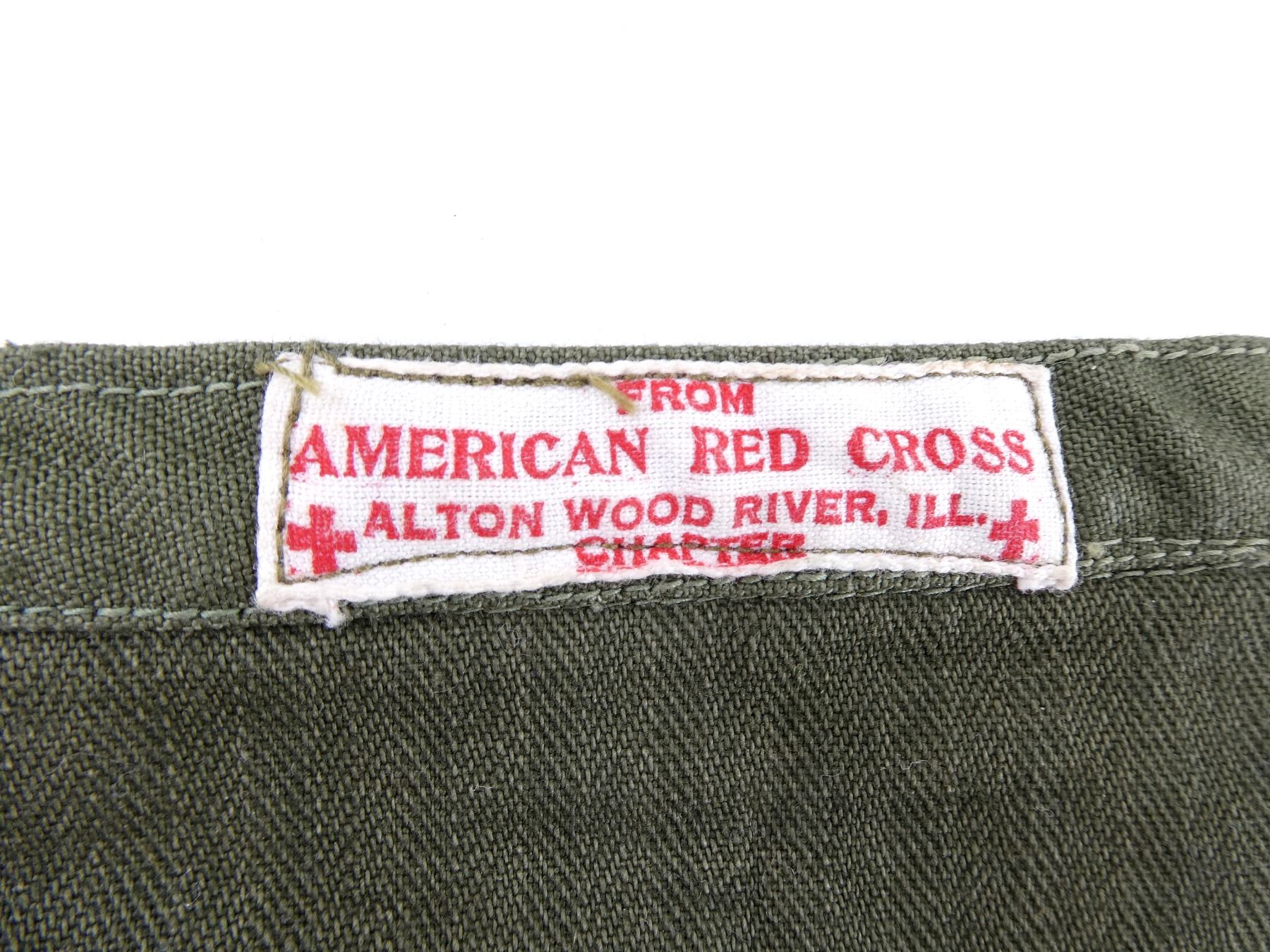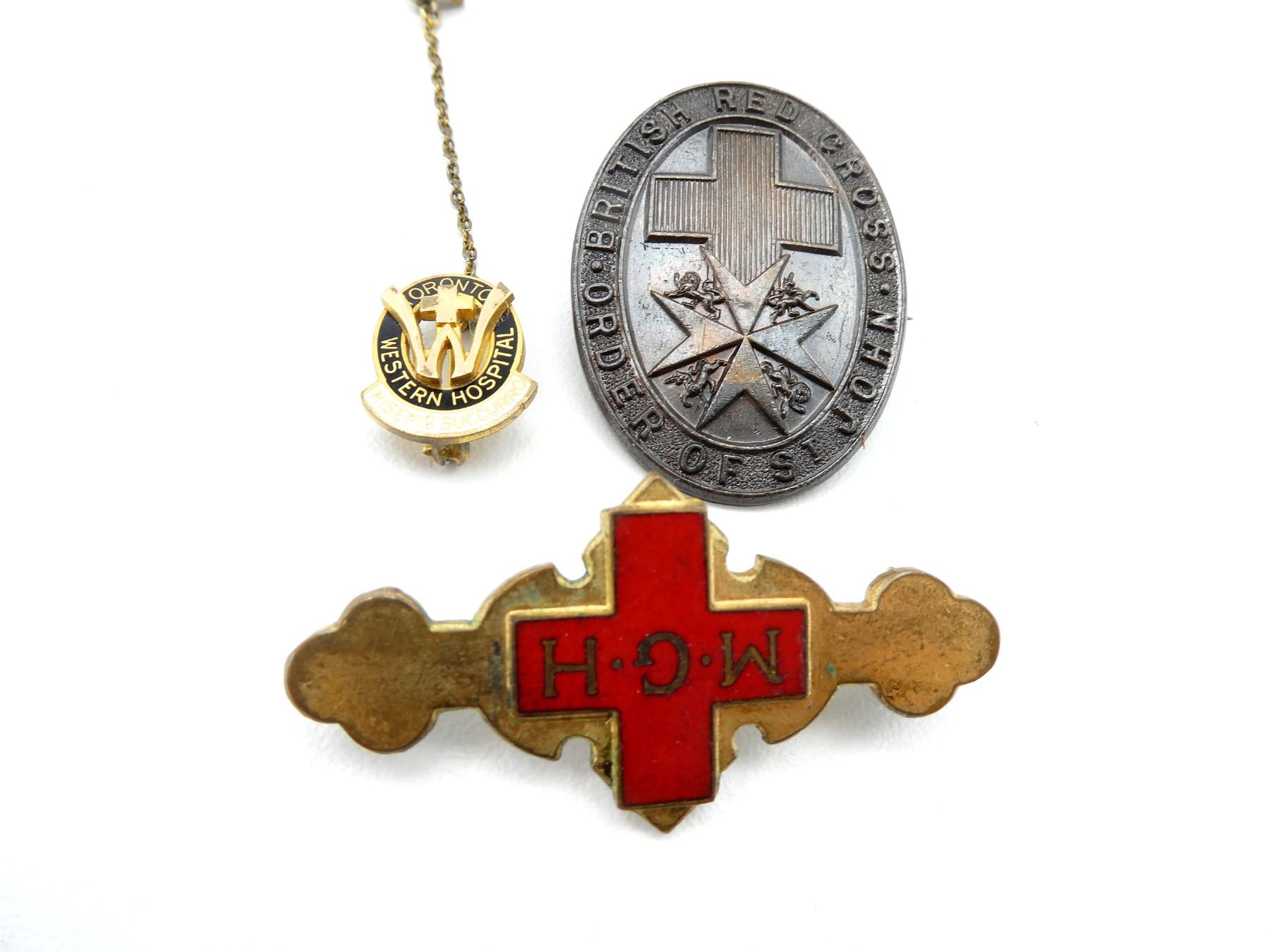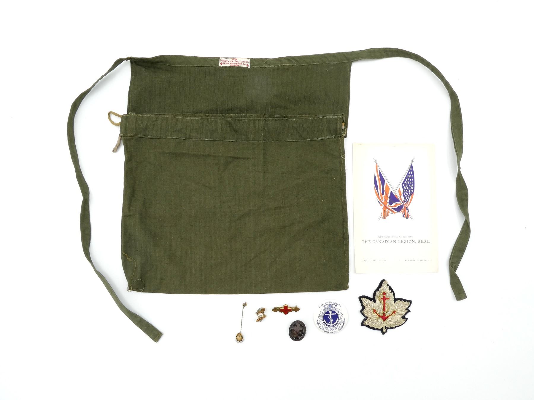 LOT INCLUDES; (1) WWII ERA "NEW YORK (U.S.A. NO. 120) POST, THE CANADIAN LEGION, B.E.S.L., ANNUAL INSTALLATION" PAMPHLET, DATED: "NEW YORK, APRIL 15 1944", VARIOUS POEMS ON PAMPHLET, (1) RCN ASSOCIATION BLAZER WIRE BULLION, (1) 25TH ANNIVERSARY RCN ASSOCIATION PIN, (1) PAIR OF RCN EARRINGS, BRASS BUTTONS WITH CROWNS TURNED INTO EARRINGS, FAINT MARKINGS ON EARRING BACKINGS, (1) WWII BRITISH RED CROSS / ORDER OF ST. JOHN BREAST BADGE, PIN BACKING INTACT, NO VISIBLE MARKER'S MARKS, (1) GENERAL HOSPITAL GRADUATE NURSE PIN, ENAMELED RED CROSS MARKED: "M.G.H", BACK MARKED: "B.J.S.", "BIRKS", PIN INTACT, (1) TORONTO WESTERN HOSPITAL GOLD 194 NURSES GRADUATION PIN WITH CHAIN, END OF CHAIN HAS "48" PIN, BACK MARKED: "EDWARS", "G&F", PINS INTACT & (1) AMERICAN RED CROSS CARRYING BAG, GREEN CANVAS, DRAWSTRING TOP, TWO STRAPS / TIES, LABEL MARKED: "FROM AMERICAN RED CROSS, ALTON WOOD RIVER, ILL., CHAPTER" WITH RED CROSS SYMBOLS, APPROX. 11.5" X 14.5". SEE PHOTOS.