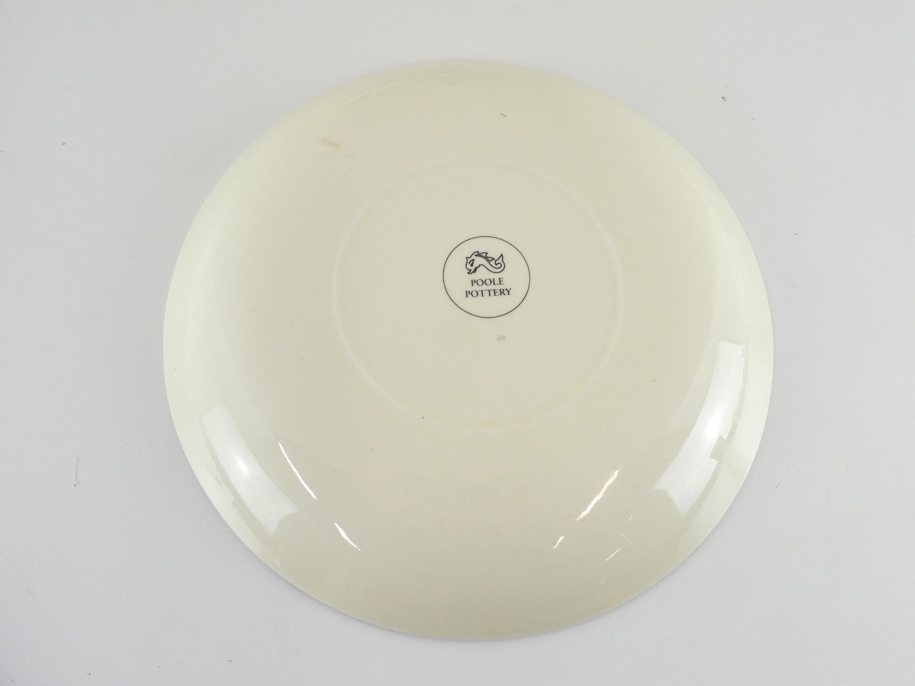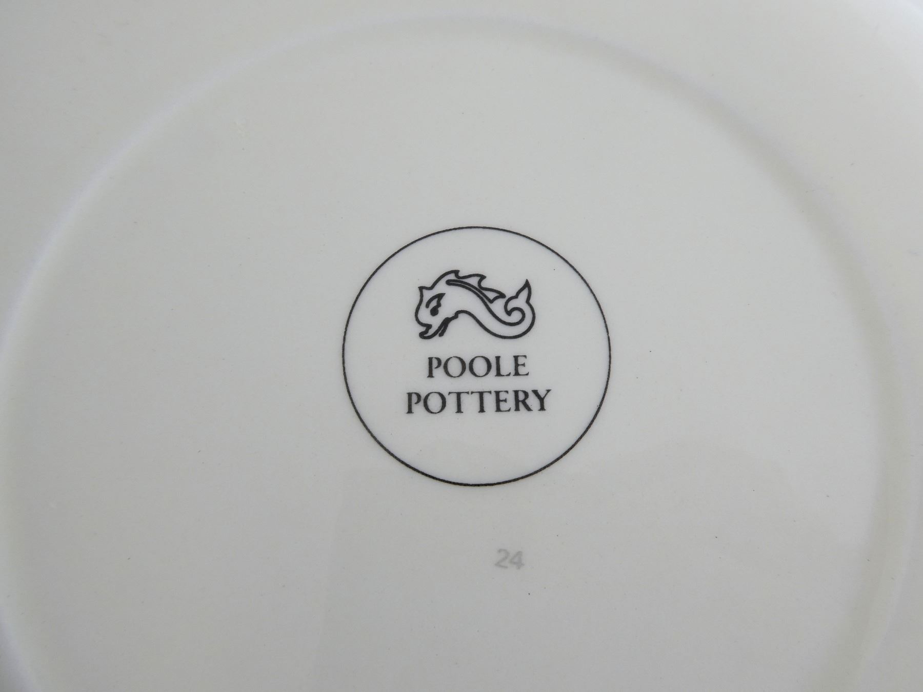 (1) PLATE COMMEMORATING D-DAY, PLATE DEPICTS CANADIAN, BRITISH, U.S., FRANCE, AUSTRALIAN FLAGS, VARIOUS SOLDIERS LANDING & LOCATIONS IN NORMANDY, BACK SIDE MARKED: "POOLE, POTTERY" WITH MAKER'S MARK, APPROX. 8 3/8" DIA. SEE PHOTOS.