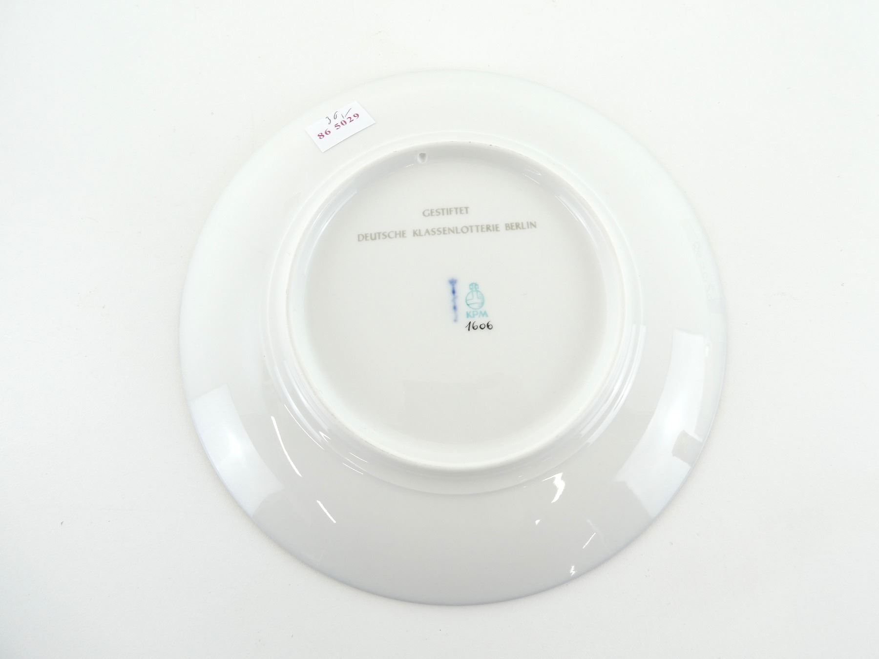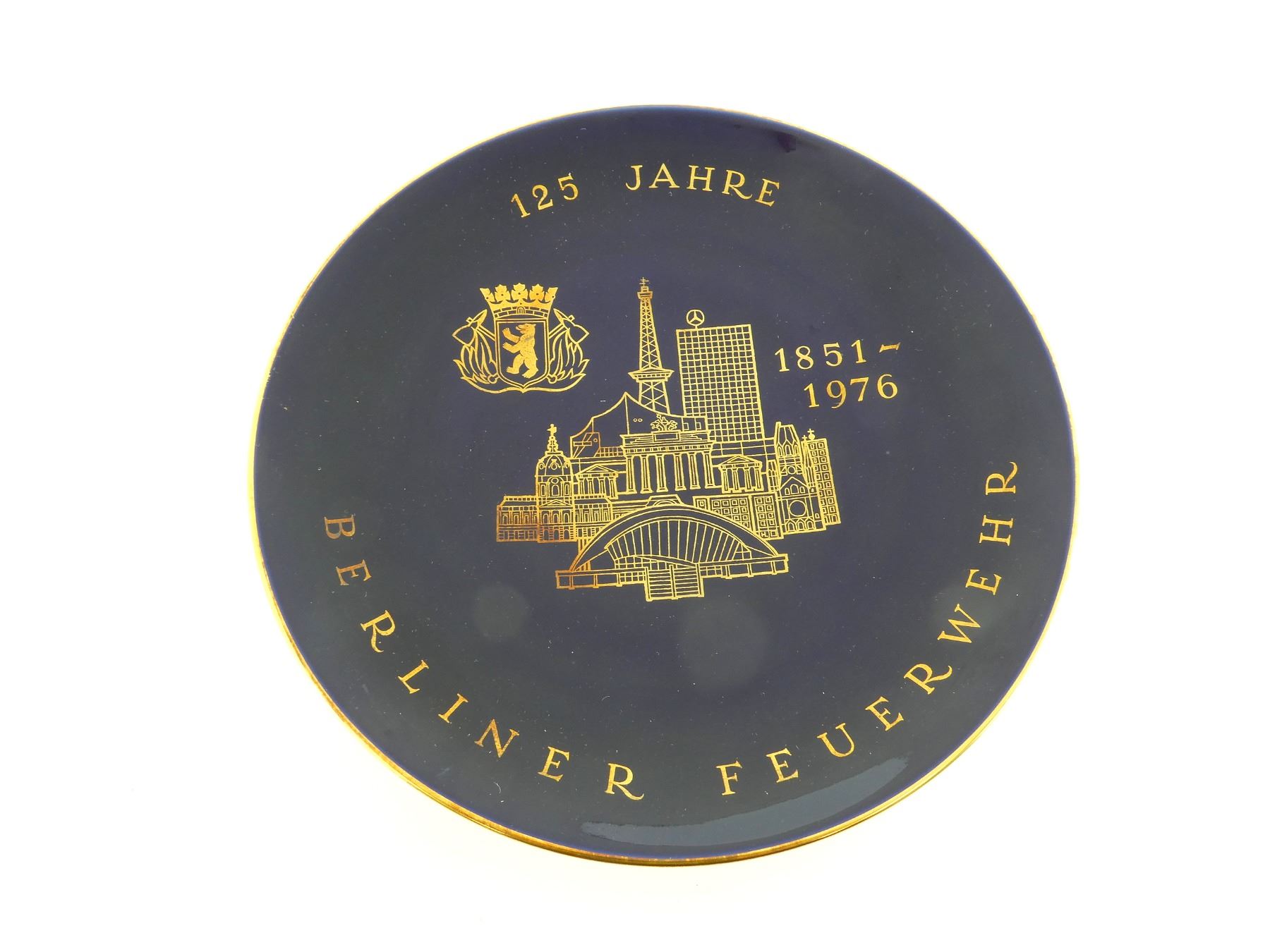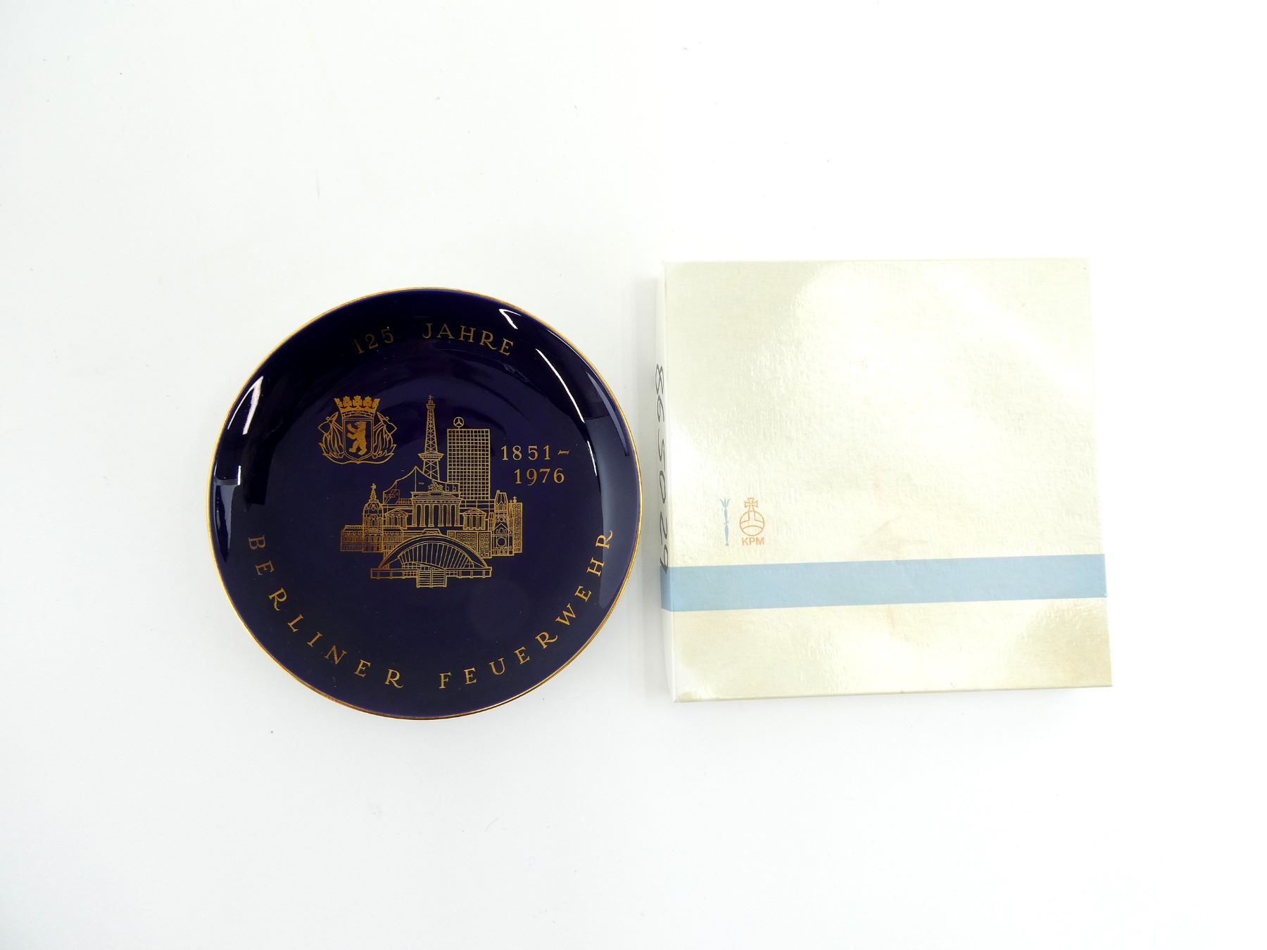 (1) COMMEMORATIVE PLATE FOR BERLIN FIRE BRIGADE, PLATE MARKED: "125 JAHRE, BERLINER FEUERWEHR, 1851-1979", ROYAL BLUE COLOURED PLATE WITH GOLD TRIM / WRITING / DESIGN, BACK MARKED: "GESTIFTET, DEUTSCHE KLASSENLOTTERIE BERLIN", "KPM, 1606" WITH MAKER'S MARK / STICKER, HOLE THROUGH BOTTOM LIP, POSSIBLY FOR HANGING, WITH ORIGINAL BOX, PLATE APPROX. 7.75" DIA. SEE PHOTOS.