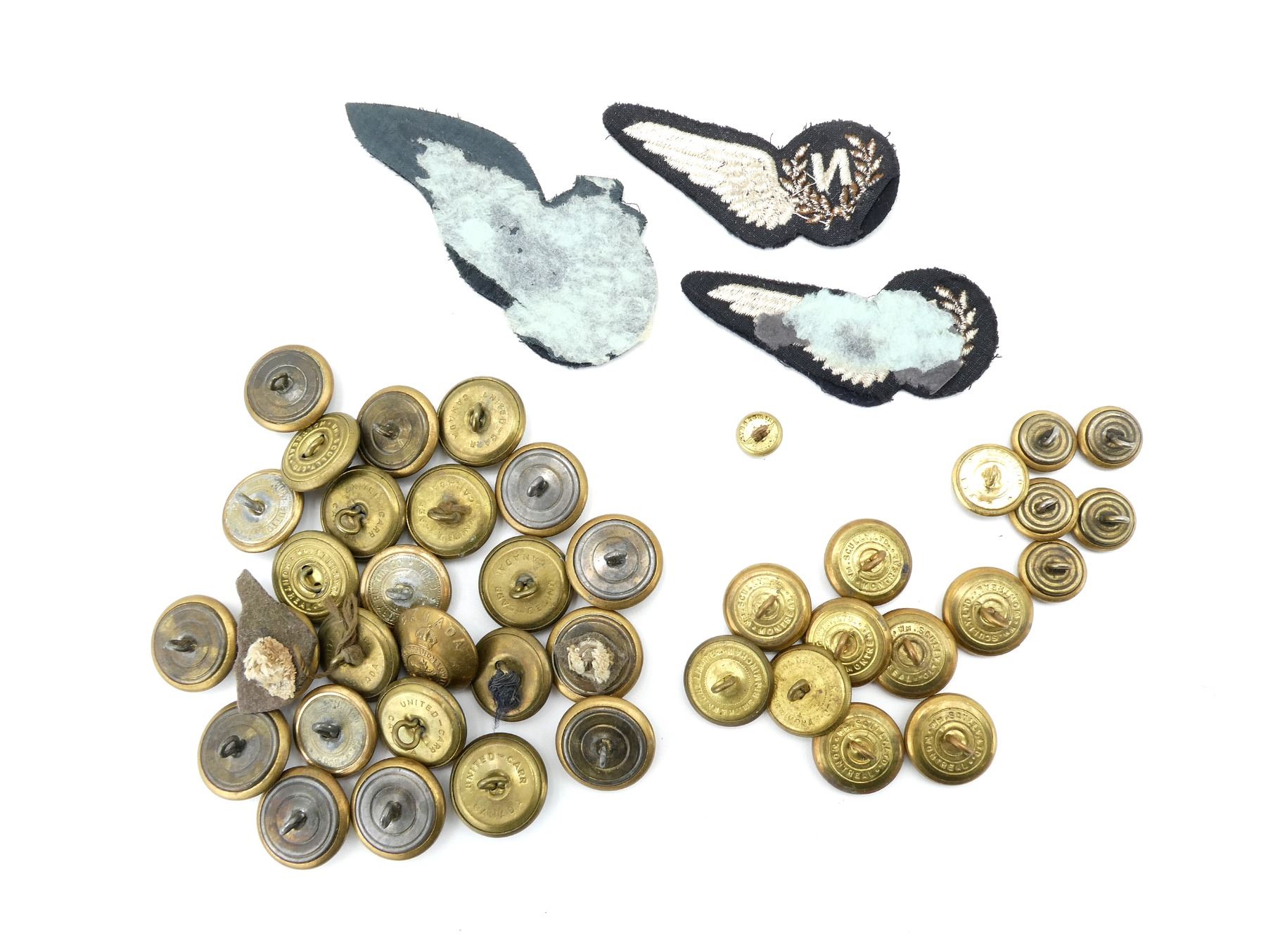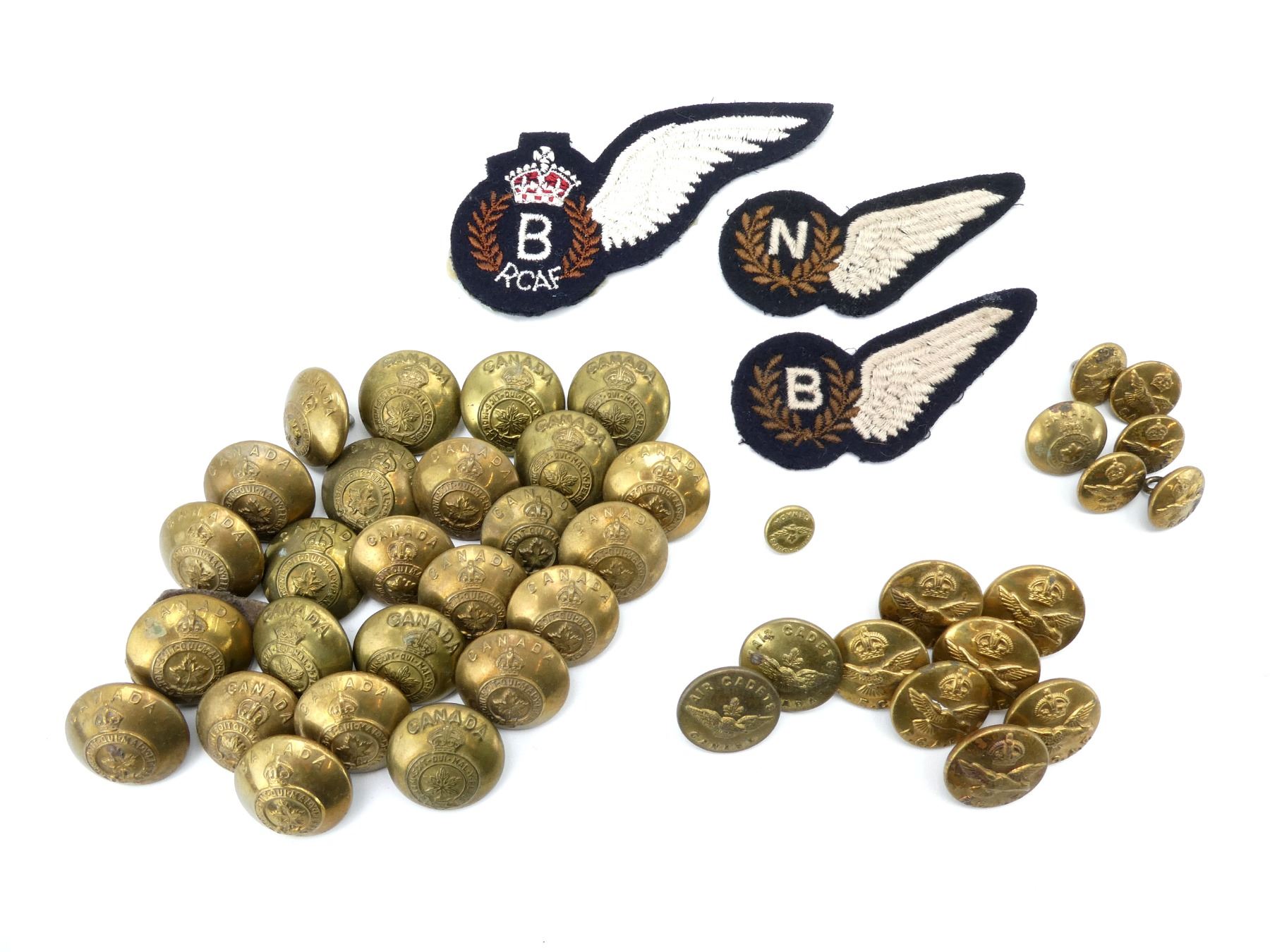 APPROX. (44) PIECES, KING'S CROWNS, VARIOUS SIZED BUTTONS, INCLUDES; CANADA GENERAL SERVICE BRASS BUTTONS, RCAF BRASS BUTTONS, CANADIAN AIR CADET BRASS BUTTONS, RCAF BOMBARDIER WING BADGE & RCAF NAVIGATOR WING BADGE. SEE PHOTOS.