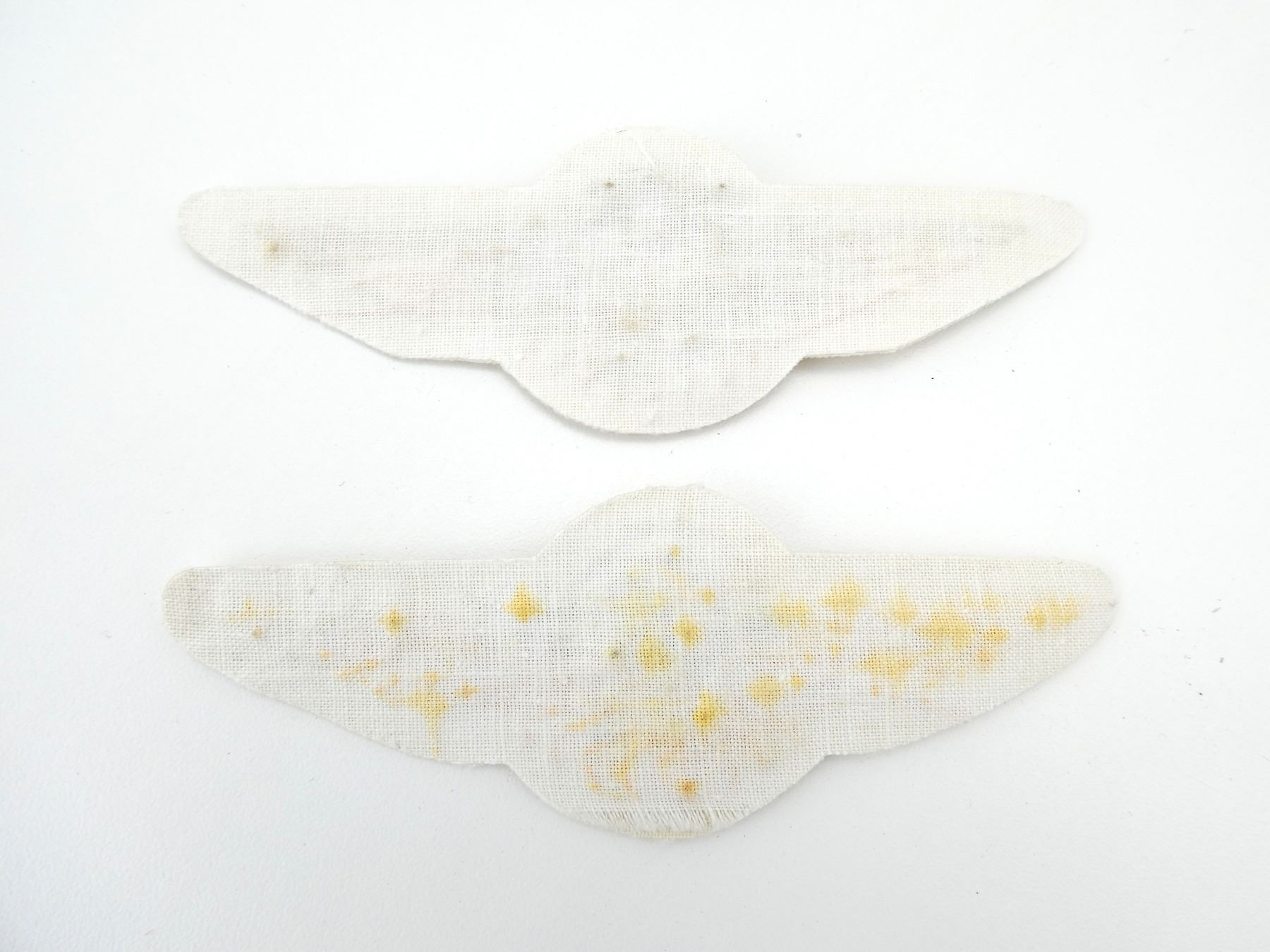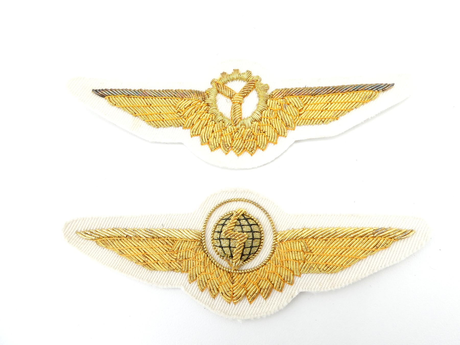 LOT INCLUDES; (2) MARINE FLIGHT WINGS FOR ENGINEERS & RADIO OPERATORS, WHITE CANVAS WITH GOLD COLOURED WIRE THREADING. SEE PHOTOS.