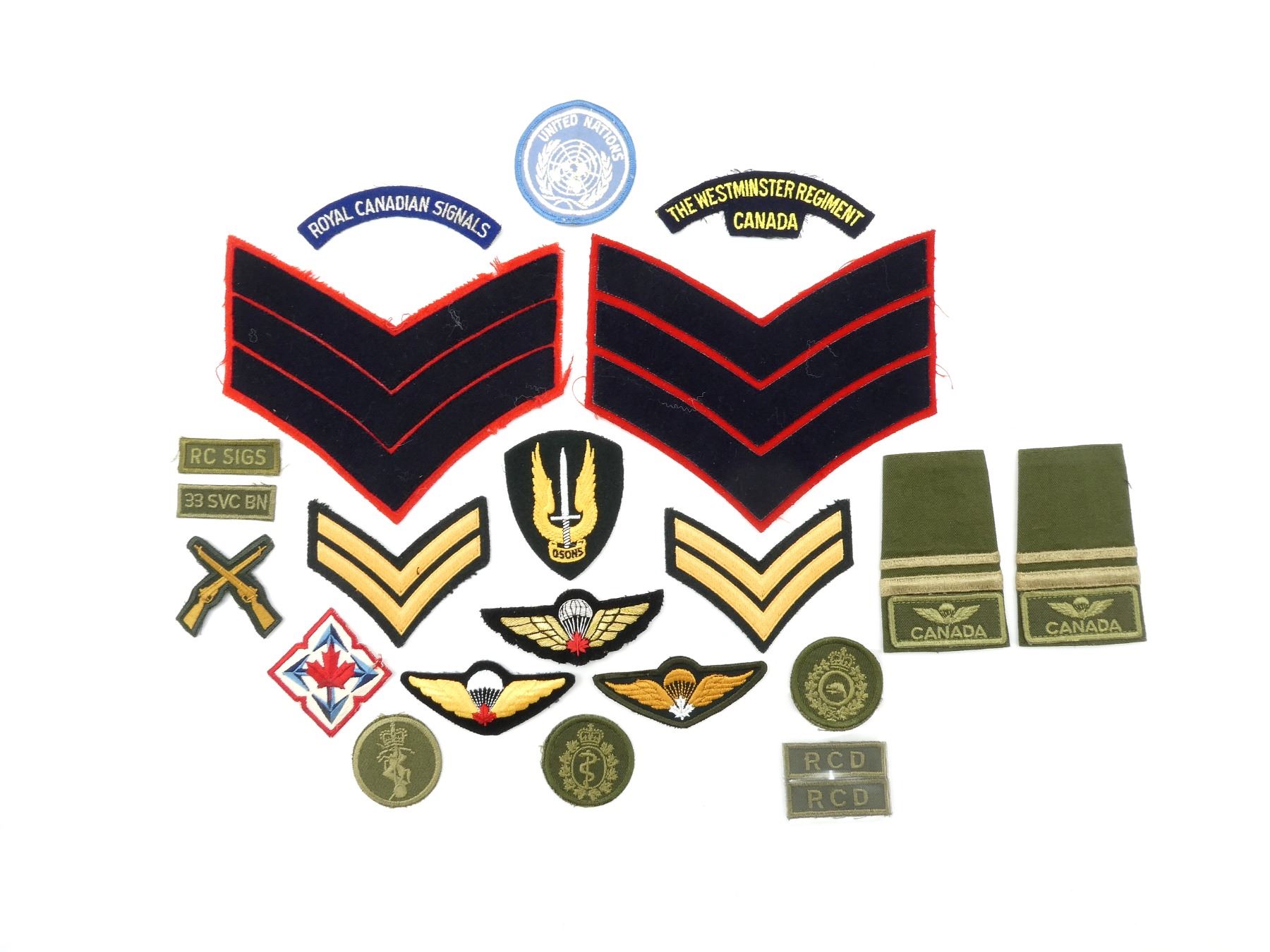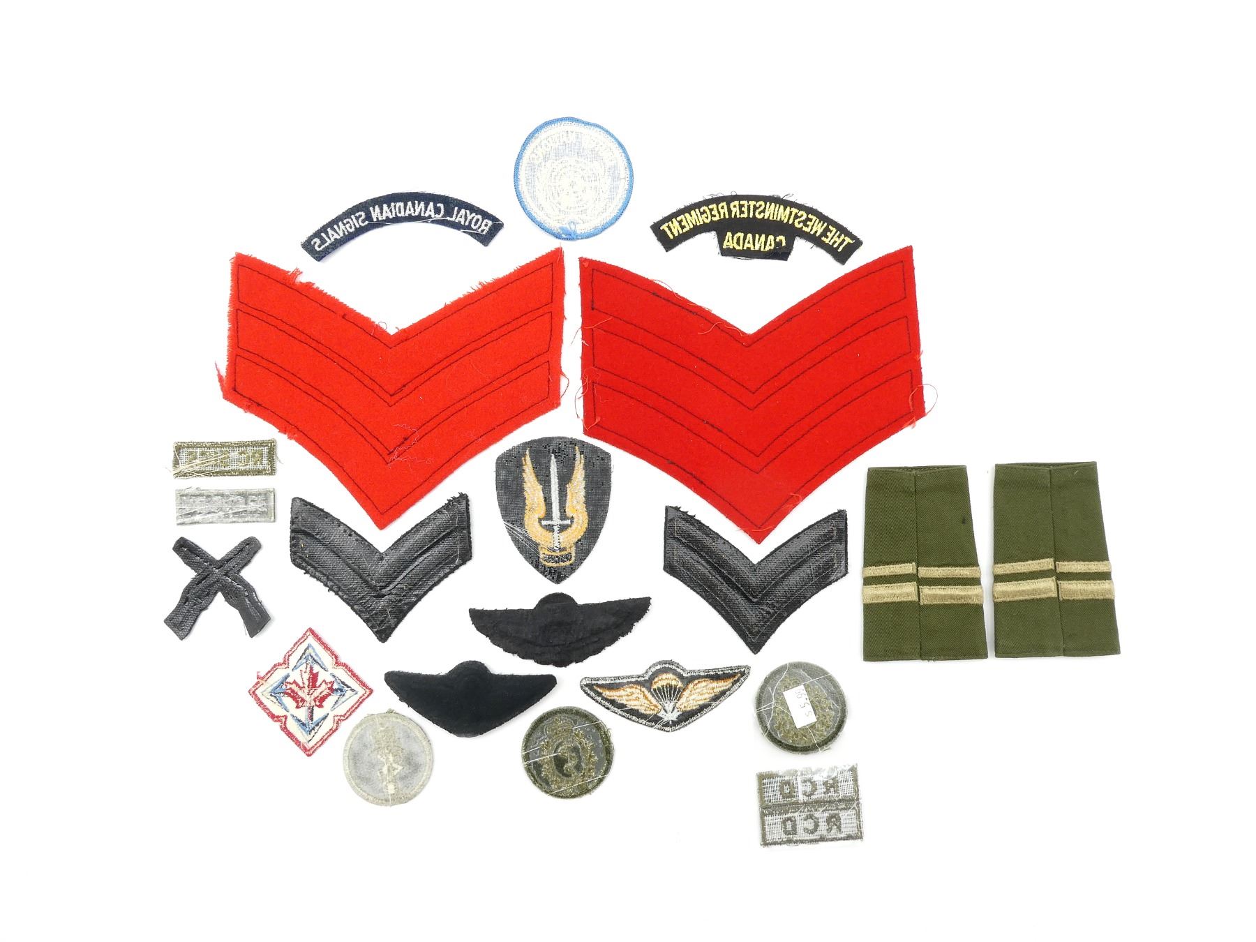 APPROX. (22) PIECES, VARIOUS SIZES / COLOURS, QUEEN'S CROWNS, INCLUDES; MOBILE COMMAND, RIFLE MARKSMANSHIP, UNITED NATIONS, PARATROOPER WINGS, ROYAL CANADIAN SIGNALS, MEDICAL CORPS, ENGINEERS, THE WESTMINISTER REGIMENT, PAIR OF LARGE SERGEANT RANK CHEVRONS FOR CANADIAN GUARDS GREAT COAT, ETC. SEE PHOTOS.